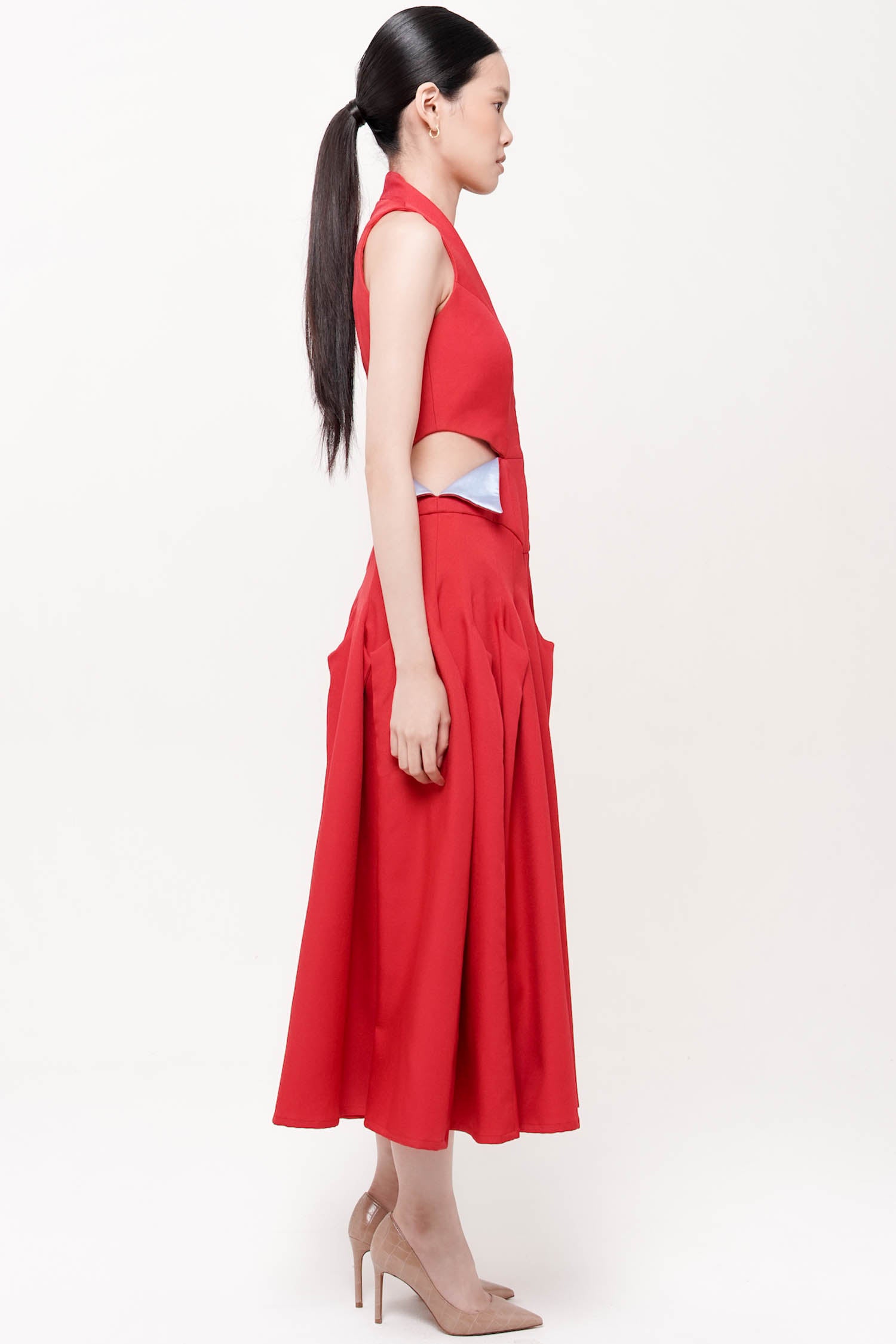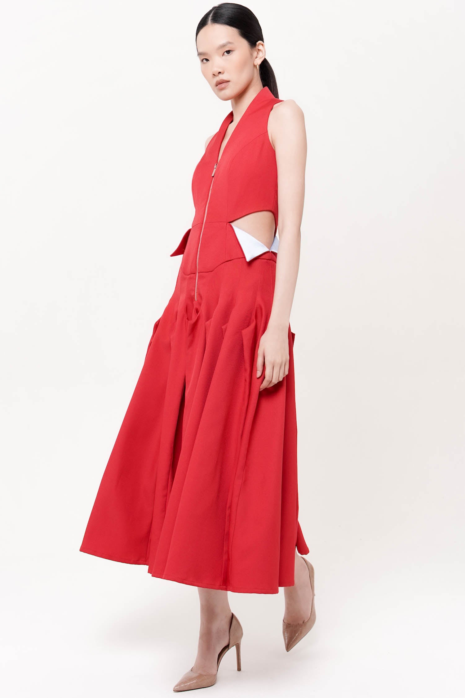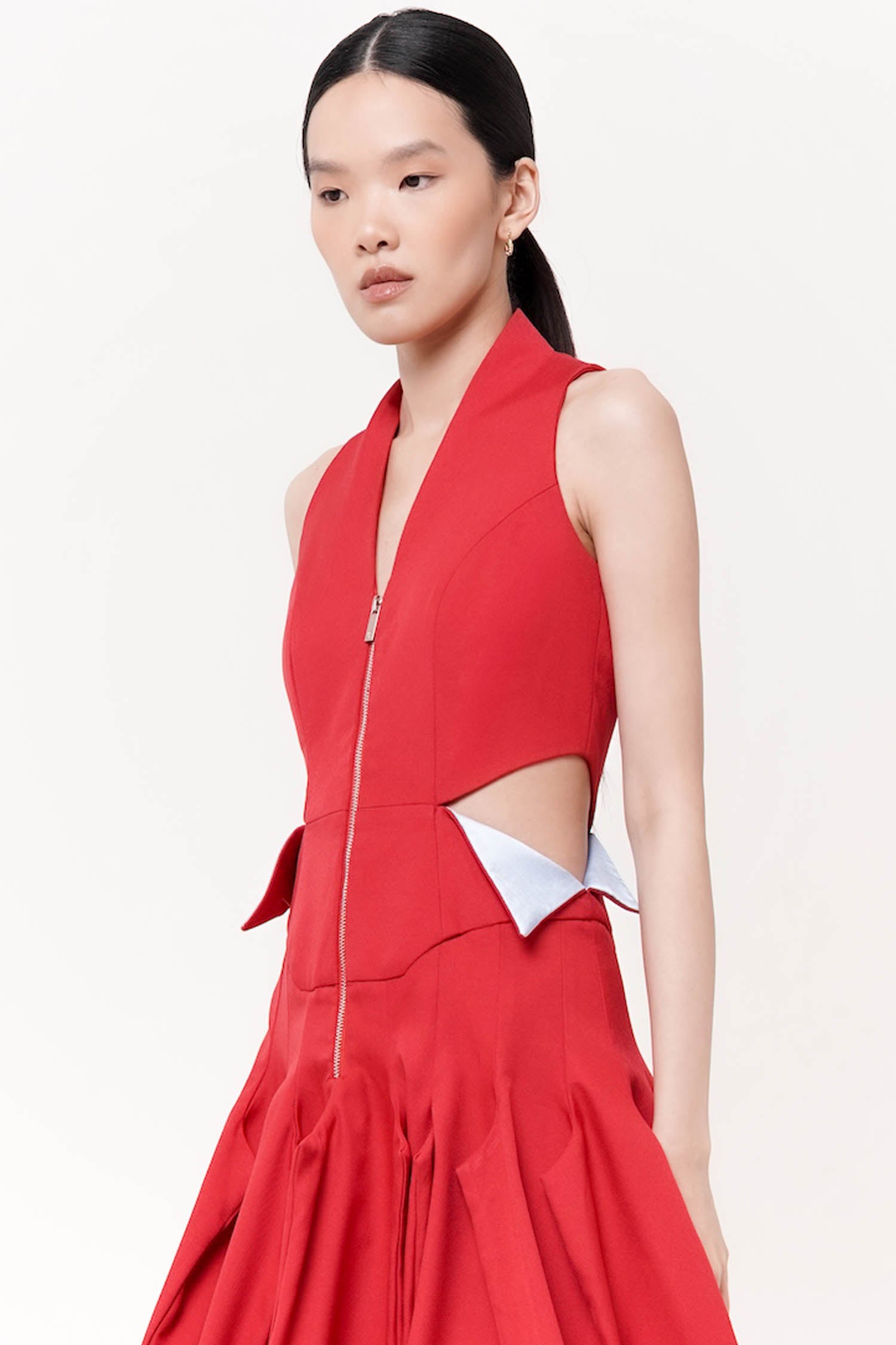 Featuring a V-neck and sleeveless silhouette, this dress offers a flattering fit. The cutout at the waist adds a modern edge, while contrast-colored fold details enhance visual interest. Innovative 3D panels extend from hips to hem, creating dynamic shape and movement.