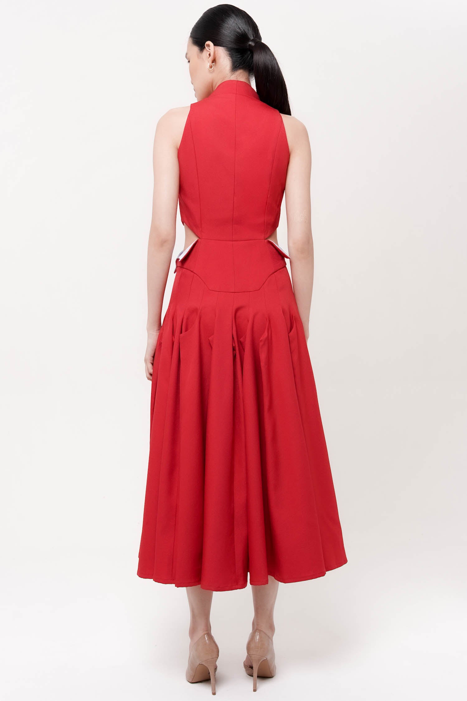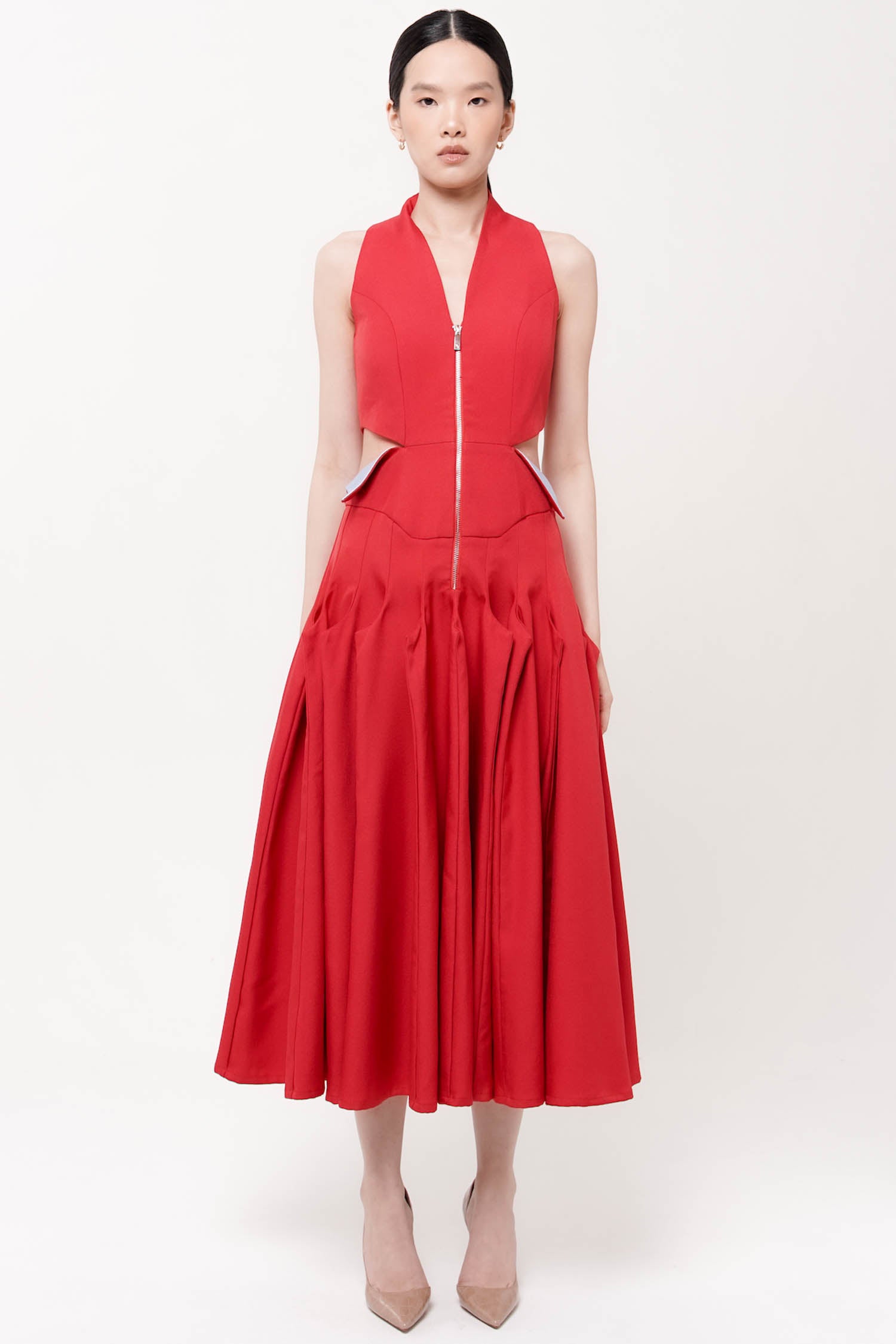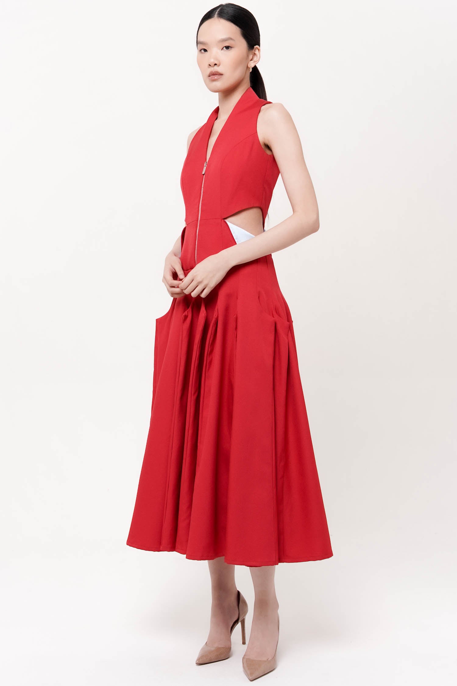 Featuring a V-neck and sleeveless silhouette, this dress offers a flattering fit. The cutout at the waist adds a modern edge, while contrast-colored fold details enhance visual interest. Innovative 3D panels extend from hips to hem, creating dynamic shape and movement.