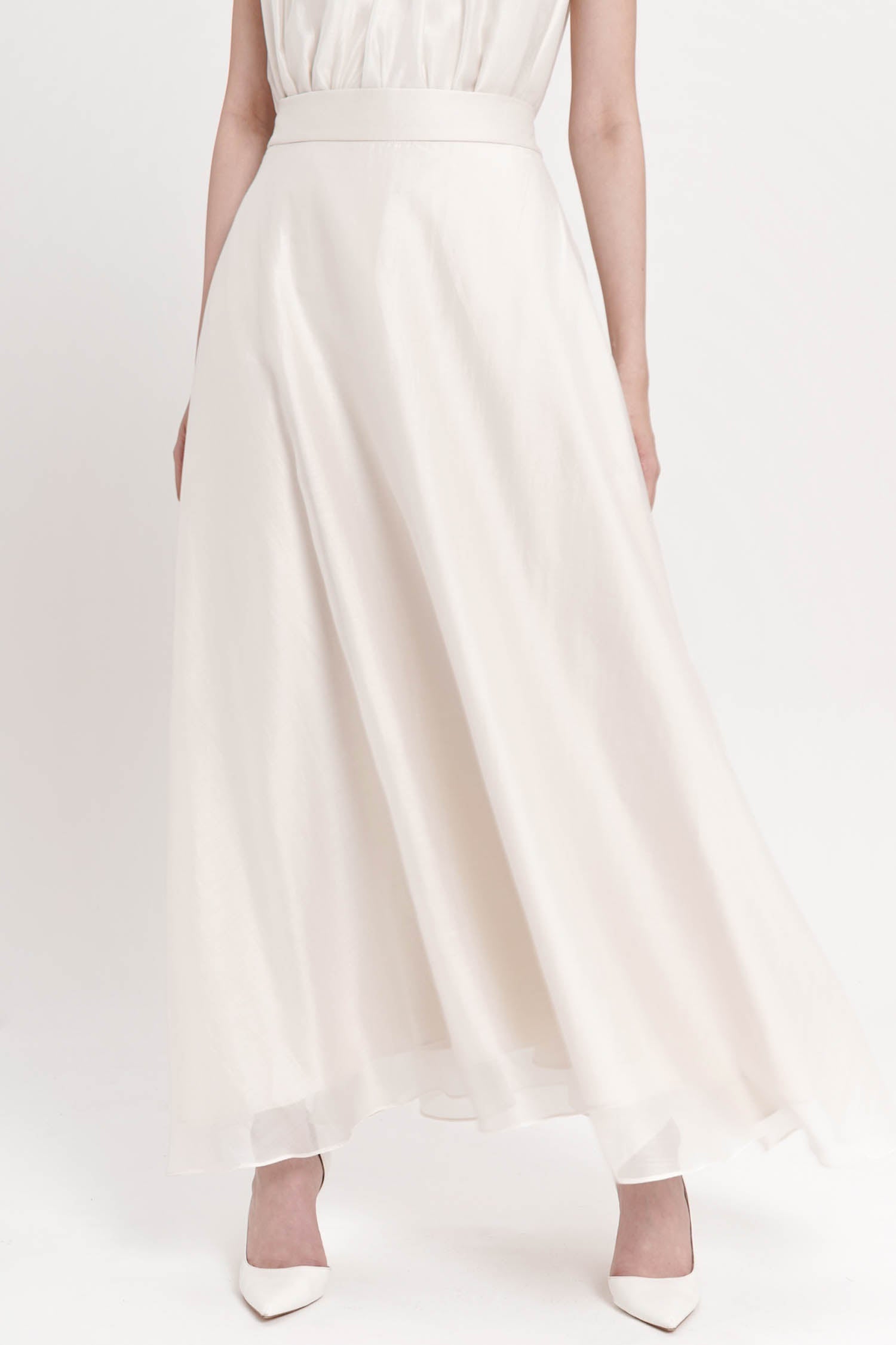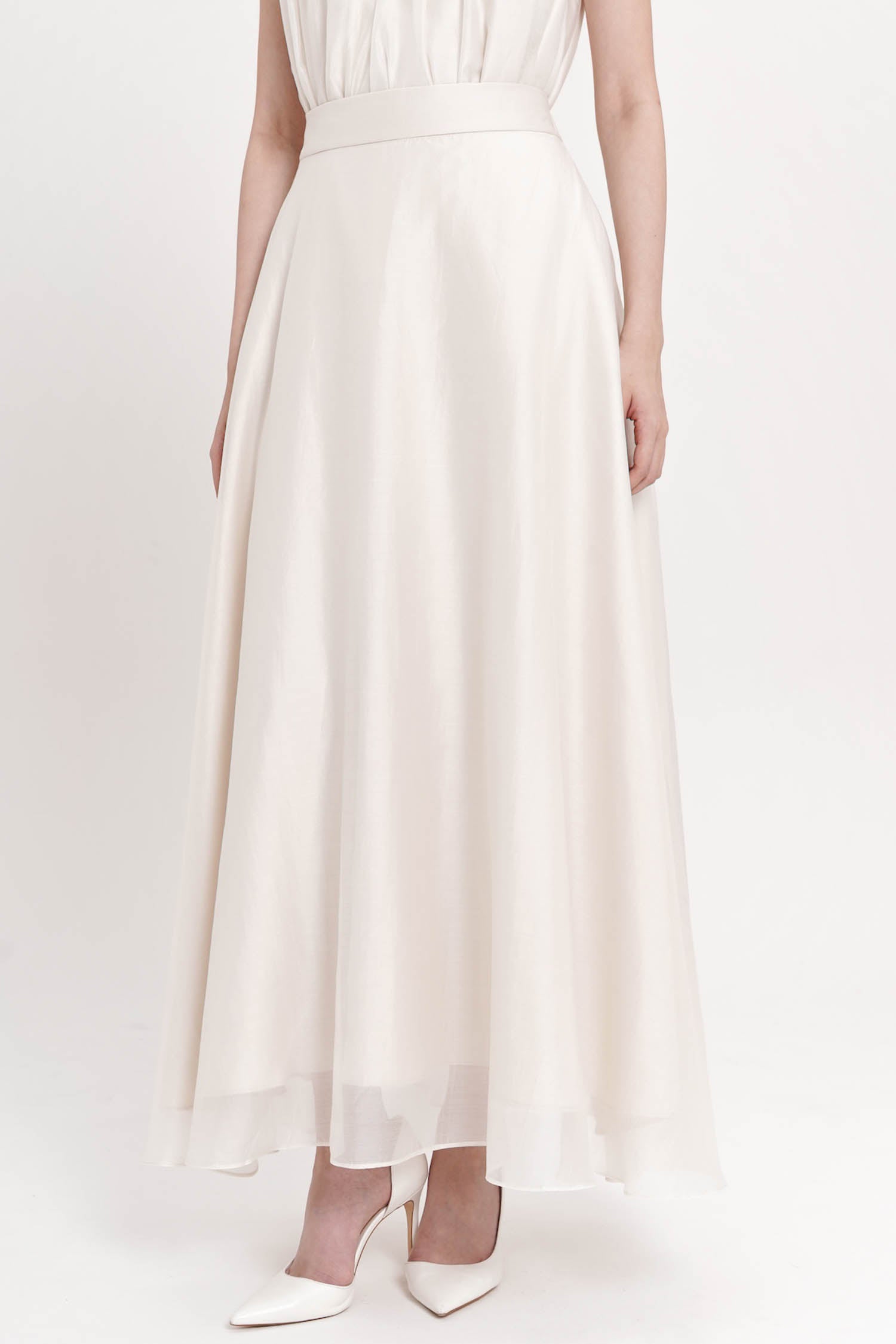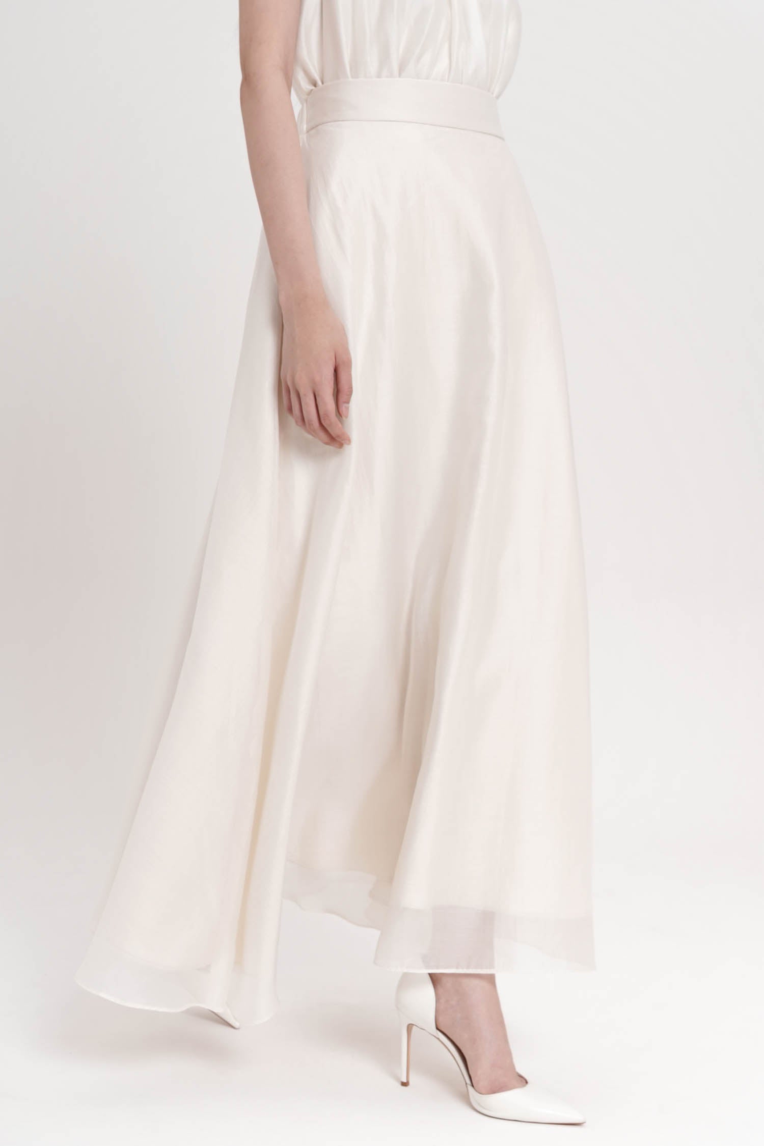The Beaufort Skirt is a study in graceful fluidity, tailored from delicate polyester that glides with every step. Its full-length silhouette flows softly to the floor, creating an elegant, elongated line that moves effortlessly between formal and relaxed refinement. The waistband offers subtle structure, while the fabric’s natural sheen enhances its romantic drape. Poised and timeless, the Beaufort Skirt pairs seamlessly with its matching top or stands alone as a sophisticated statement piece. Available in Porcelain and Navy.