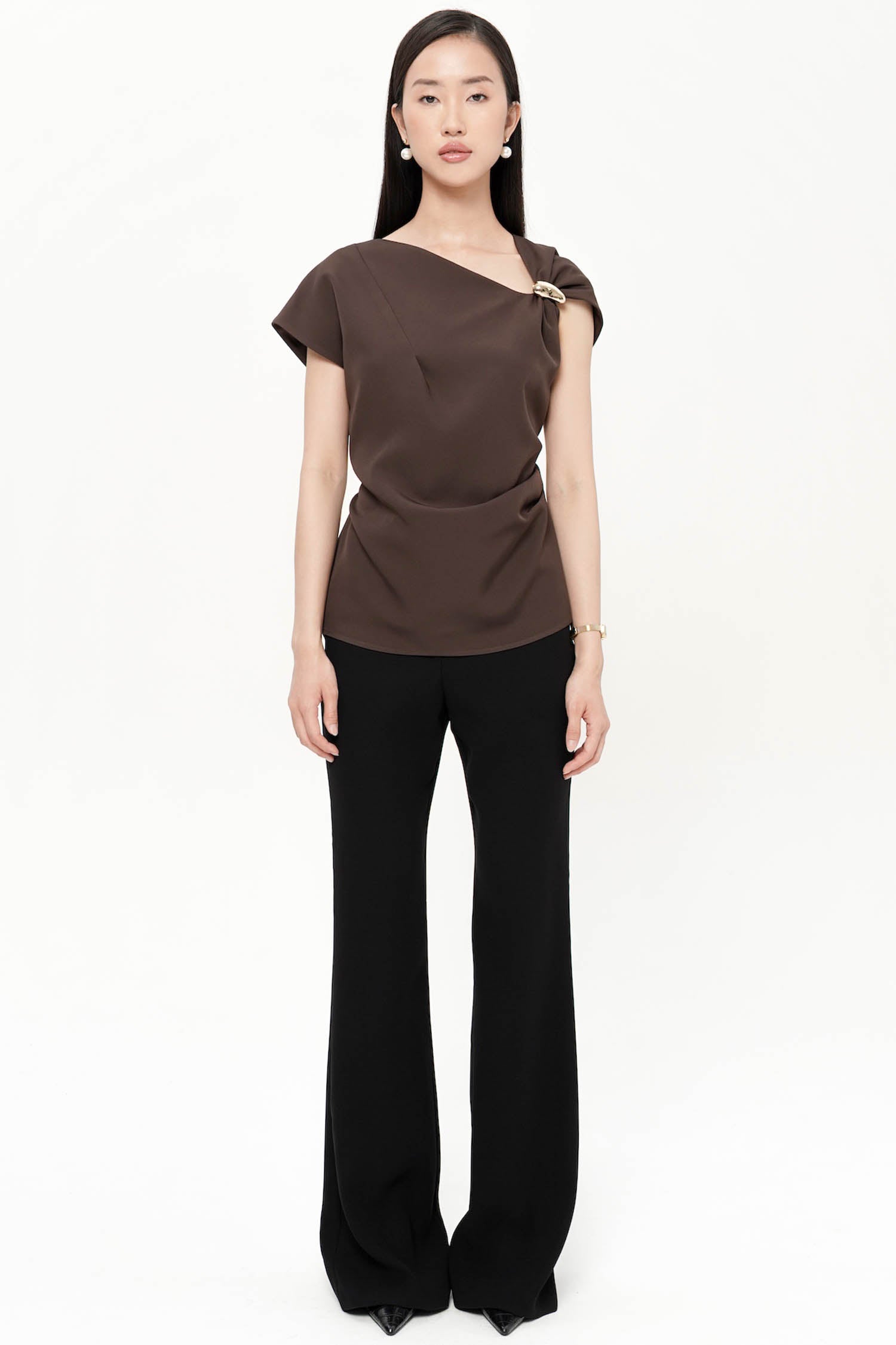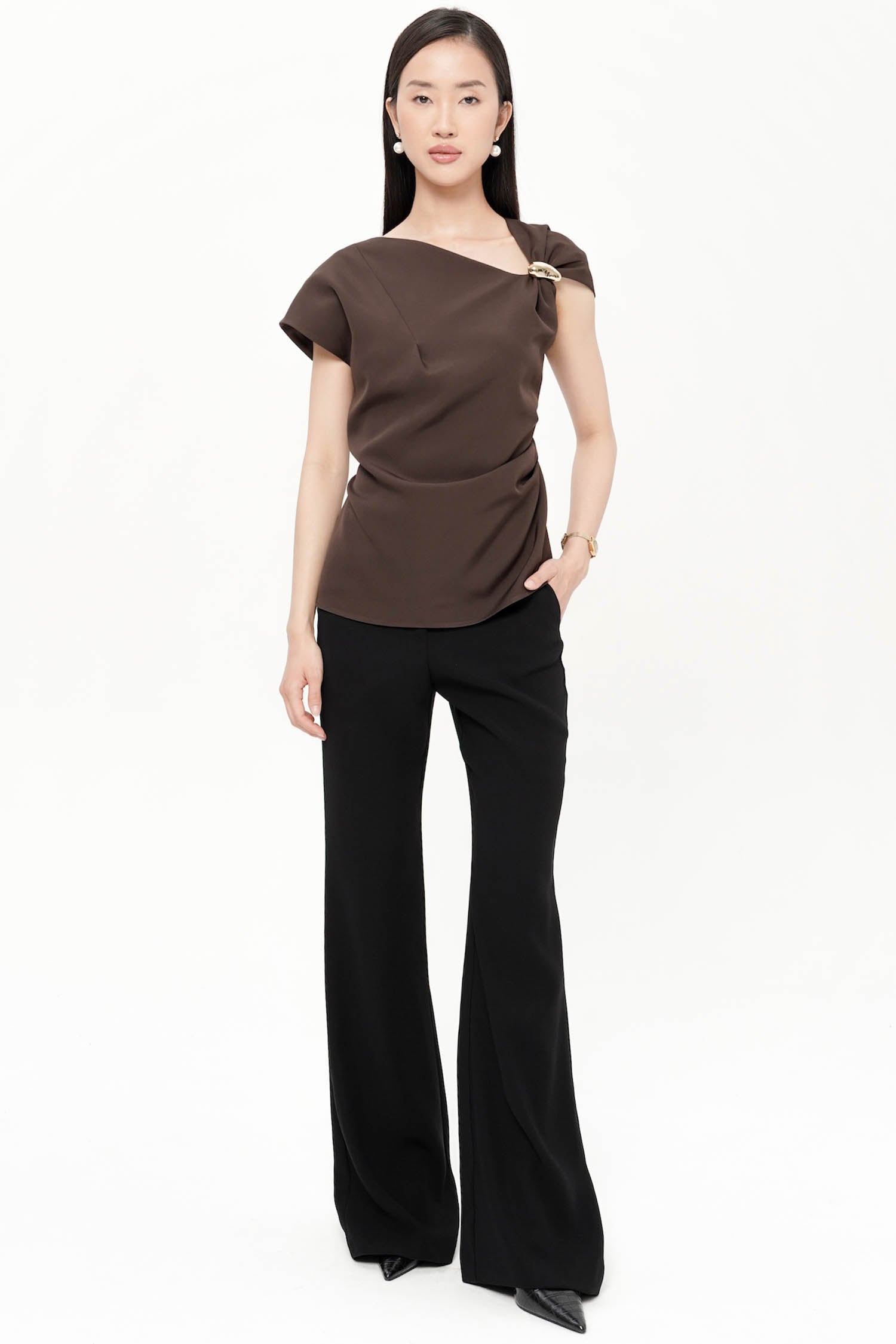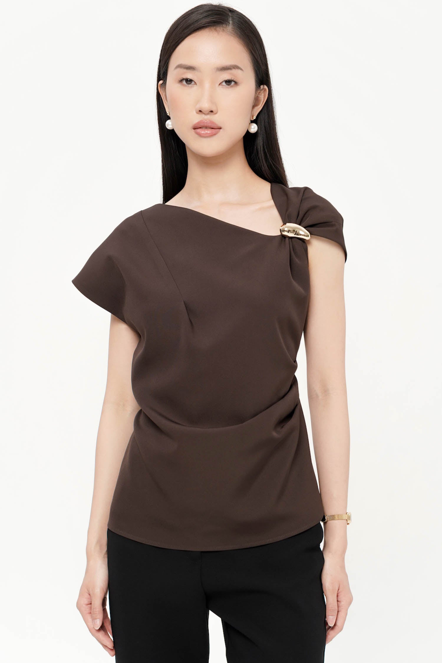The Bracken Asymmetrical top is a study in modern elegance, where clean tailoring meets artful design. Crafted from smooth, structured polyester, it features a striking asymmetrical neckline accented with a subtle metallic detail that lends a refined focal point. The softly contoured silhouette drapes gracefully along the body, while the cinched waist with an adjustable back tie creates a flattering, defined shape without compromising comfort. Cap sleeves add a polished finish, making it equally suited for professional settings or elevated casual wear. Available in rich espresso and timeless broken white, this piece offers a versatile yet distinctive addition to a thoughtfully curated wardrobe.