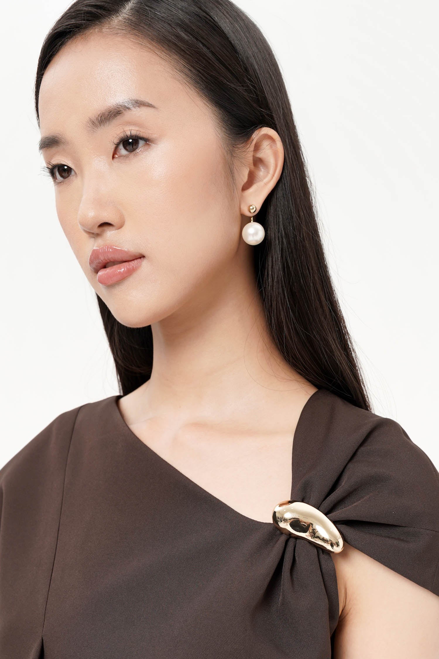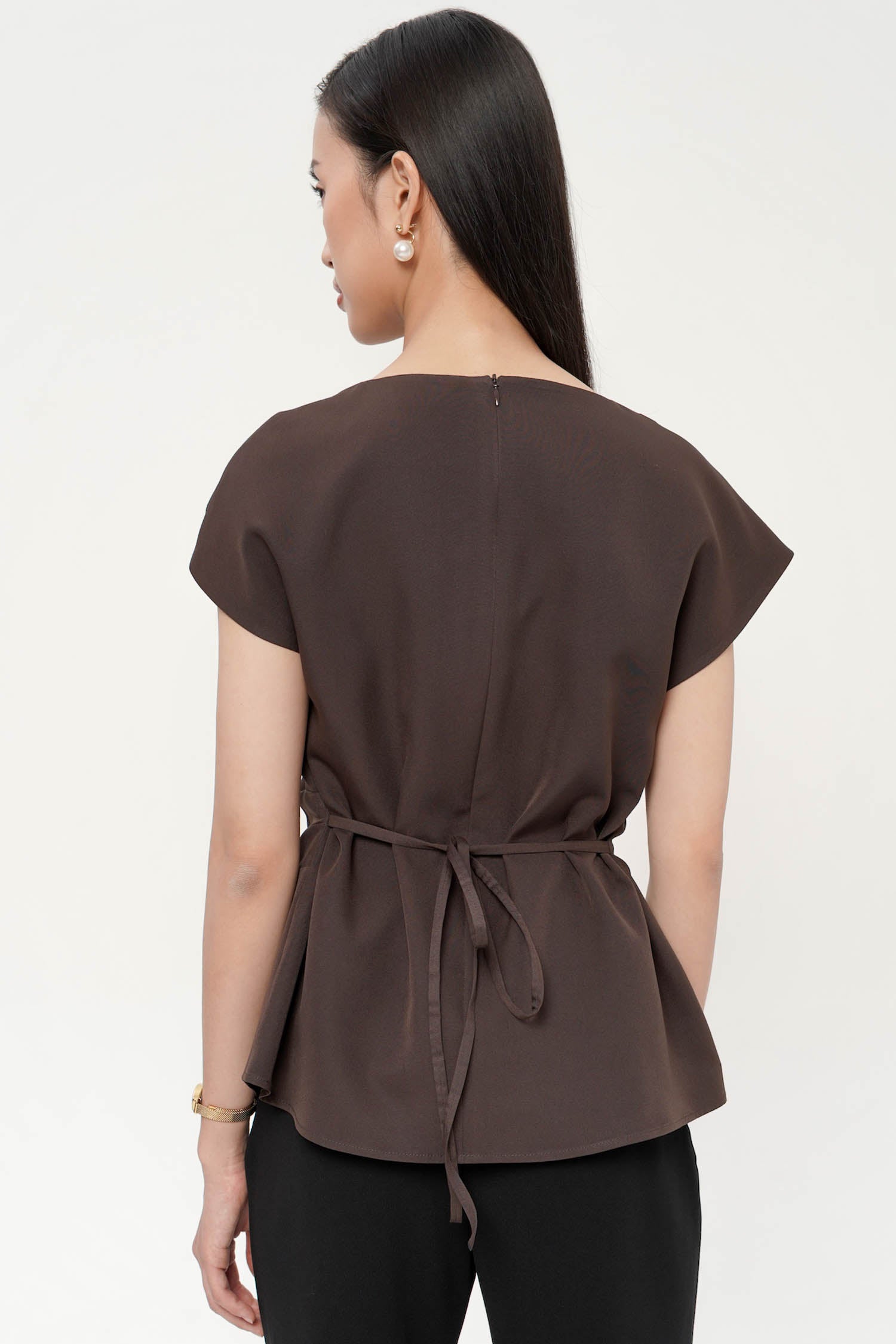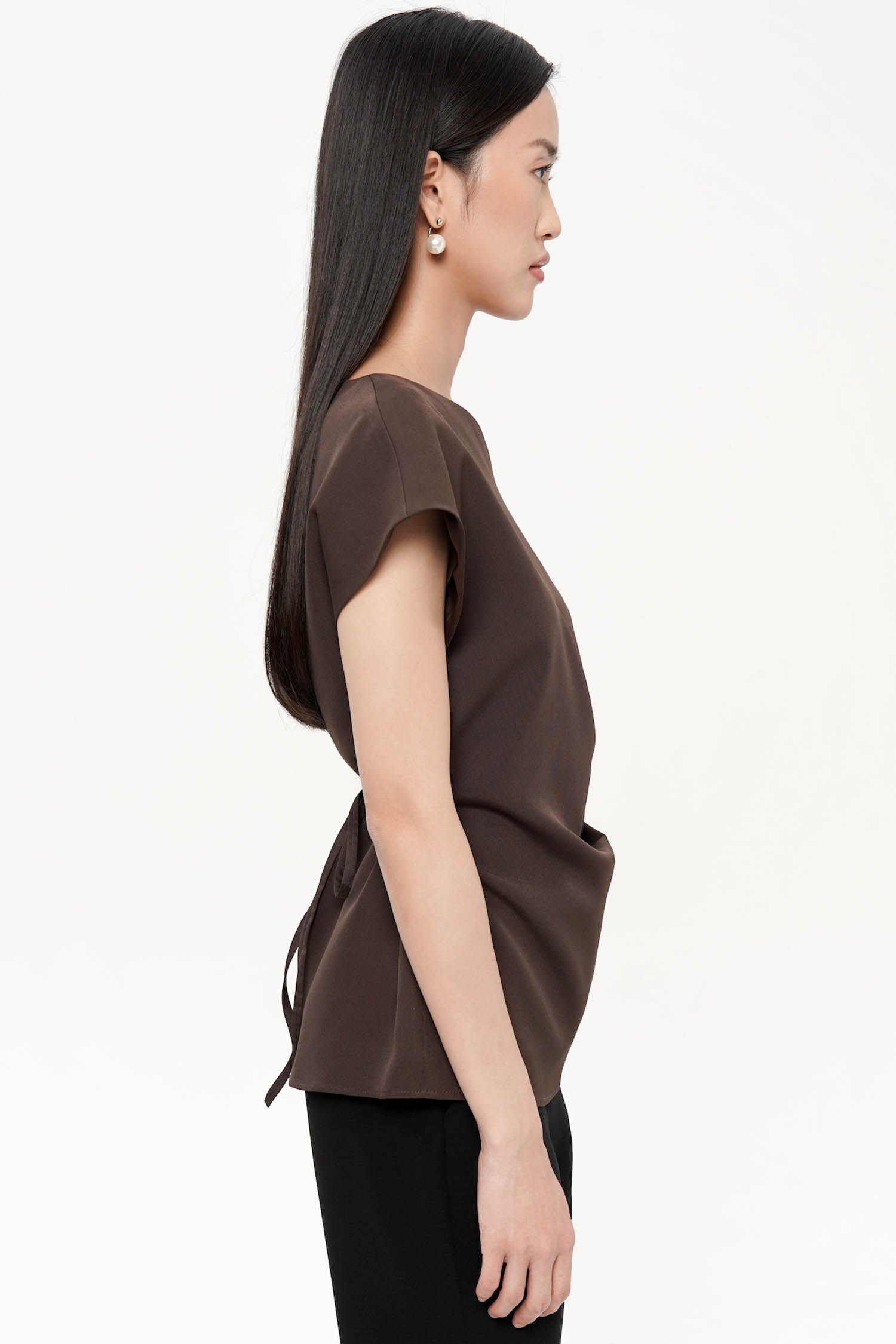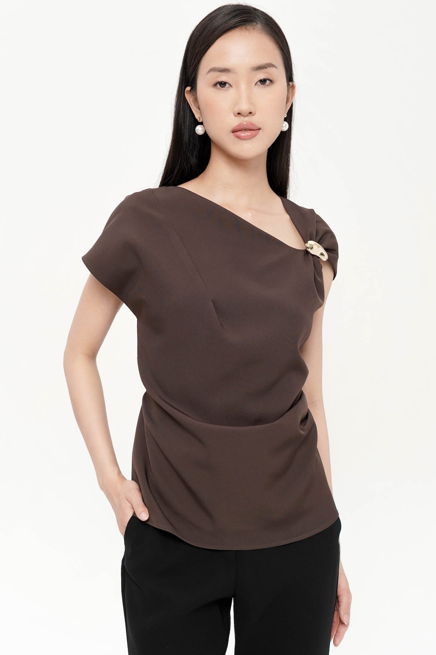 The Bracken Asymmetrical top is a study in modern elegance, where clean tailoring meets artful design. Crafted from smooth, structured polyester, it features a striking asymmetrical neckline accented with a subtle metallic detail that lends a refined focal point. The softly contoured silhouette drapes gracefully along the body, while the cinched waist with an adjustable back tie creates a flattering, defined shape without compromising comfort. Cap sleeves add a polished finish, making it equally suited for professional settings or elevated casual wear. Available in rich espresso and timeless broken white, this piece offers a versatile yet distinctive addition to a thoughtfully curated wardrobe.