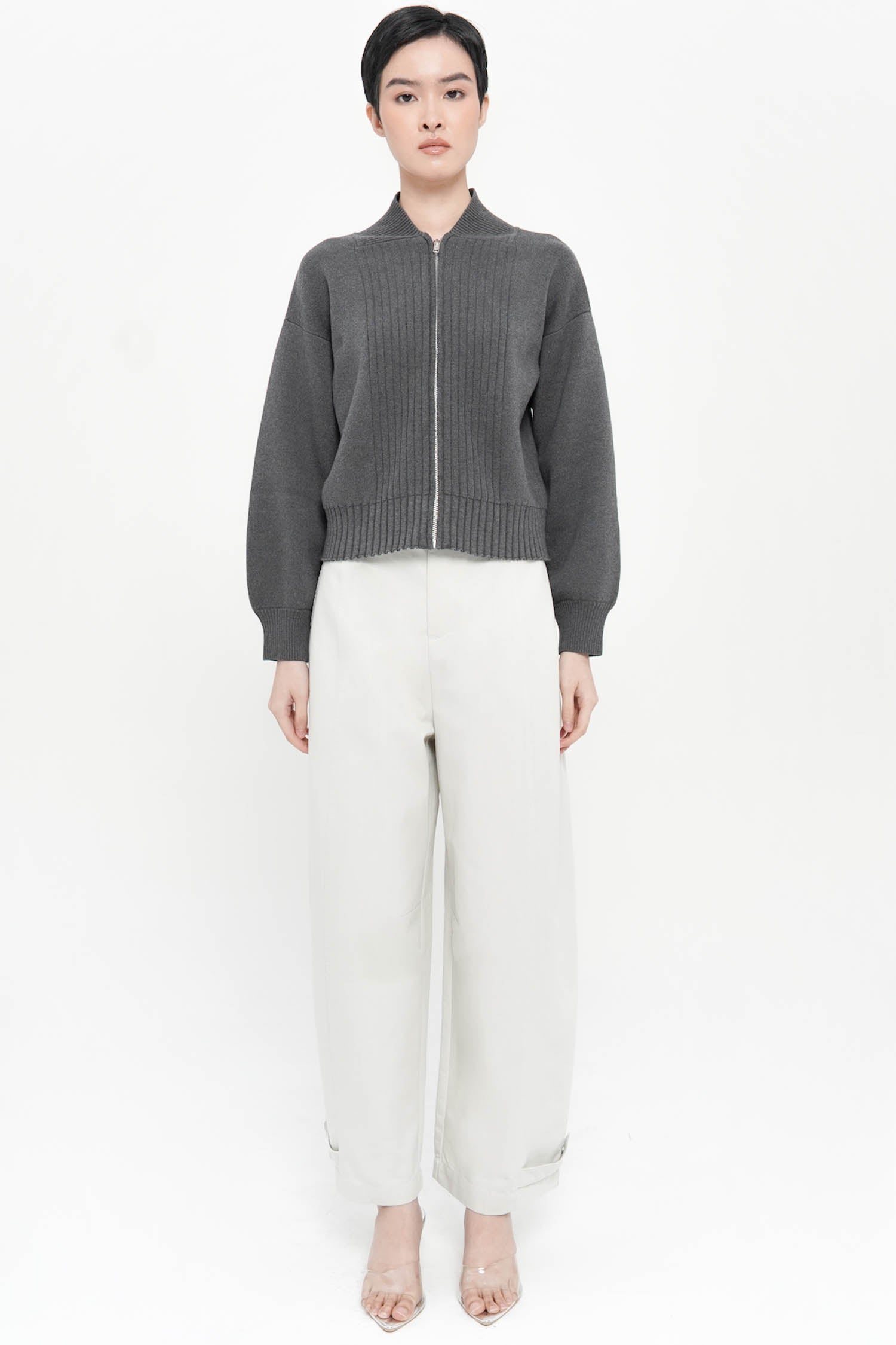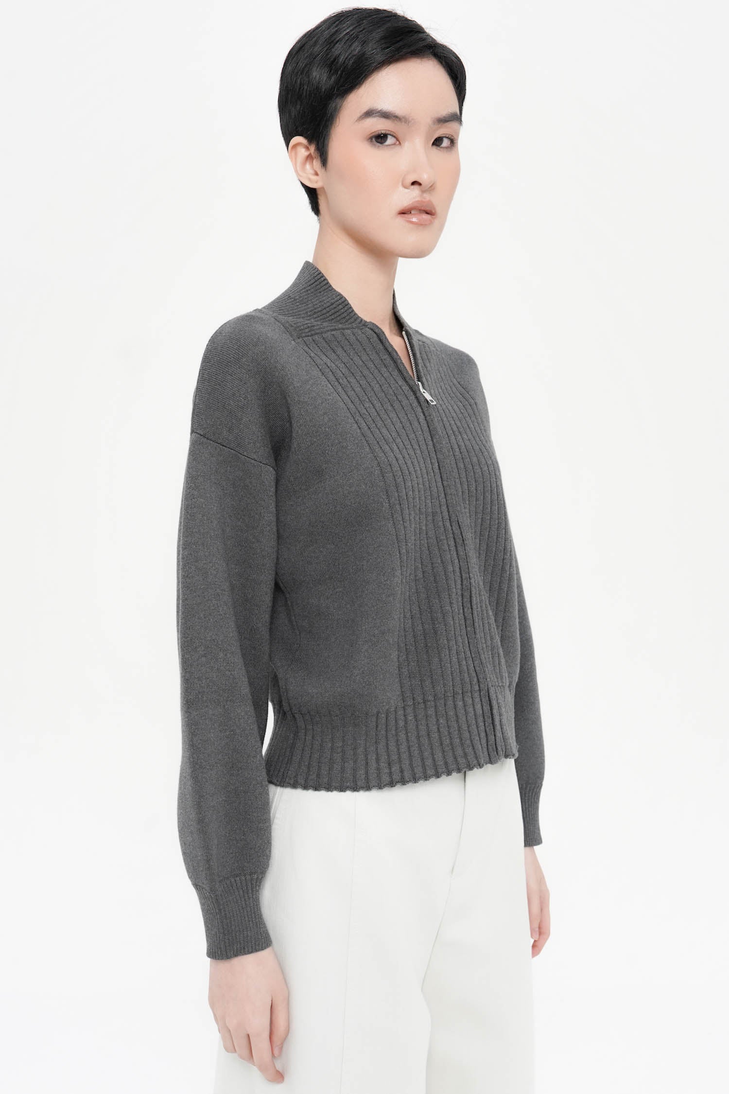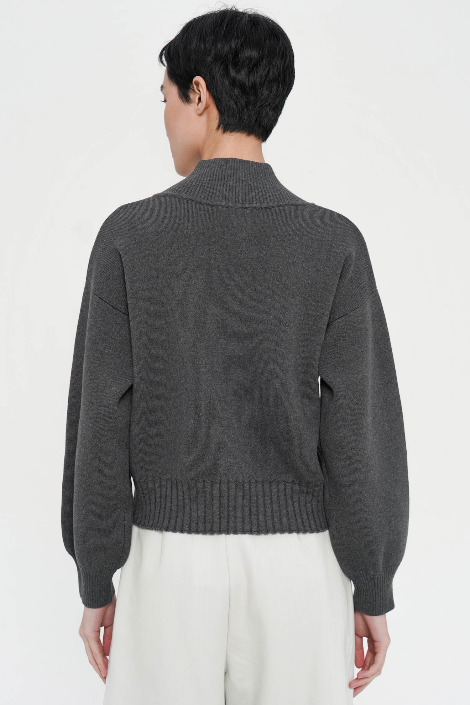 The Cyon Puff-sleeve Cardi is a refined knit essential crafted from soft cotton, featuring gently structured puff sleeves and a clean zip-front closure that lends a contemporary polish. Its ribbed detailing adds elegant texture, while the relaxed silhouette drapes effortlessly for elevated everyday wear. Available in Oat, Espresso, and Grey.