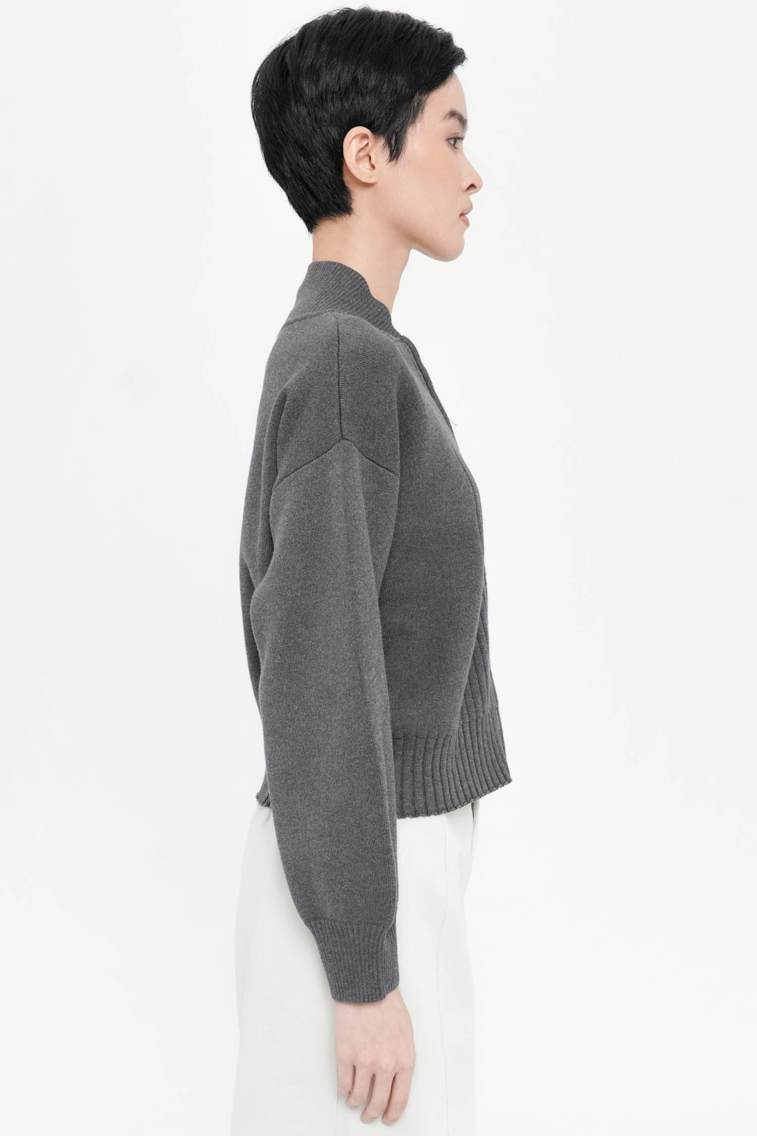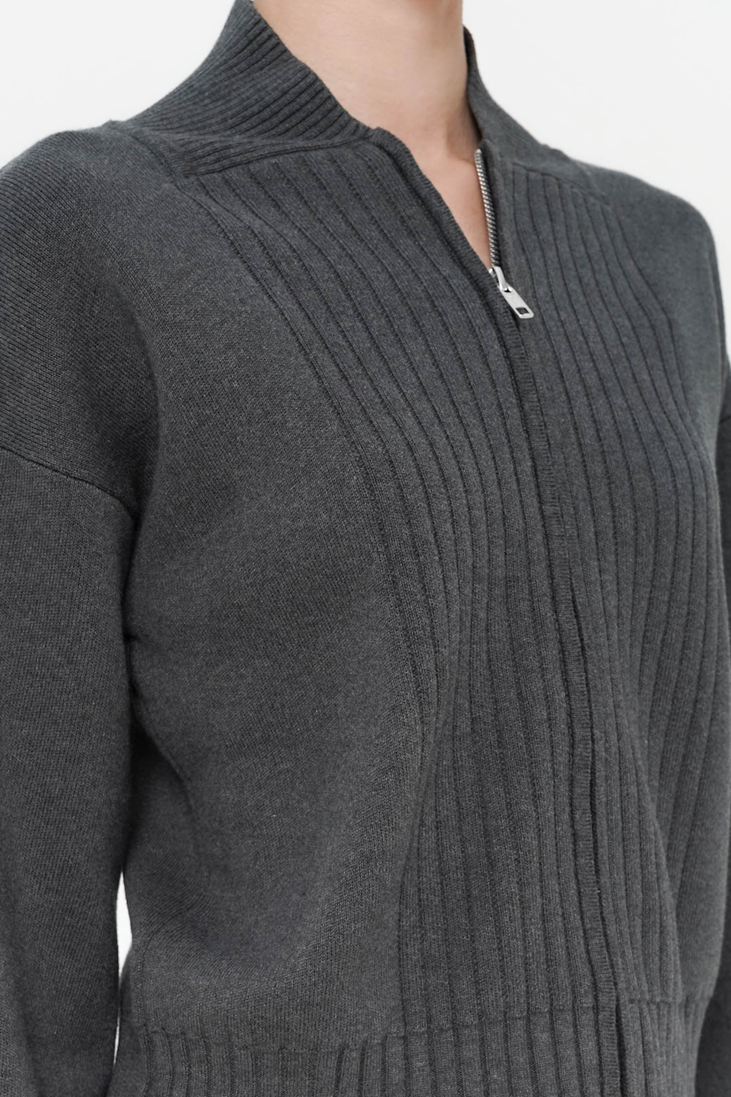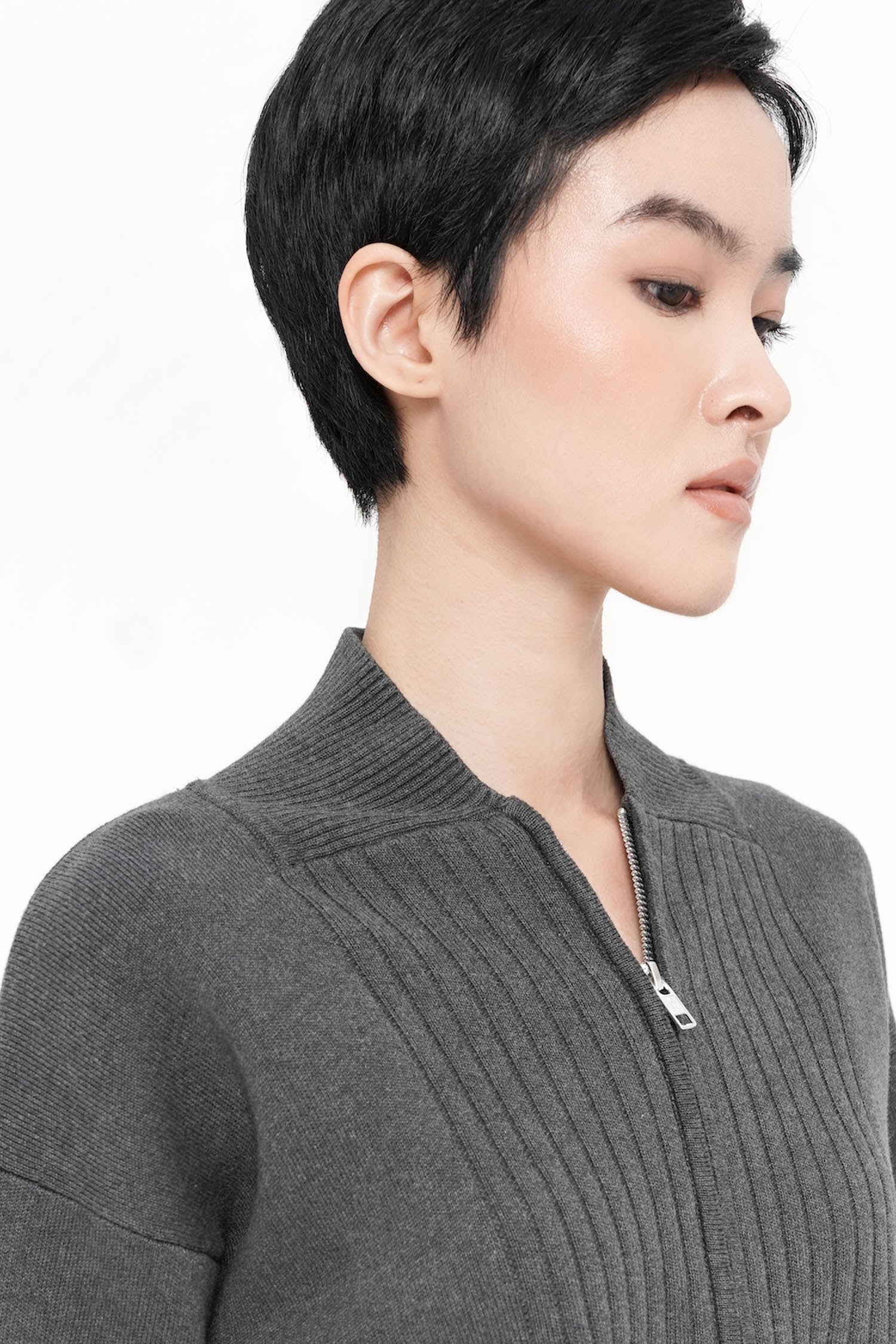 The Cyon Puff-sleeve Cardi is a refined knit essential crafted from soft cotton, featuring gently structured puff sleeves and a clean zip-front closure that lends a contemporary polish. Its ribbed detailing adds elegant texture, while the relaxed silhouette drapes effortlessly for elevated everyday wear. Available in Oat, Espresso, and Grey.