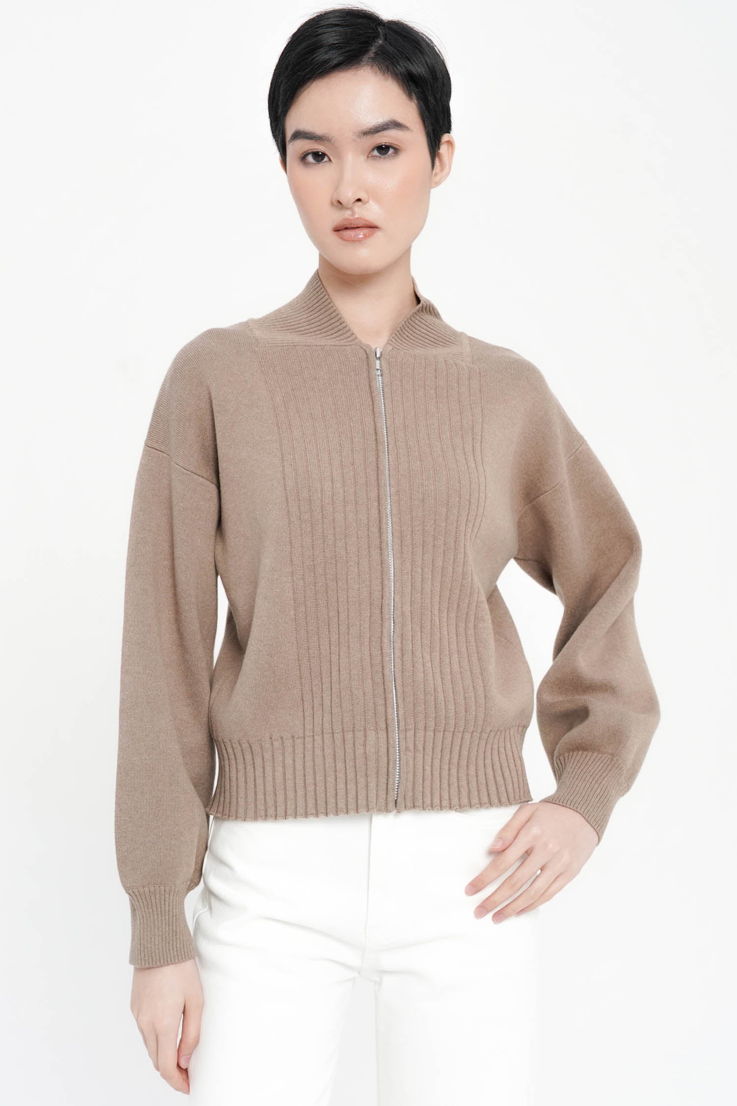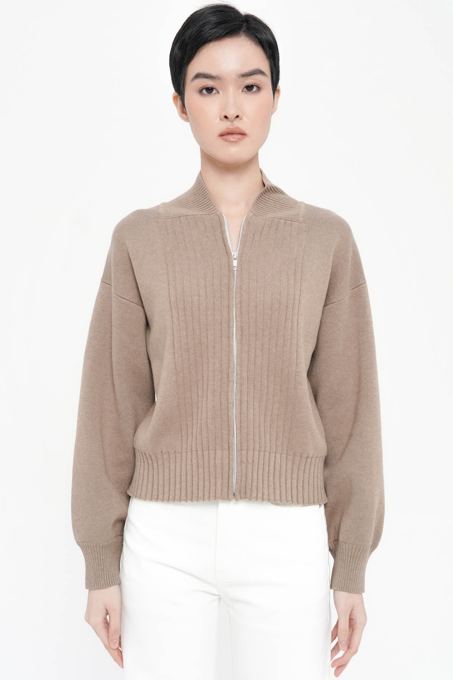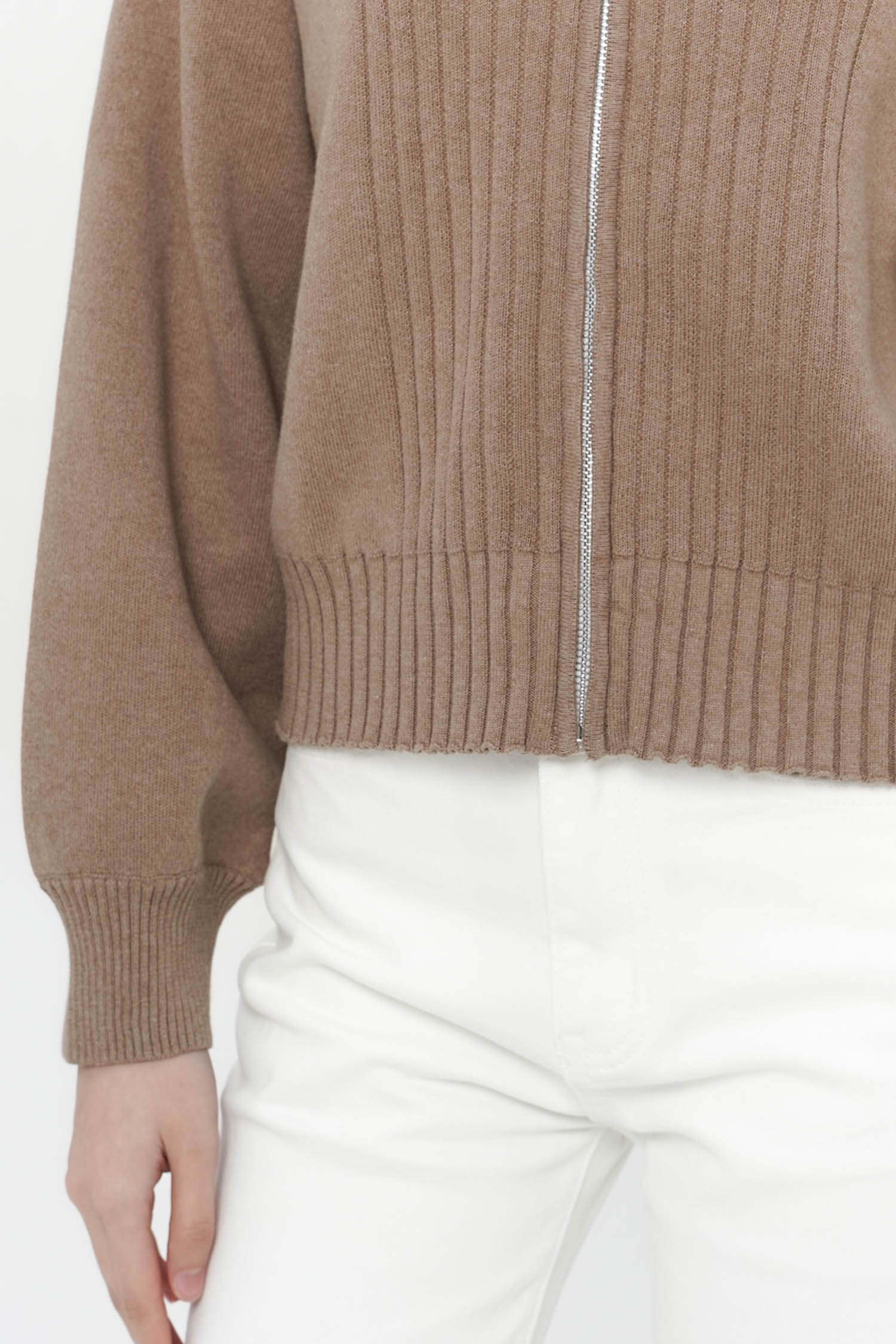 The Cyon Puff-sleeve Cardi is a refined knit essential crafted from soft cotton, featuring gently structured puff sleeves and a clean zip-front closure that lends a contemporary polish. Its ribbed detailing adds elegant texture, while the relaxed silhouette drapes effortlessly for elevated everyday wear. Available in Oat, Espresso, and Grey.