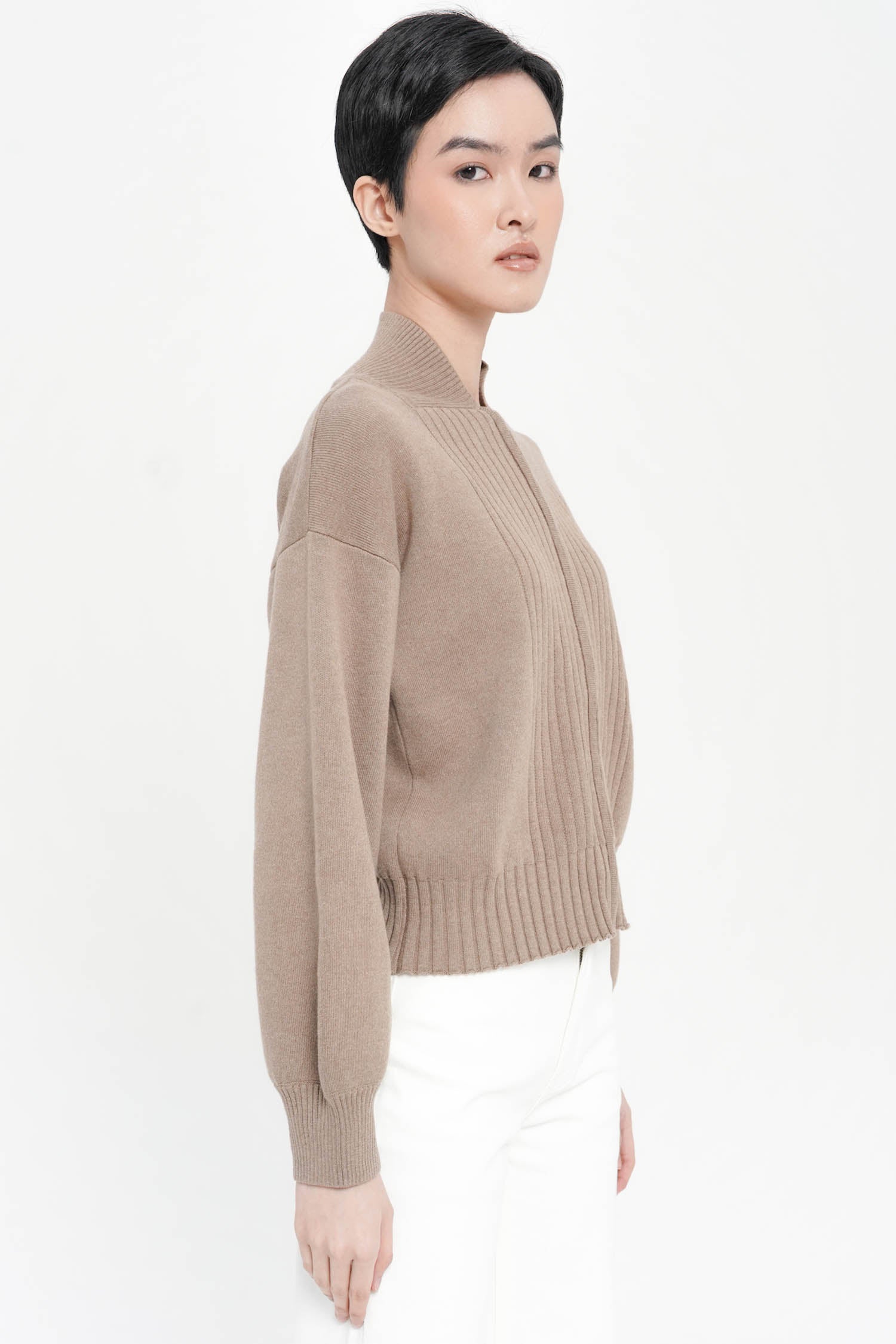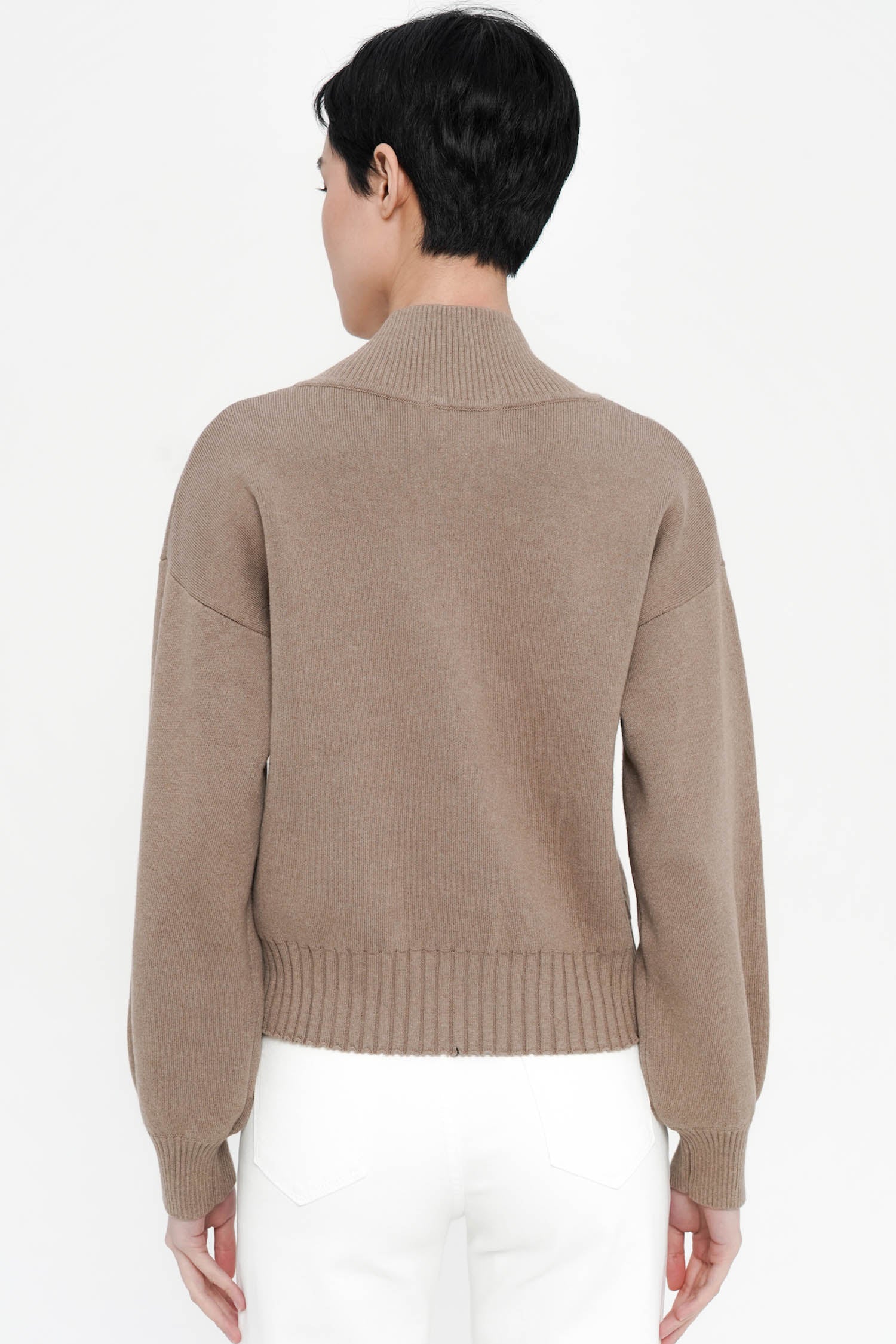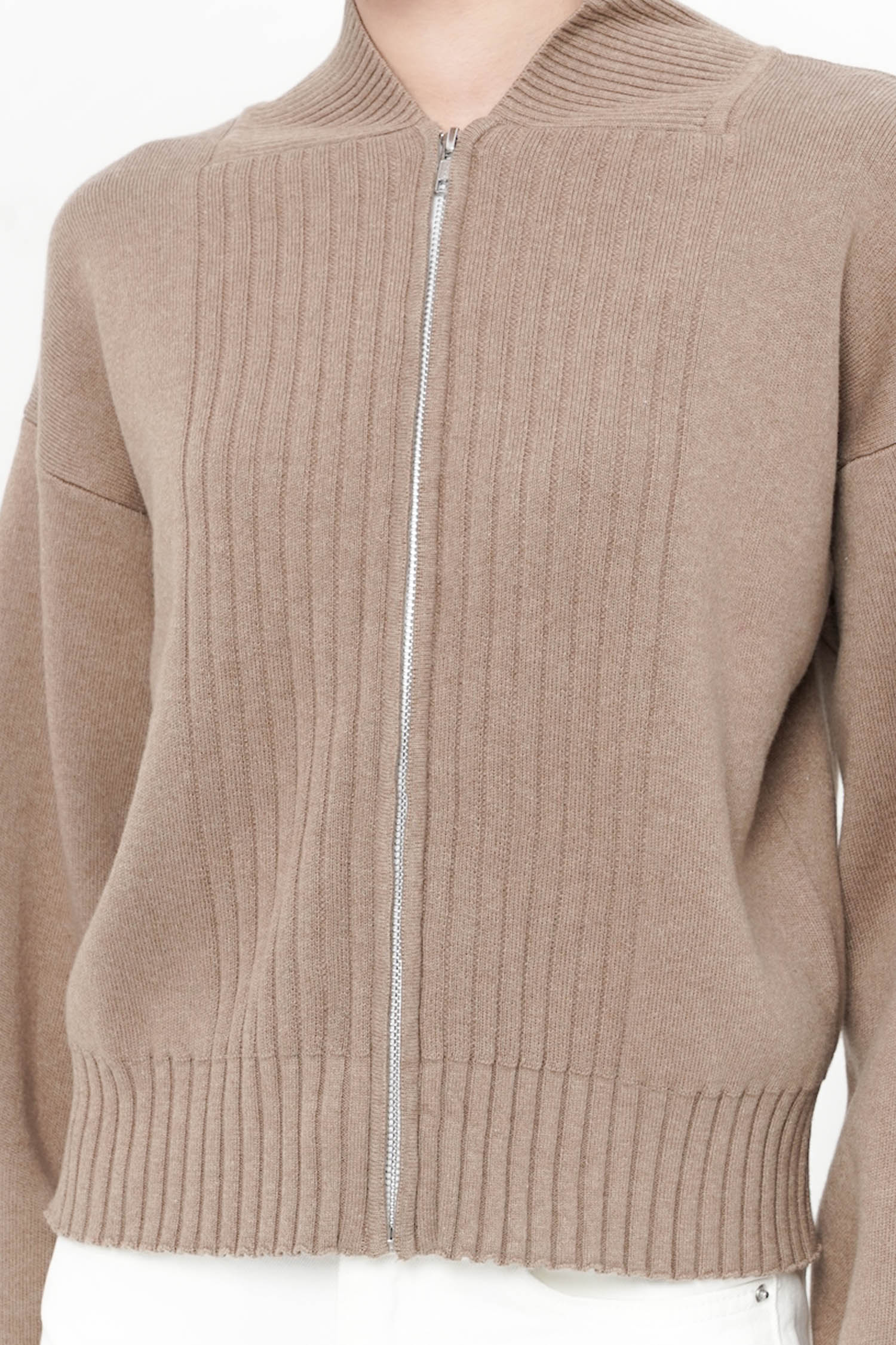 The Cyon Puff-sleeve Cardi is a refined knit essential crafted from soft cotton, featuring gently structured puff sleeves and a clean zip-front closure that lends a contemporary polish. Its ribbed detailing adds elegant texture, while the relaxed silhouette drapes effortlessly for elevated everyday wear. Available in Oat, Espresso, and Grey.