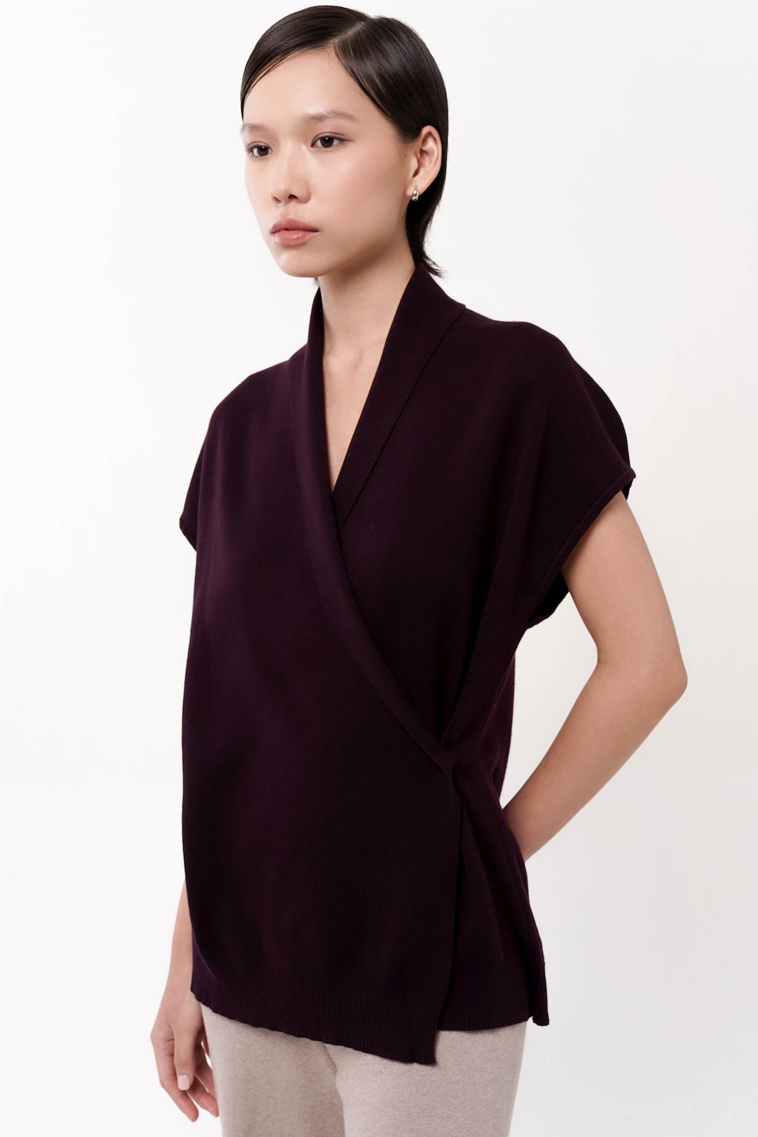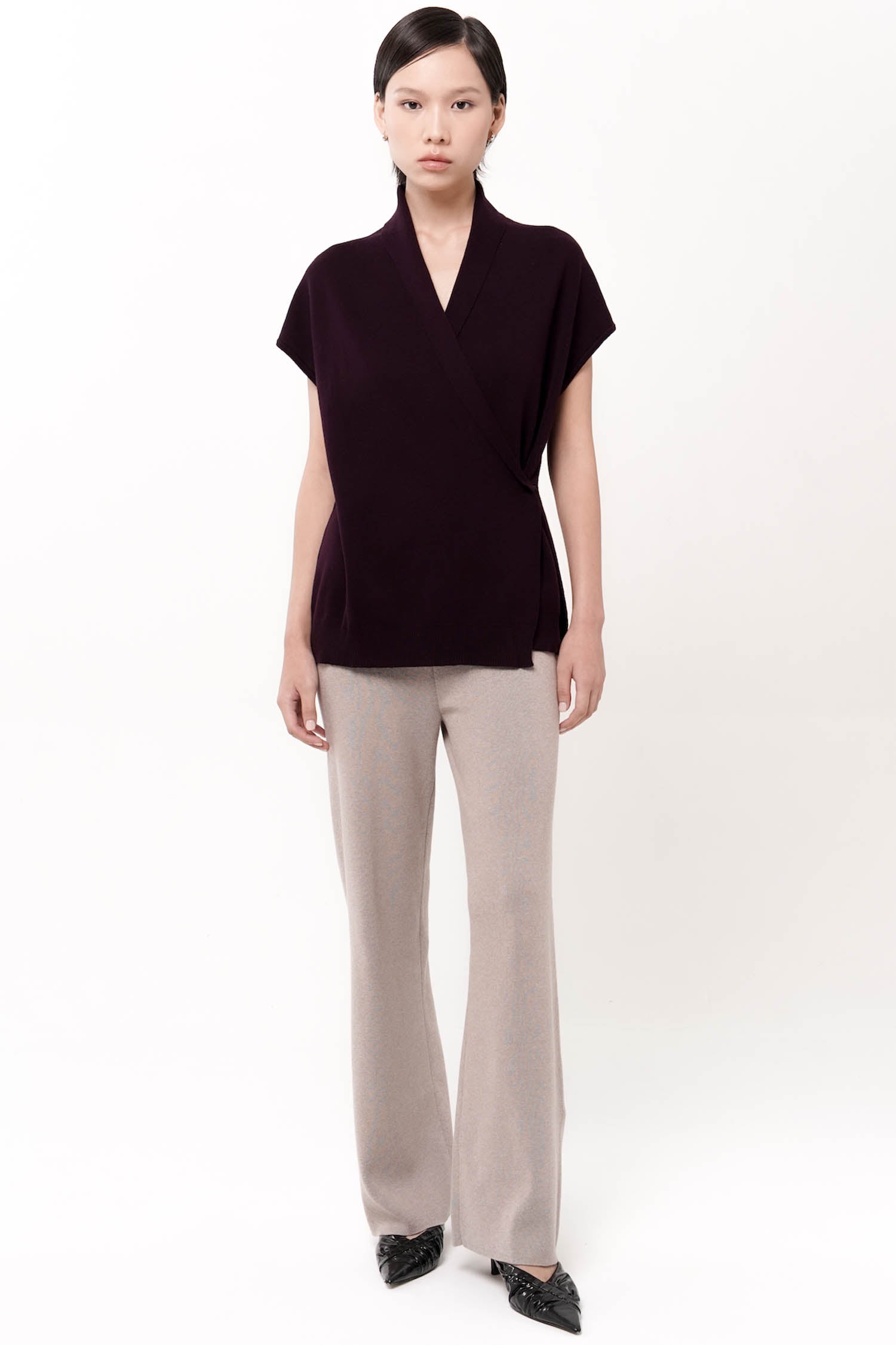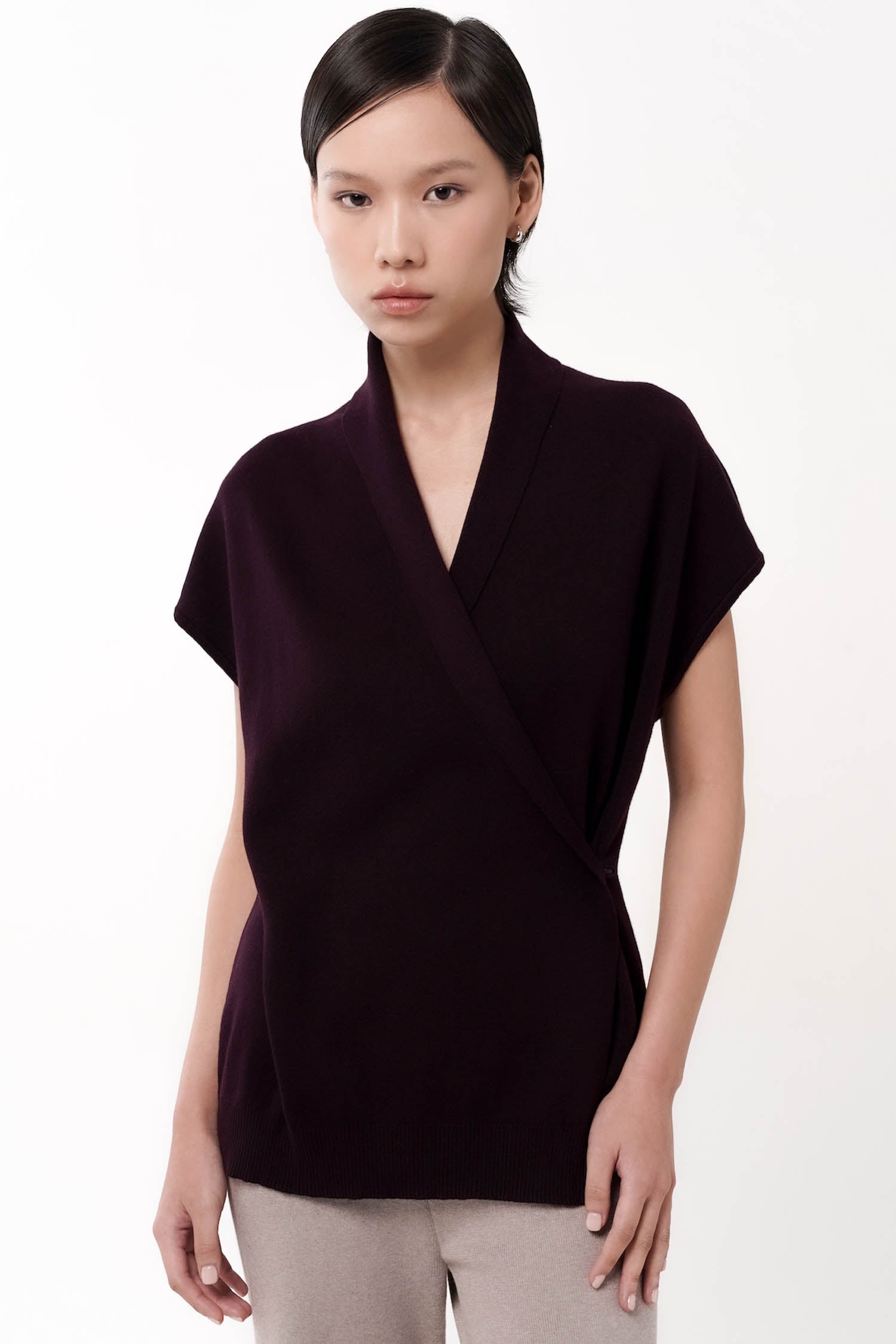 Graceful and effortlessly refined, the Eira Wrap Top is a modern interpretation of loungewear-luxe. Crafted from soft, breathable cotton knit, its fluid silhouette features a clean, crossover front secured subtly at the side for a flattering wrap effect. The cap sleeves and shawl collar lend an air of quiet sophistication, while the ribbed hem offers gentle structure. Whether styled with tailored bottoms or its coordinating knit pants, Eira moves seamlessly from leisurely mornings to elegant evenings. Available in Dark Grey, Black, and Taupe.
