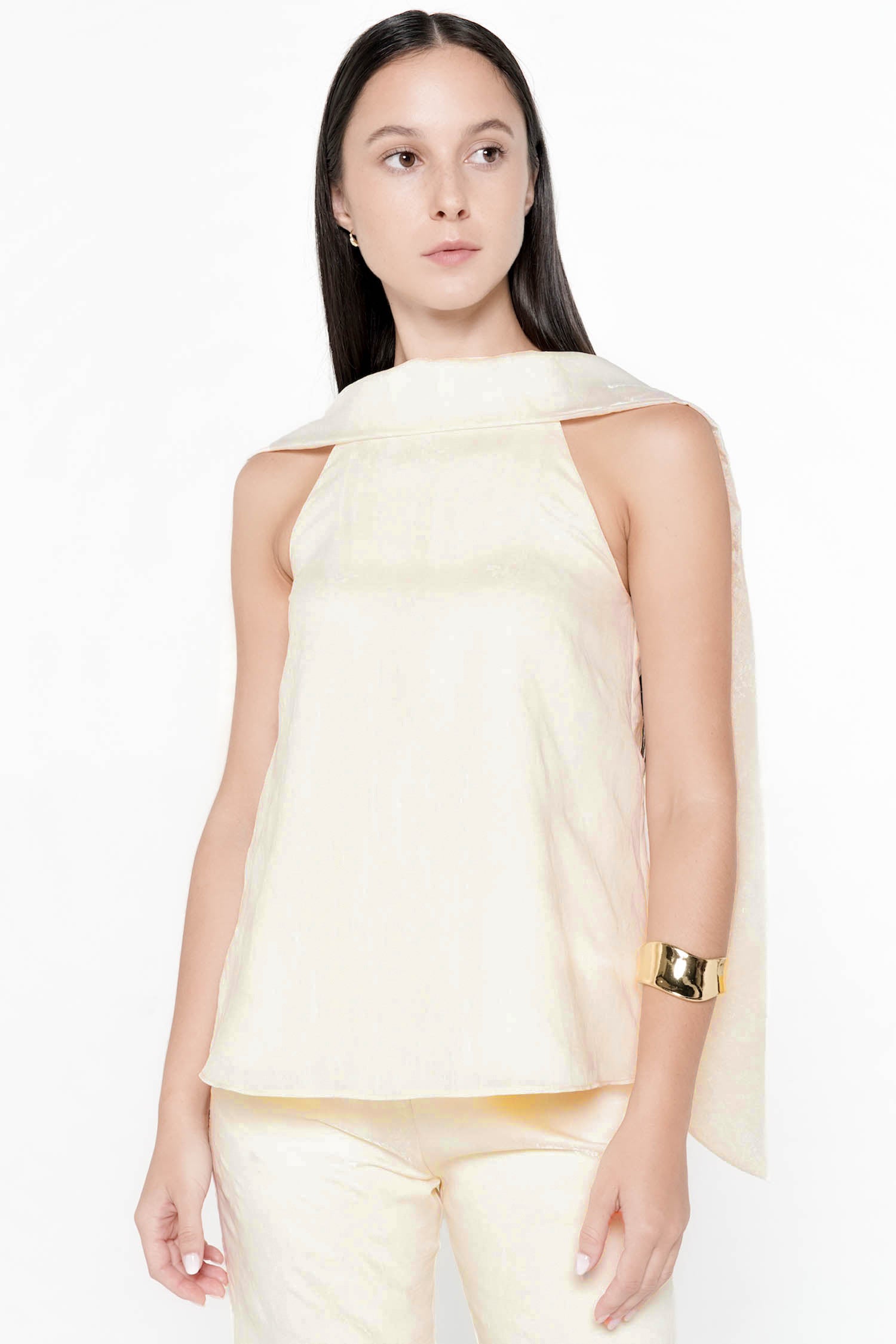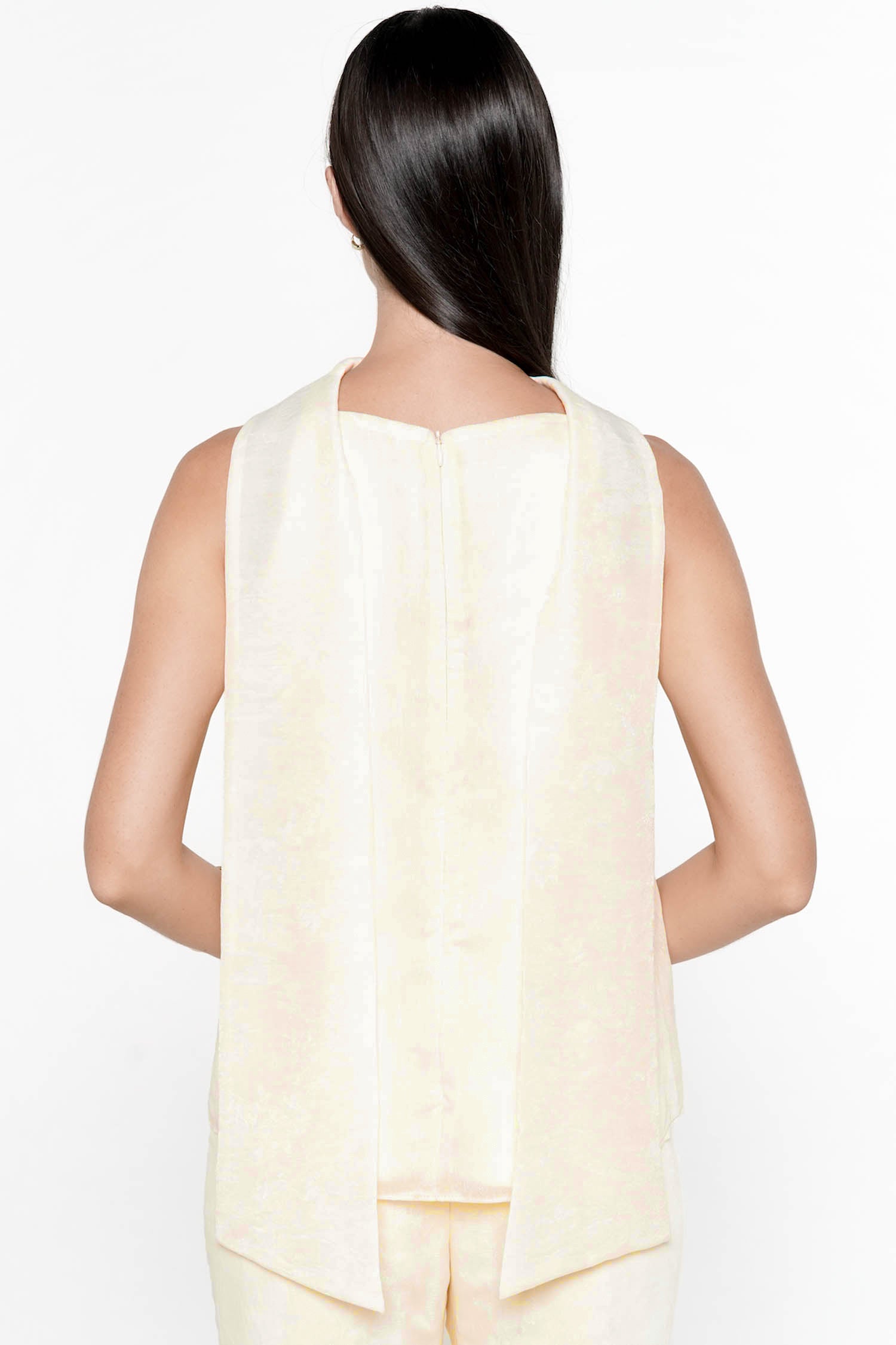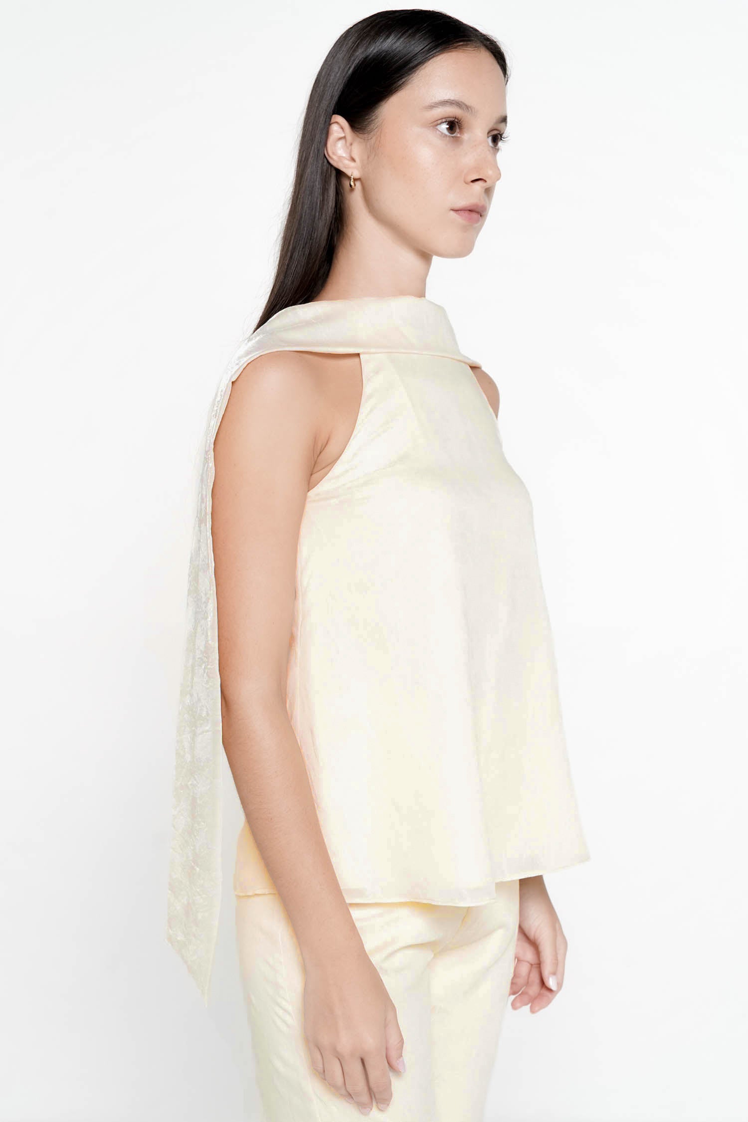 The Elowen Scarf Top embodies graceful femininity with its fluid silhouette and softly structured neckline, crafted from luminous polyester that drapes effortlessly over the body. Designed with an elegant scarf detail that cascades along the back, this piece creates a sense of movement and refinement from every angle, while the sleeveless cut enhances its modern, airy appeal. The relaxed yet polished shape makes it ideal for both elevated daywear and evening occasions, pairing seamlessly with tailored trousers or skirts for a sophisticated ensemble. Available in Butter and Dusty Pink, the Elowen Scarf Top offers a timeless statement with a delicate, contemporary charm.