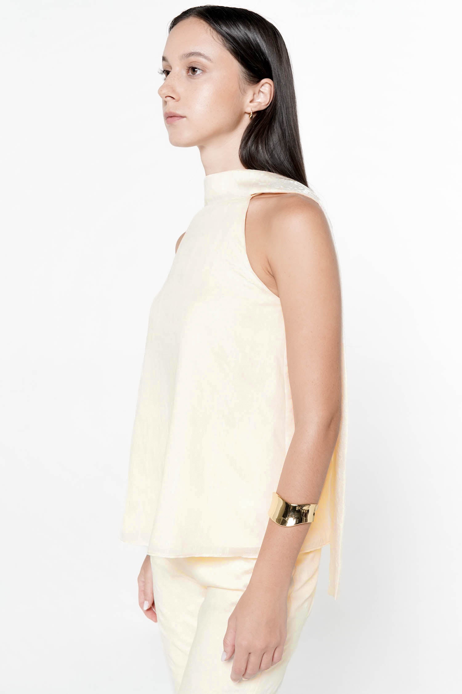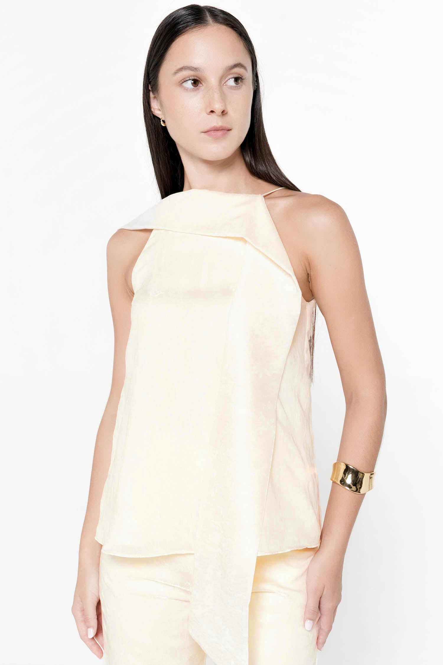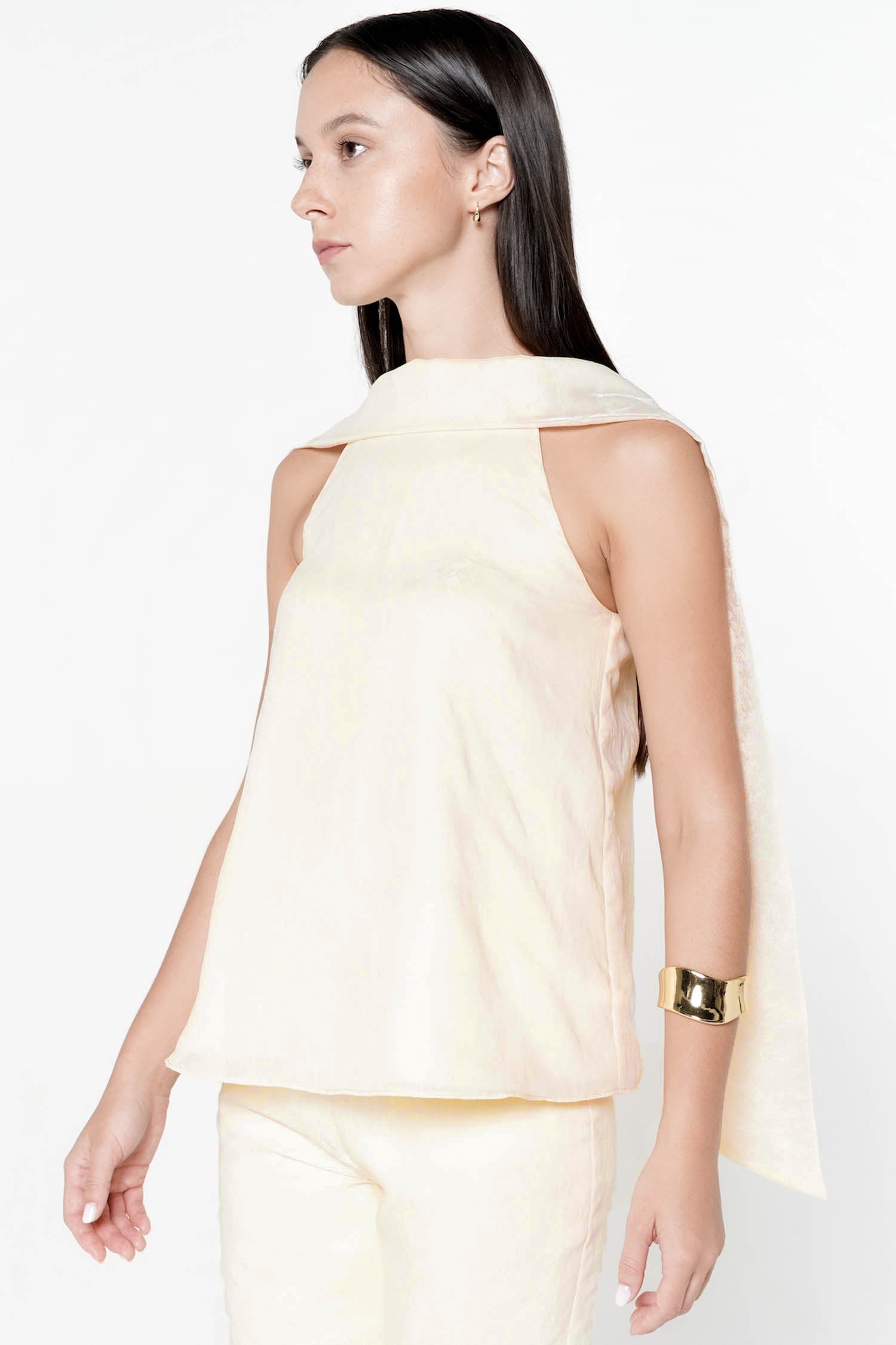 The Elowen Scarf Top embodies graceful femininity with its fluid silhouette and softly structured neckline, crafted from luminous polyester that drapes effortlessly over the body. Designed with an elegant scarf detail that cascades along the back, this piece creates a sense of movement and refinement from every angle, while the sleeveless cut enhances its modern, airy appeal. The relaxed yet polished shape makes it ideal for both elevated daywear and evening occasions, pairing seamlessly with tailored trousers or skirts for a sophisticated ensemble. Available in Butter and Dusty Pink, the Elowen Scarf Top offers a timeless statement with a delicate, contemporary charm.