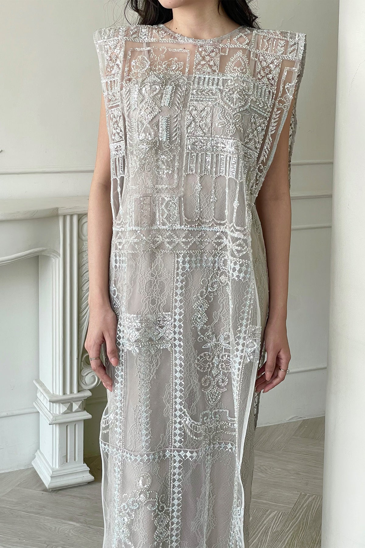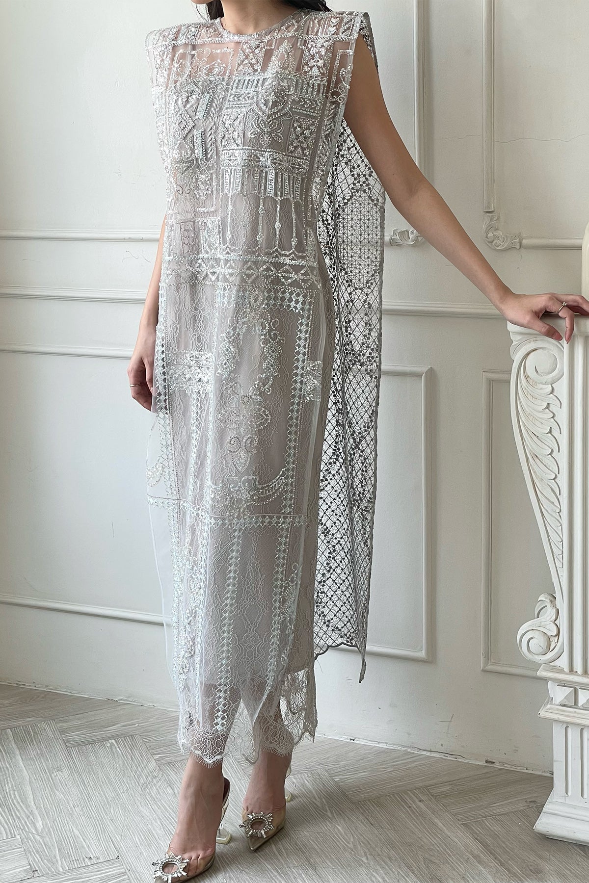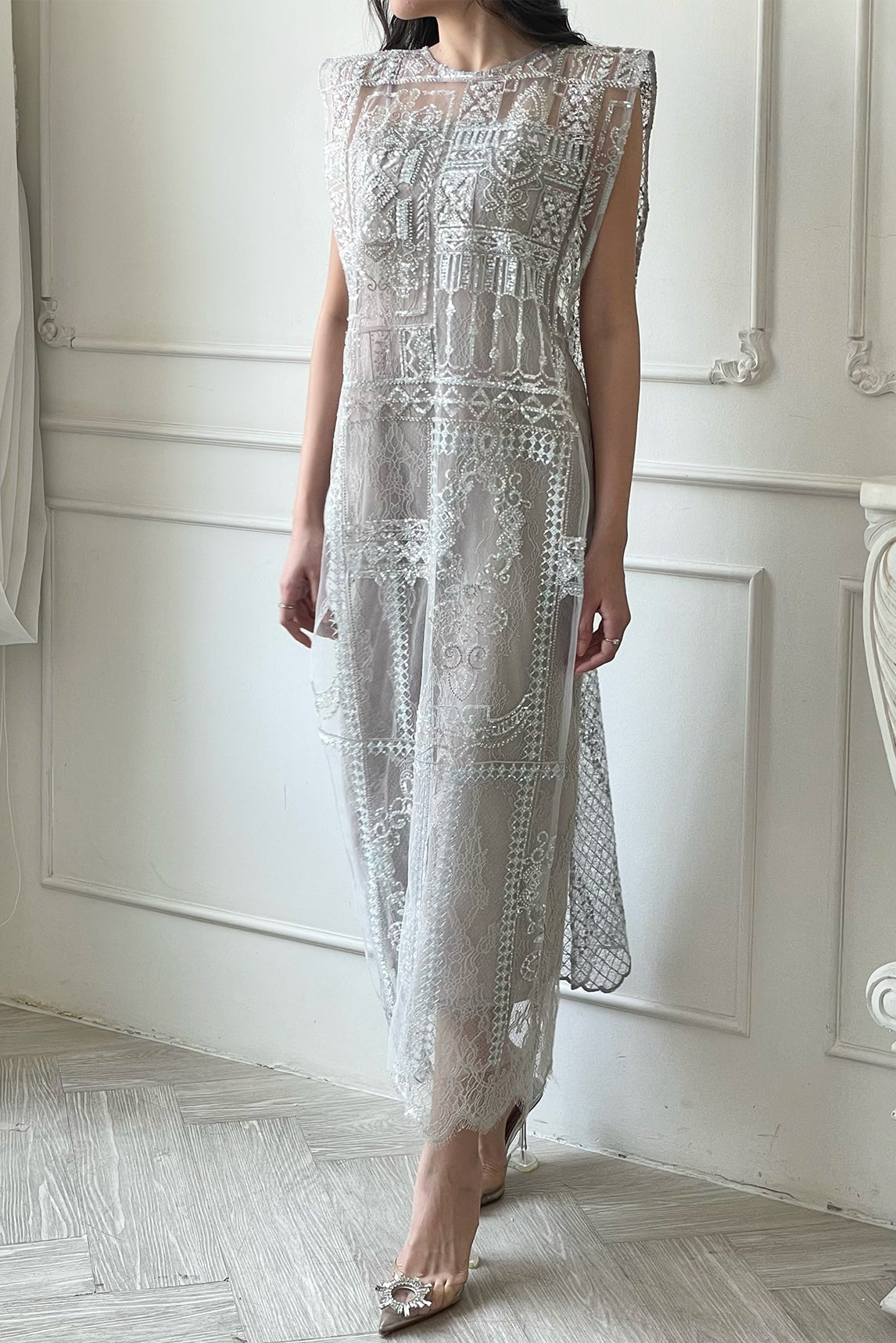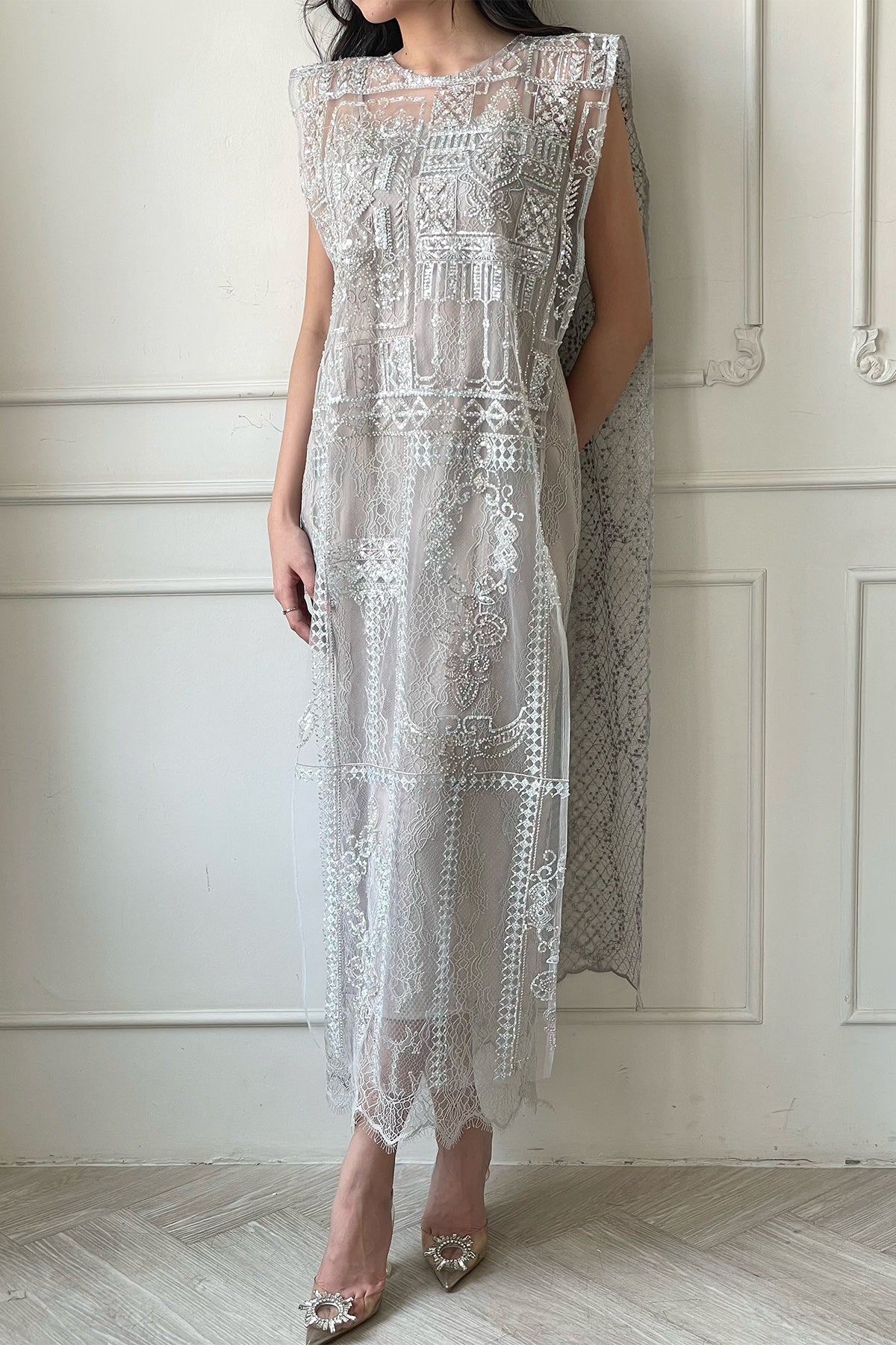 The Farah Dress in Silver n is a sophisticated choice for special occasions. Featuring intricate lace detailing, this elegant dress combines a soft, calming color with a timeless design, ensuring you stand out with grace and poise at any event.