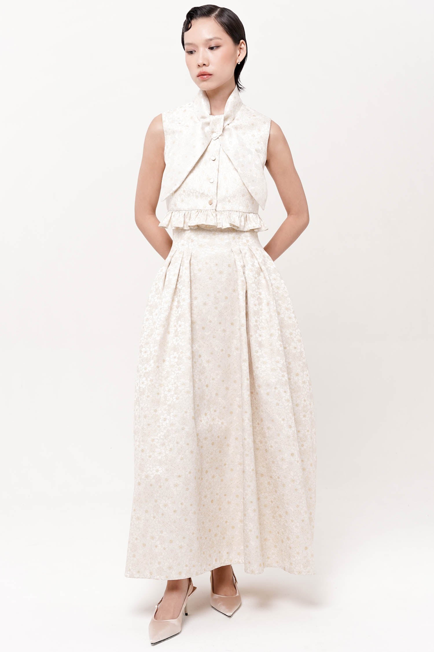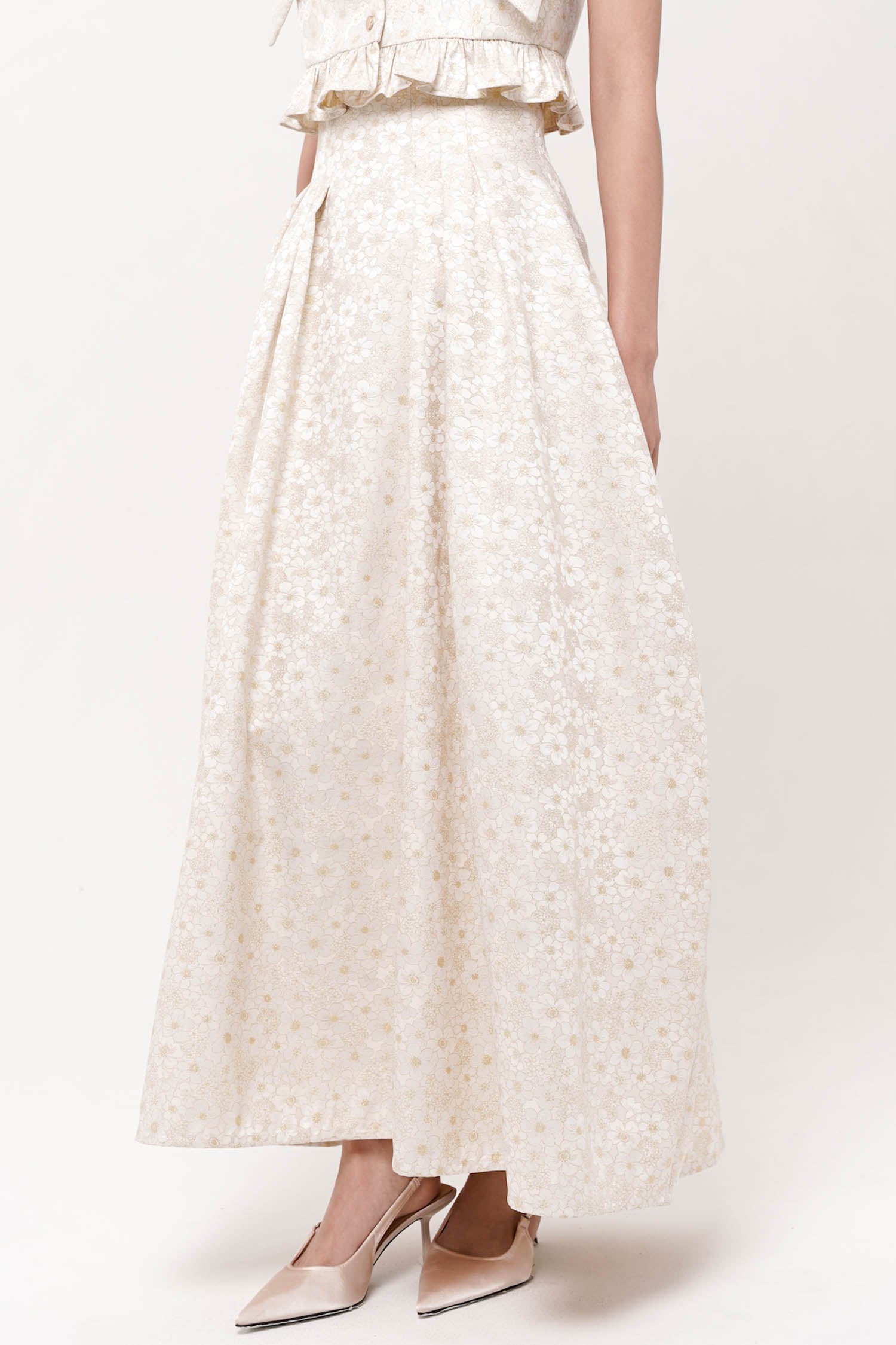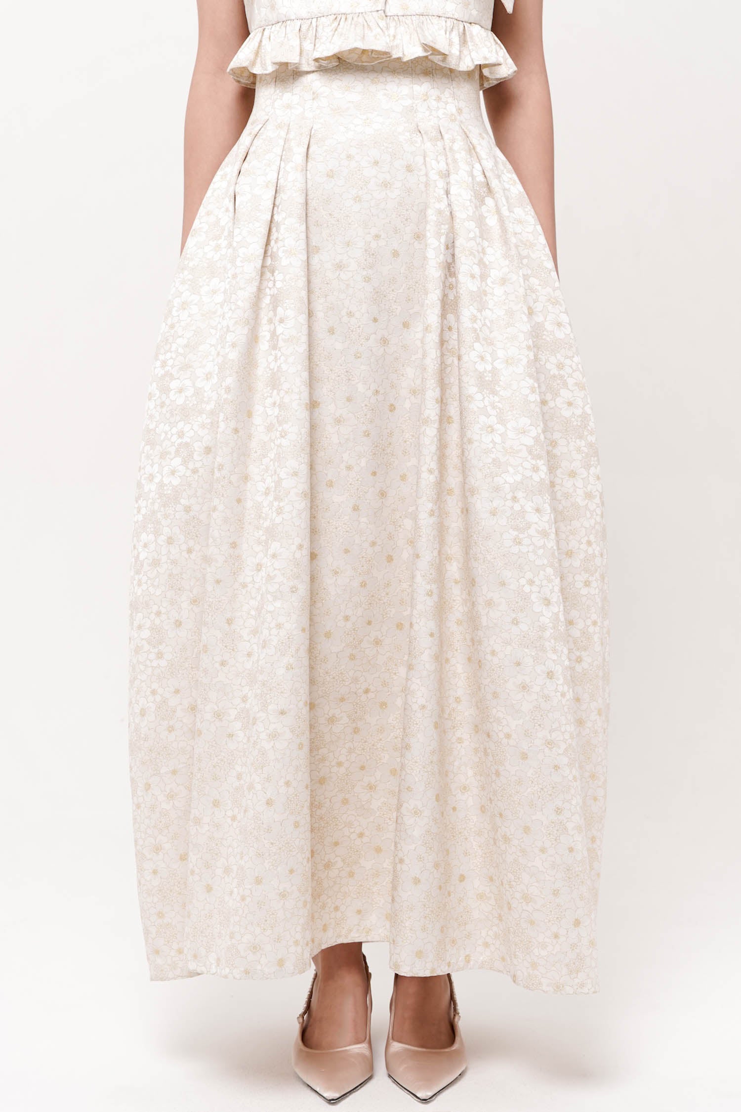 This skirt showcases refined elegance through its jacquard textile, which provides sophisticated visual interest. The high-waisted silhouette creates a flattering, elongated line while the barrel cut establishes a polished, contemporary form. Extended to maxi length, this piece offers versatile coverage suitable for diverse occasions and styling approaches. Best paired with Hana Top or Sheena Top Butter.