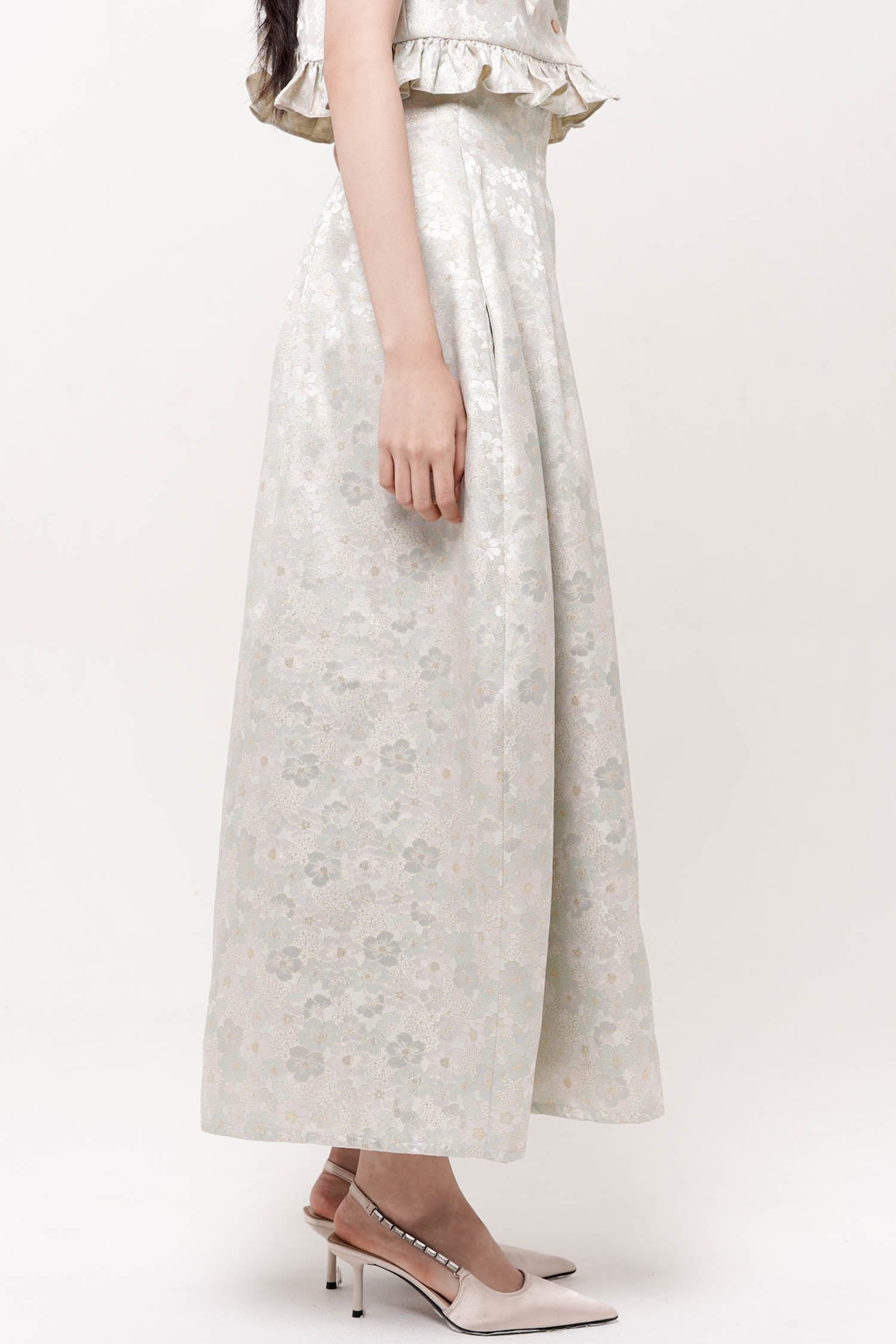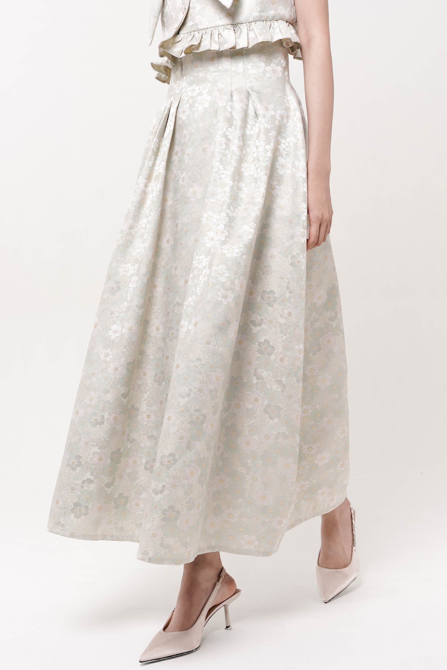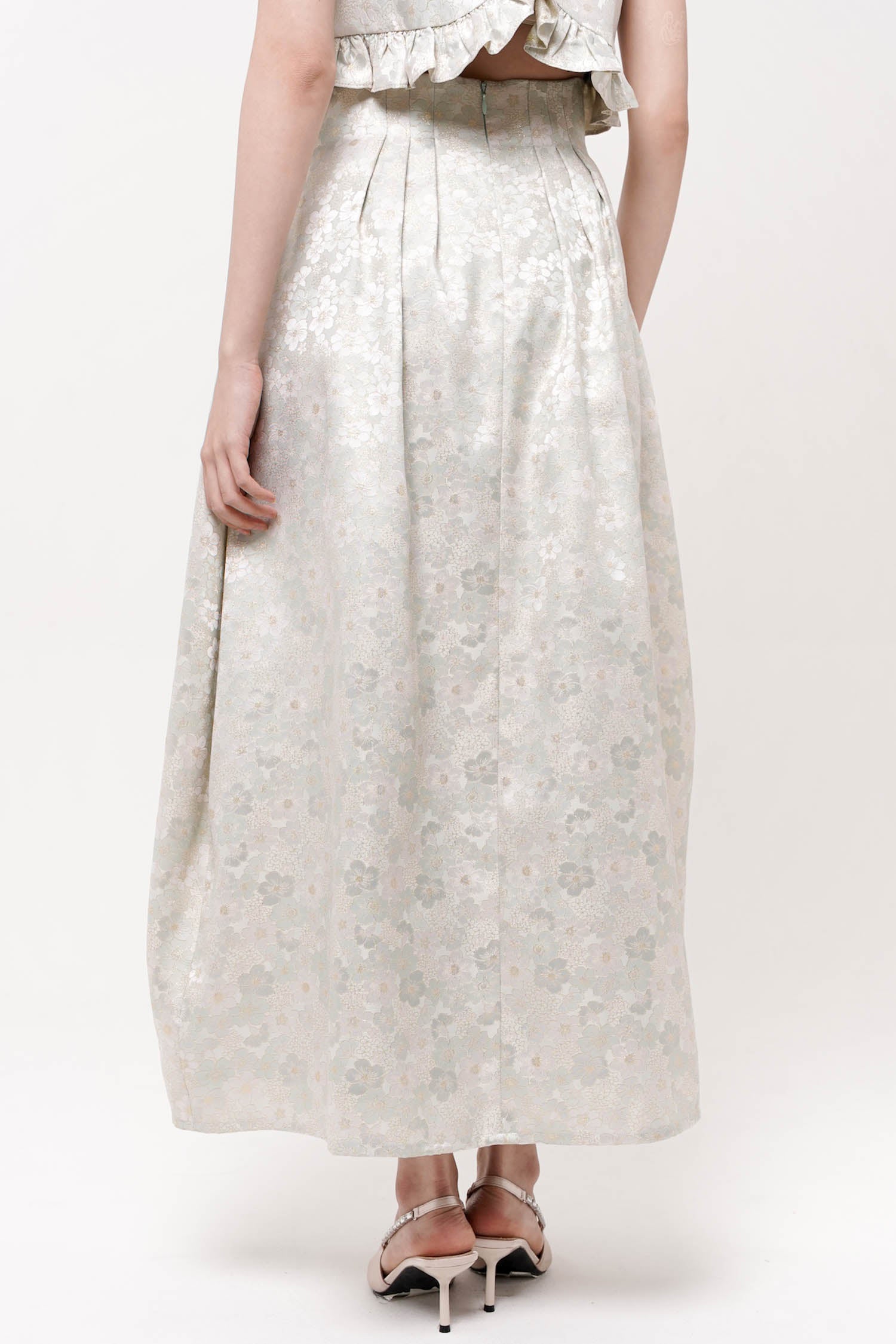 This skirt showcases refined elegance through its jacquard textile, which provides sophisticated visual interest. The high-waisted silhouette creates a flattering, elongated line while the barrel cut establishes a polished, contemporary form. Extended to maxi length, this piece offers versatile coverage suitable for diverse occasions and styling approaches. Best paired with Hana Top Mint.