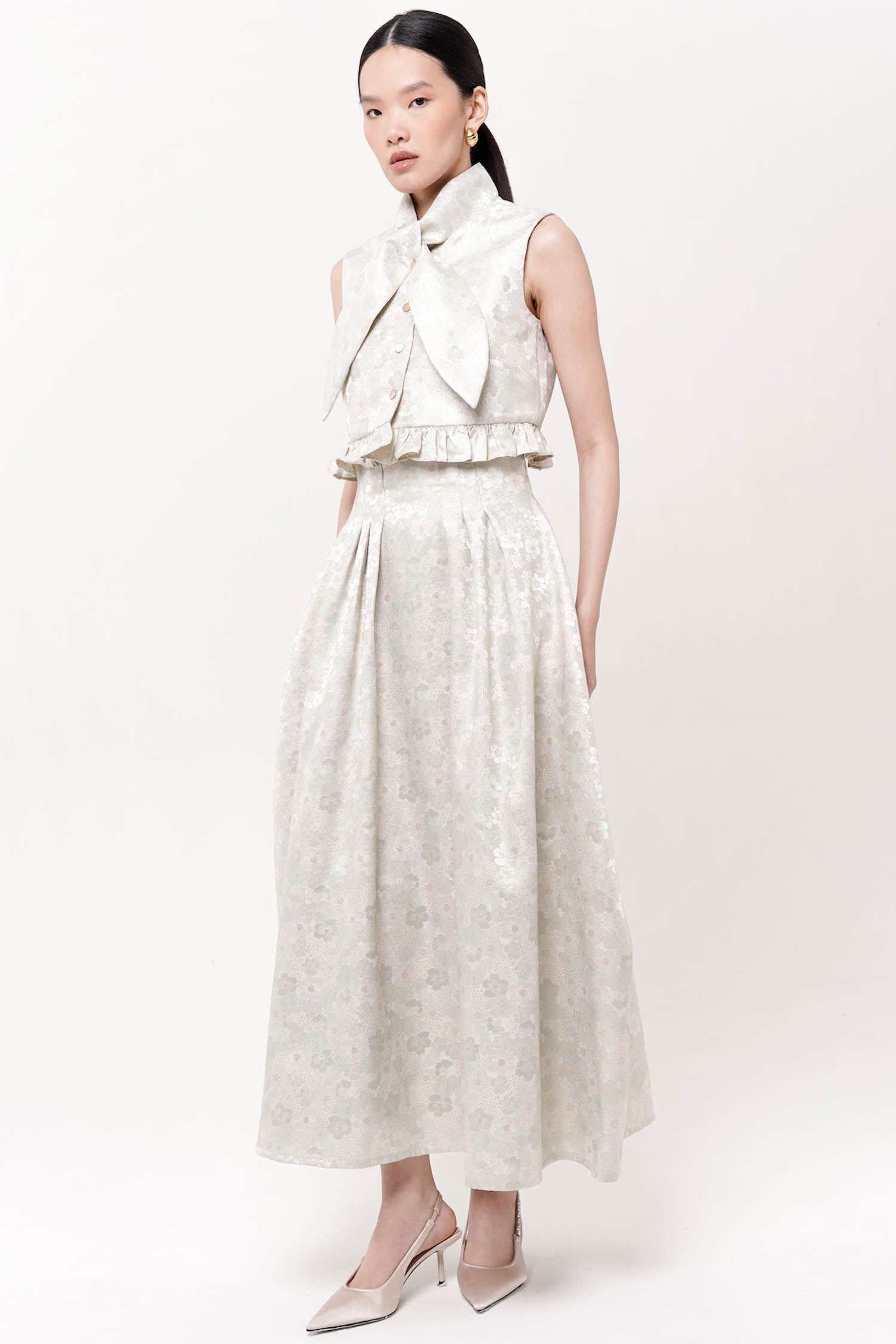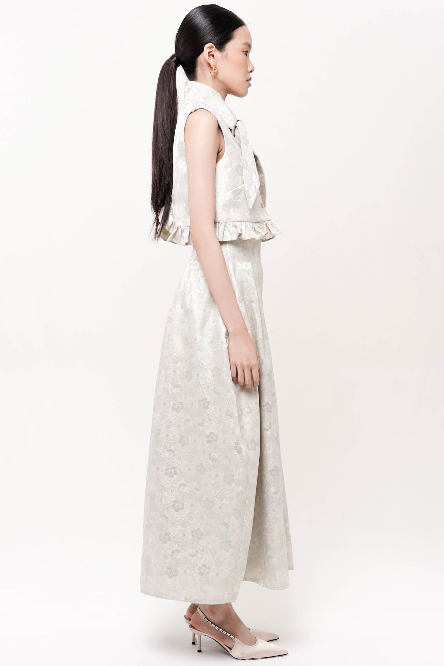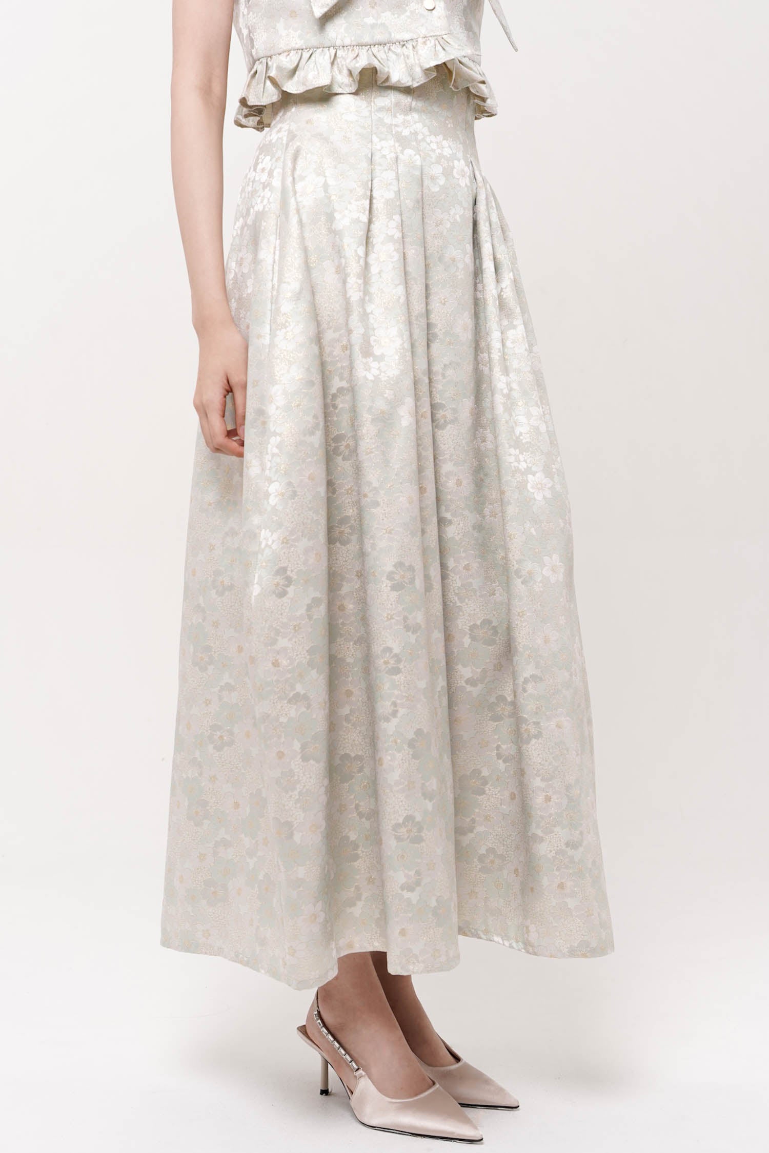 This skirt showcases refined elegance through its jacquard textile, which provides sophisticated visual interest. The high-waisted silhouette creates a flattering, elongated line while the barrel cut establishes a polished, contemporary form. Extended to maxi length, this piece offers versatile coverage suitable for diverse occasions and styling approaches. Best paired with Hana Top Mint.