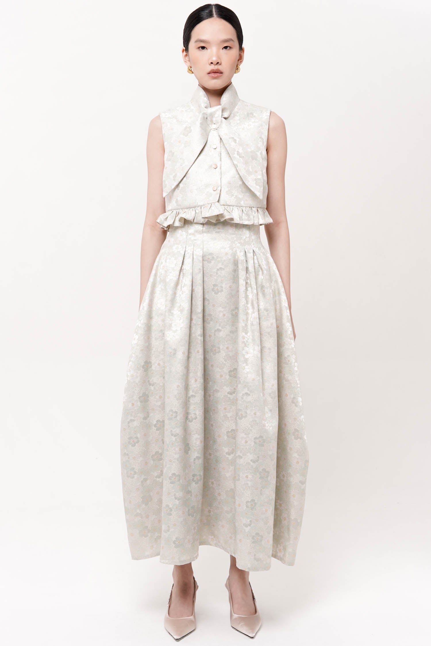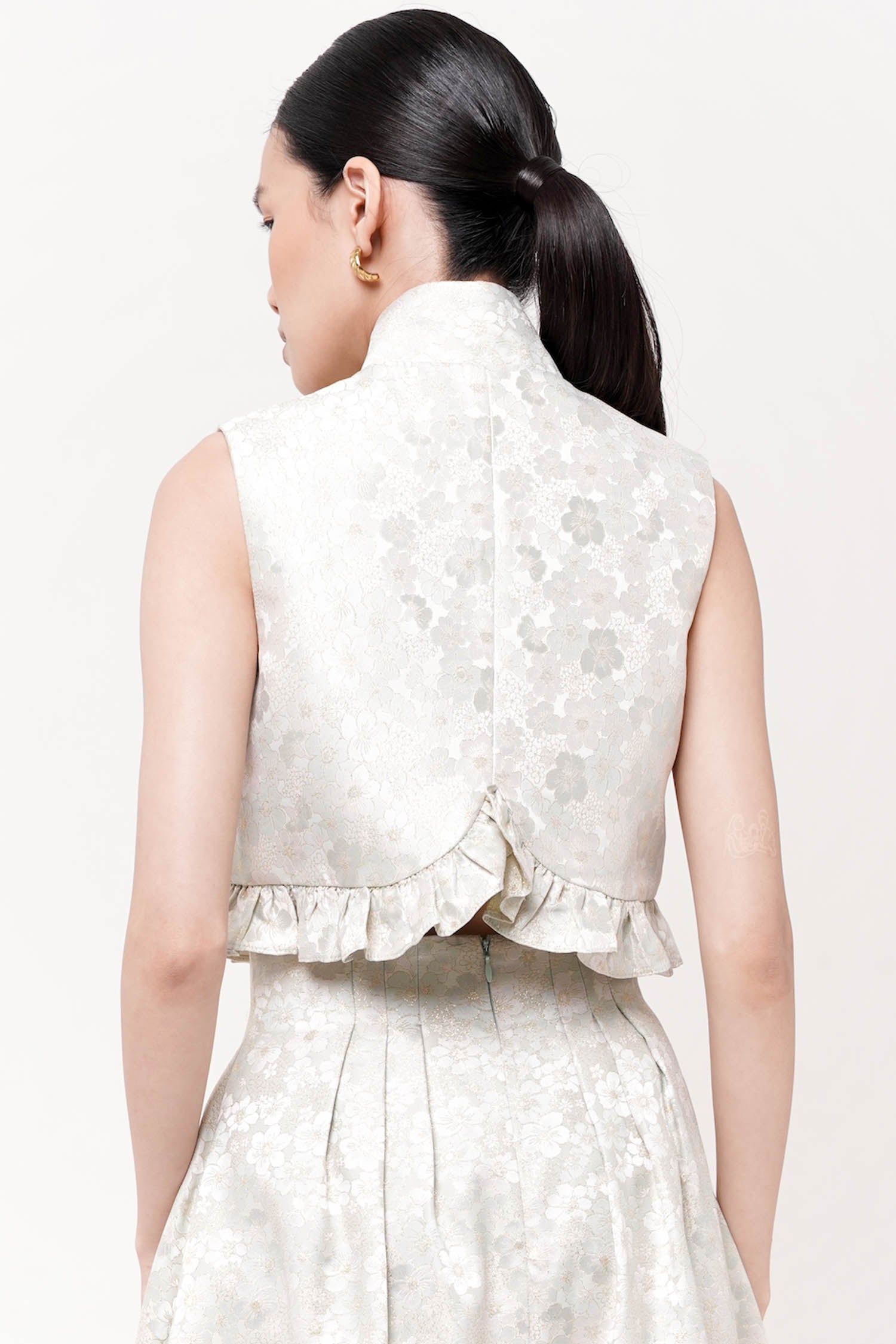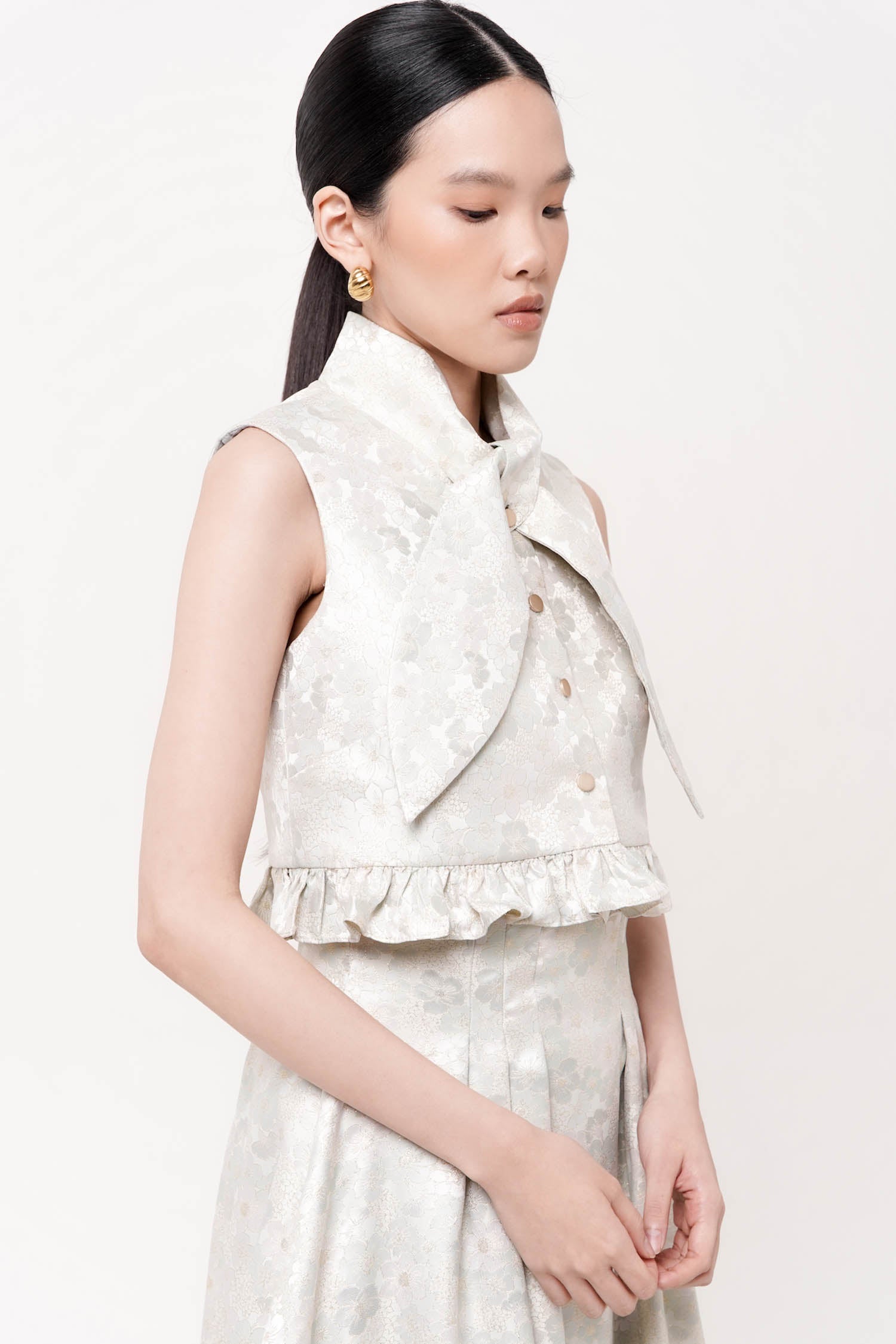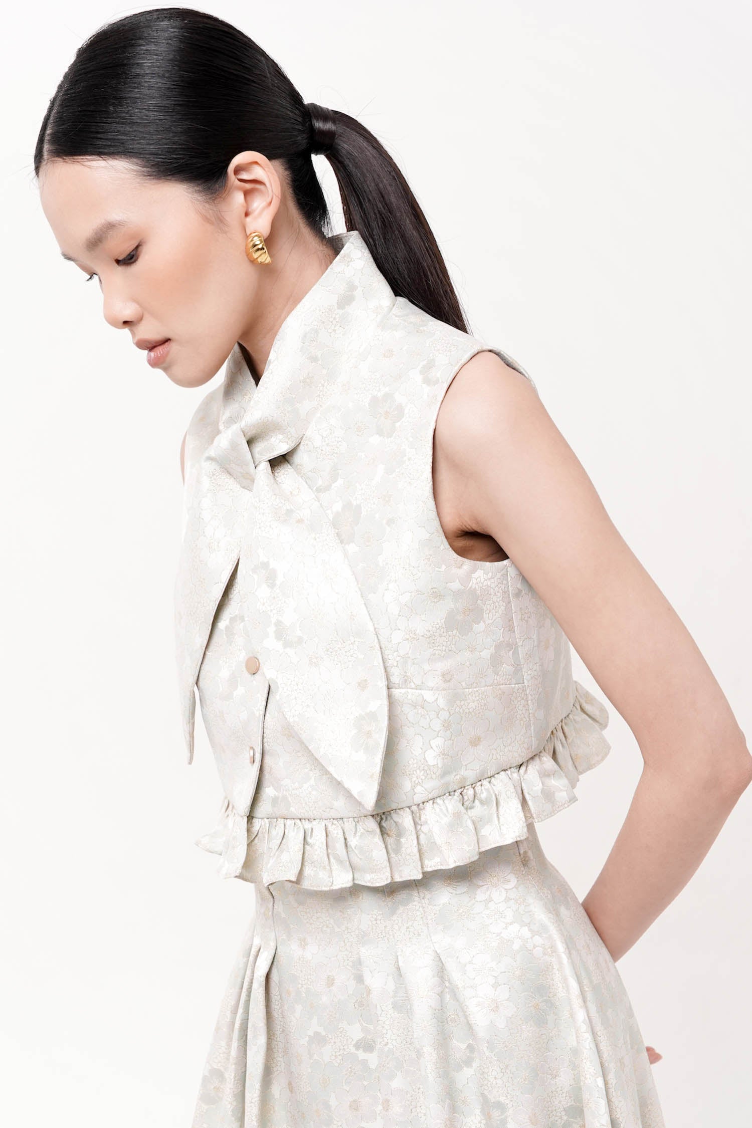 A versatile sleeveless piece designed for effortless styling. The cropped silhouette pairs seamlessly with high-waisted bottoms, while the relaxed fit ensures comfortable all-day wear. Frills trim the hemline, adding visual interest. Complemented with ties to create multiple styling options.