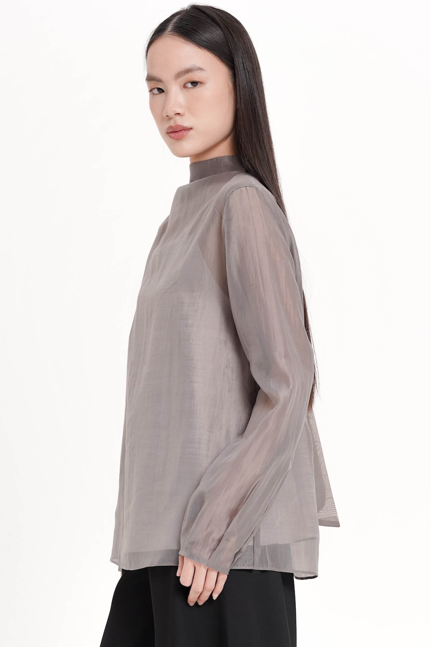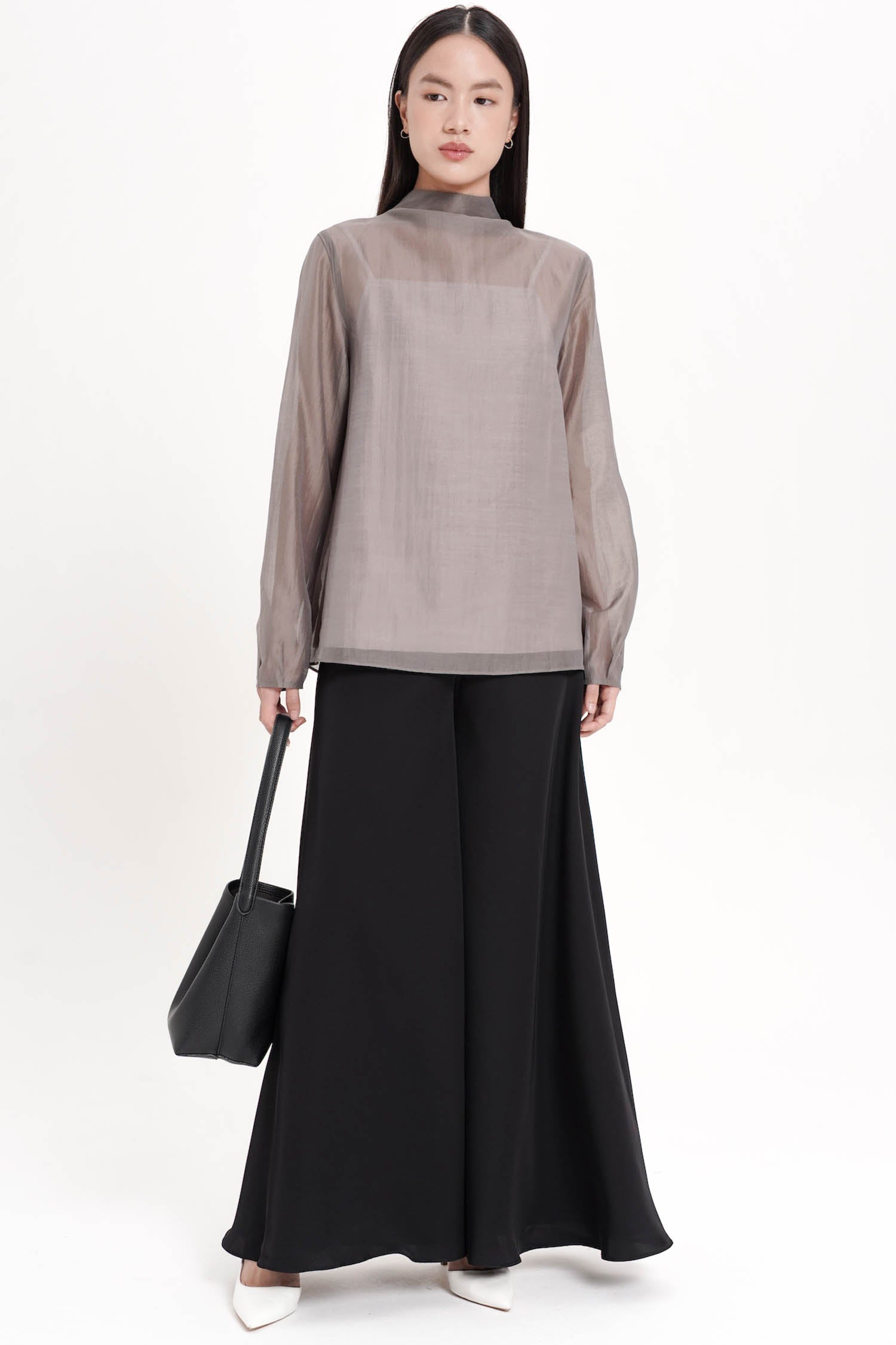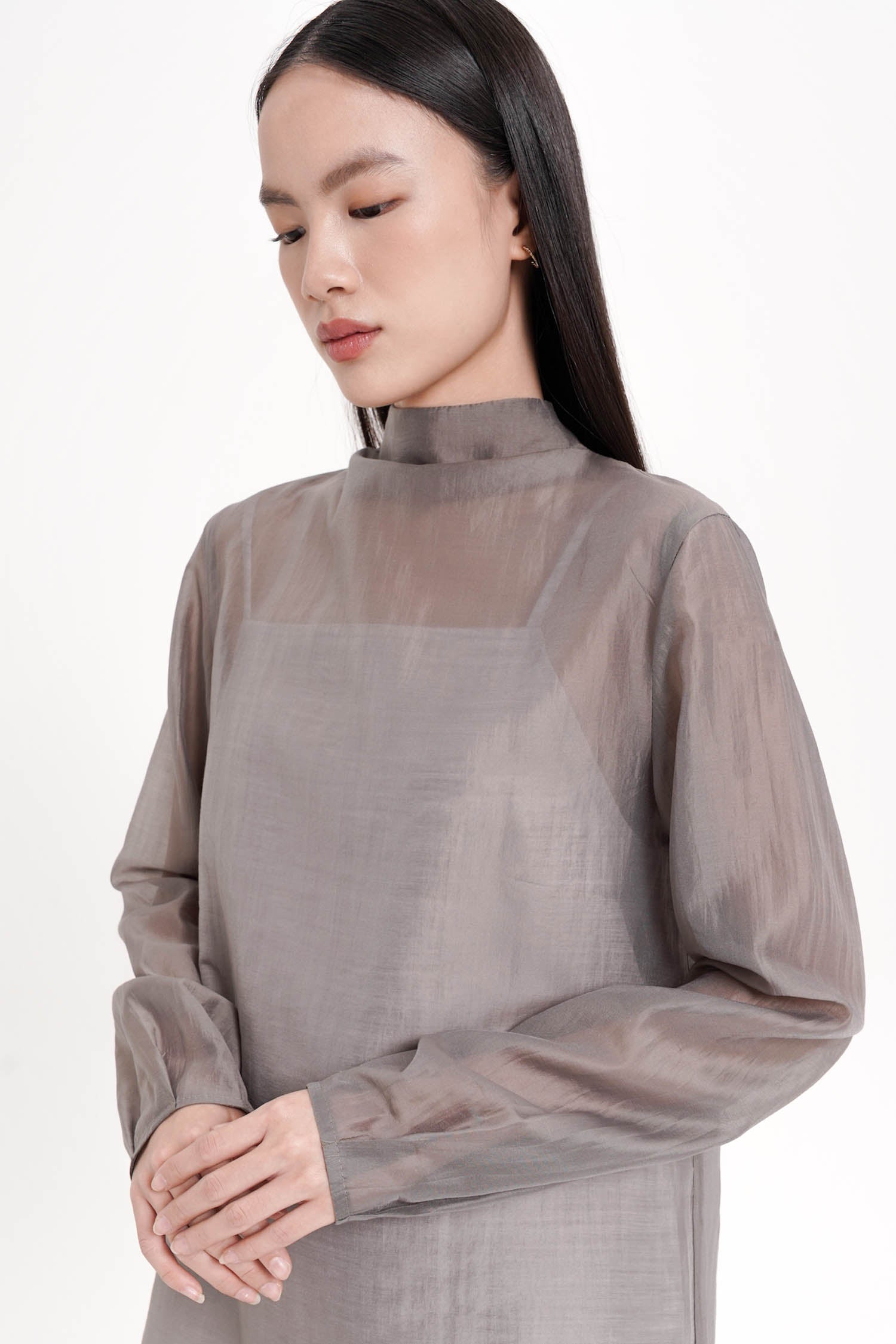 The Joven Two-piece Top is a refined study in quiet elegance, crafted from lightweight polyester that drapes effortlessly for a soft, fluid silhouette. Presented in a sophisticated grey hue, the design features an airy sheer outer layer paired with an inner camisole, creating depth and subtle dimension. A high neckline lends modern structure, while the detachable long tie can be styled loose or knotted for versatile expressions of polish. With its gently voluminous sleeves and clean, elongated lines, this piece elevates any ensemble with understated luxury and timeless poise.