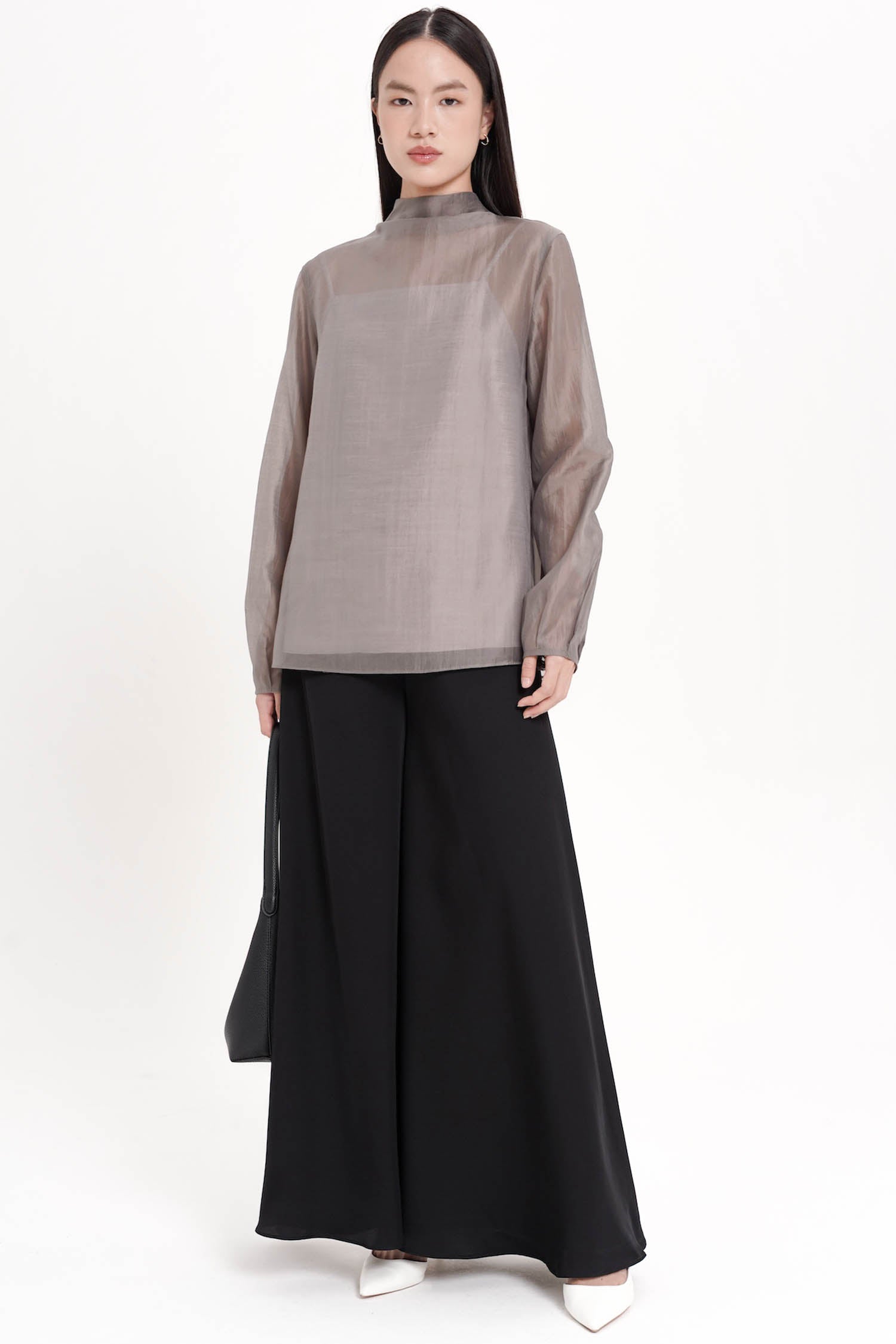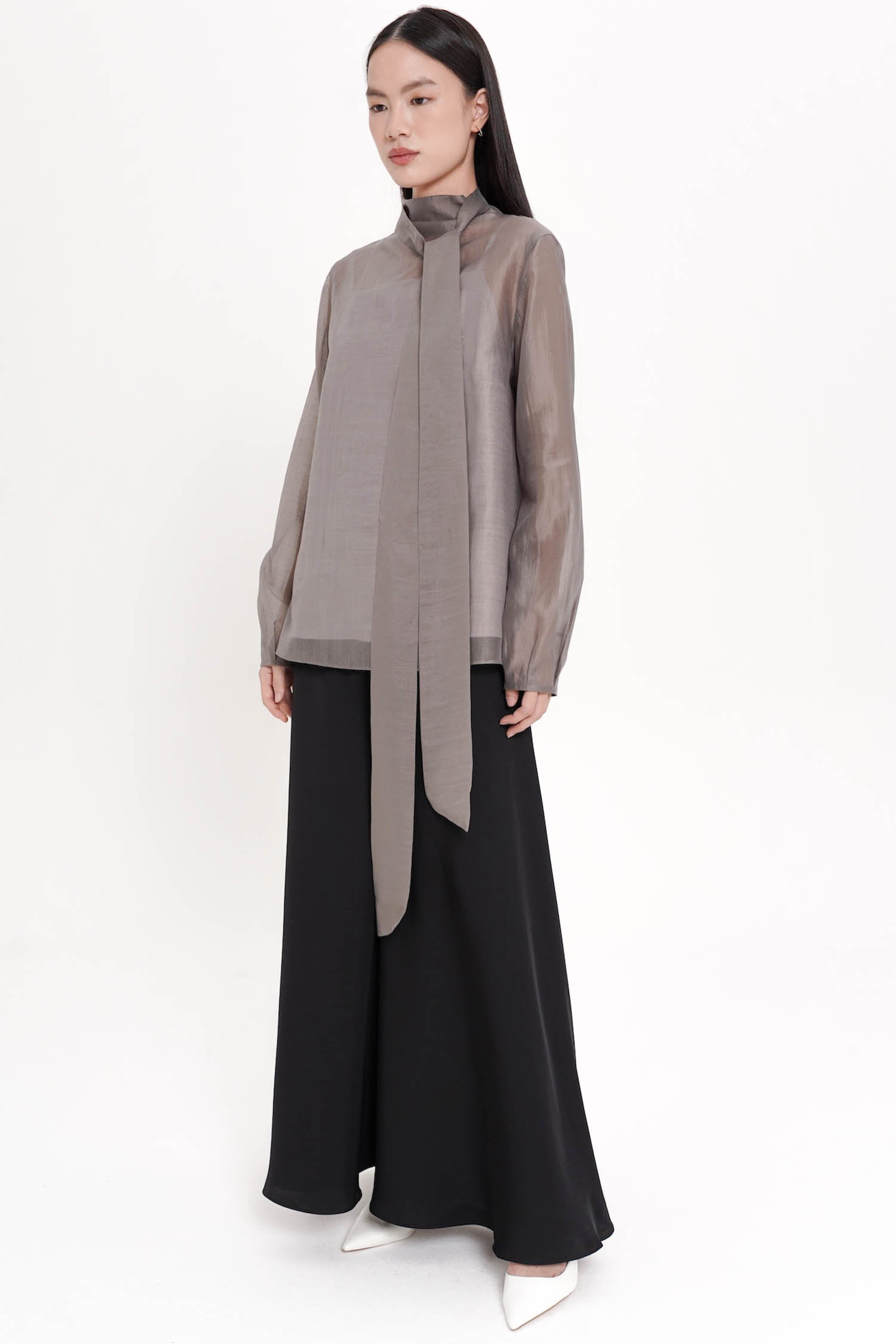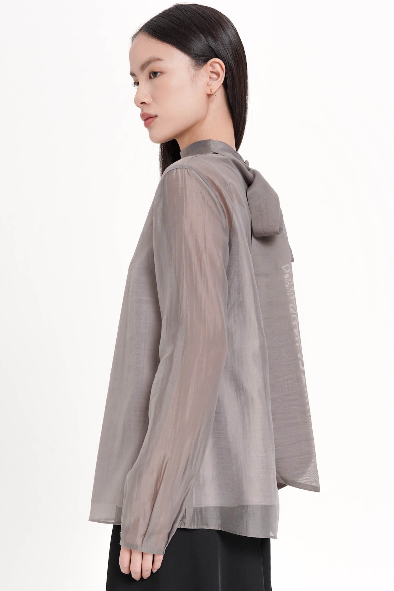 The Joven Two-piece Top is a refined study in quiet elegance, crafted from lightweight polyester that drapes effortlessly for a soft, fluid silhouette. Presented in a sophisticated grey hue, the design features an airy sheer outer layer paired with an inner camisole, creating depth and subtle dimension. A high neckline lends modern structure, while the detachable long tie can be styled loose or knotted for versatile expressions of polish. With its gently voluminous sleeves and clean, elongated lines, this piece elevates any ensemble with understated luxury and timeless poise.