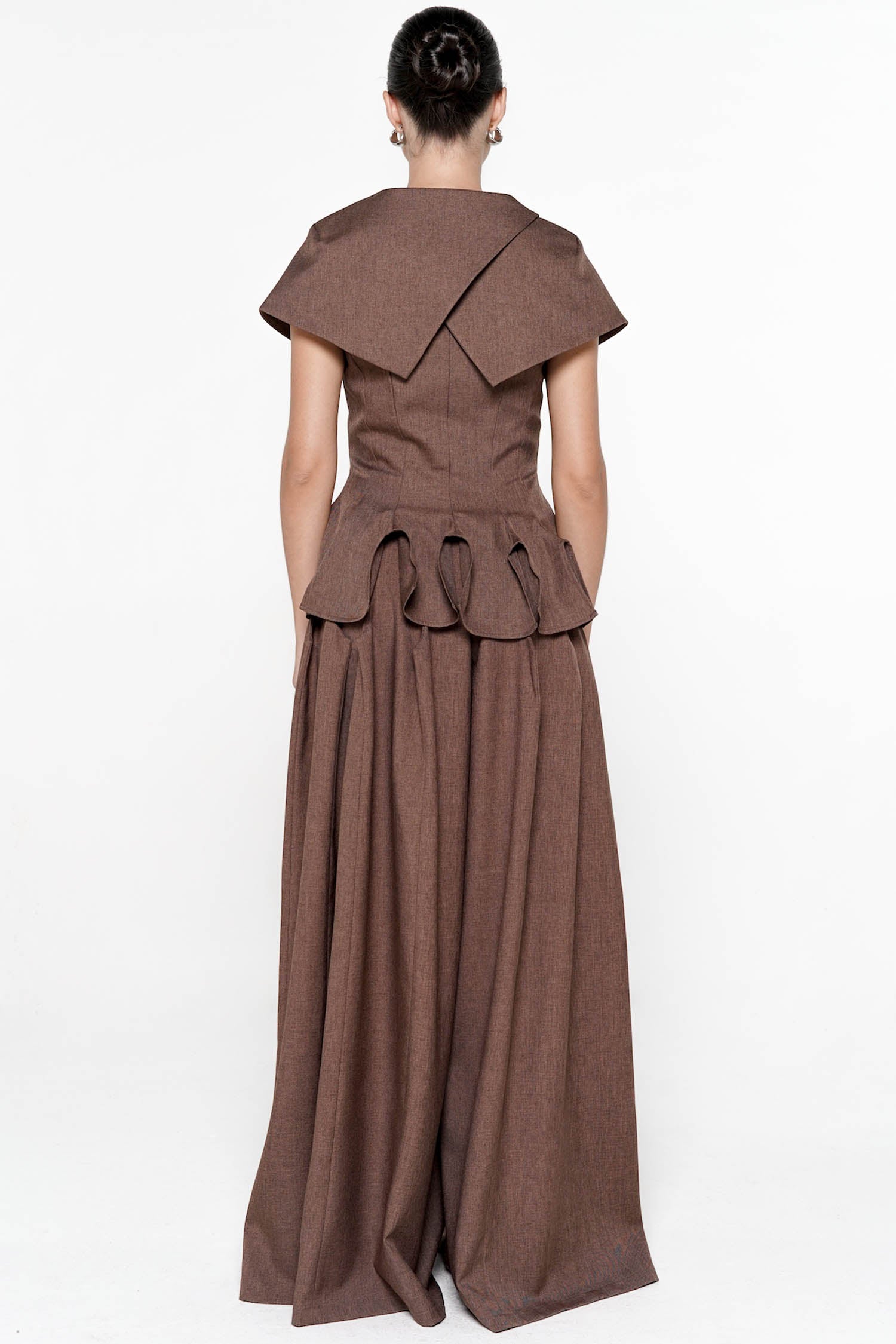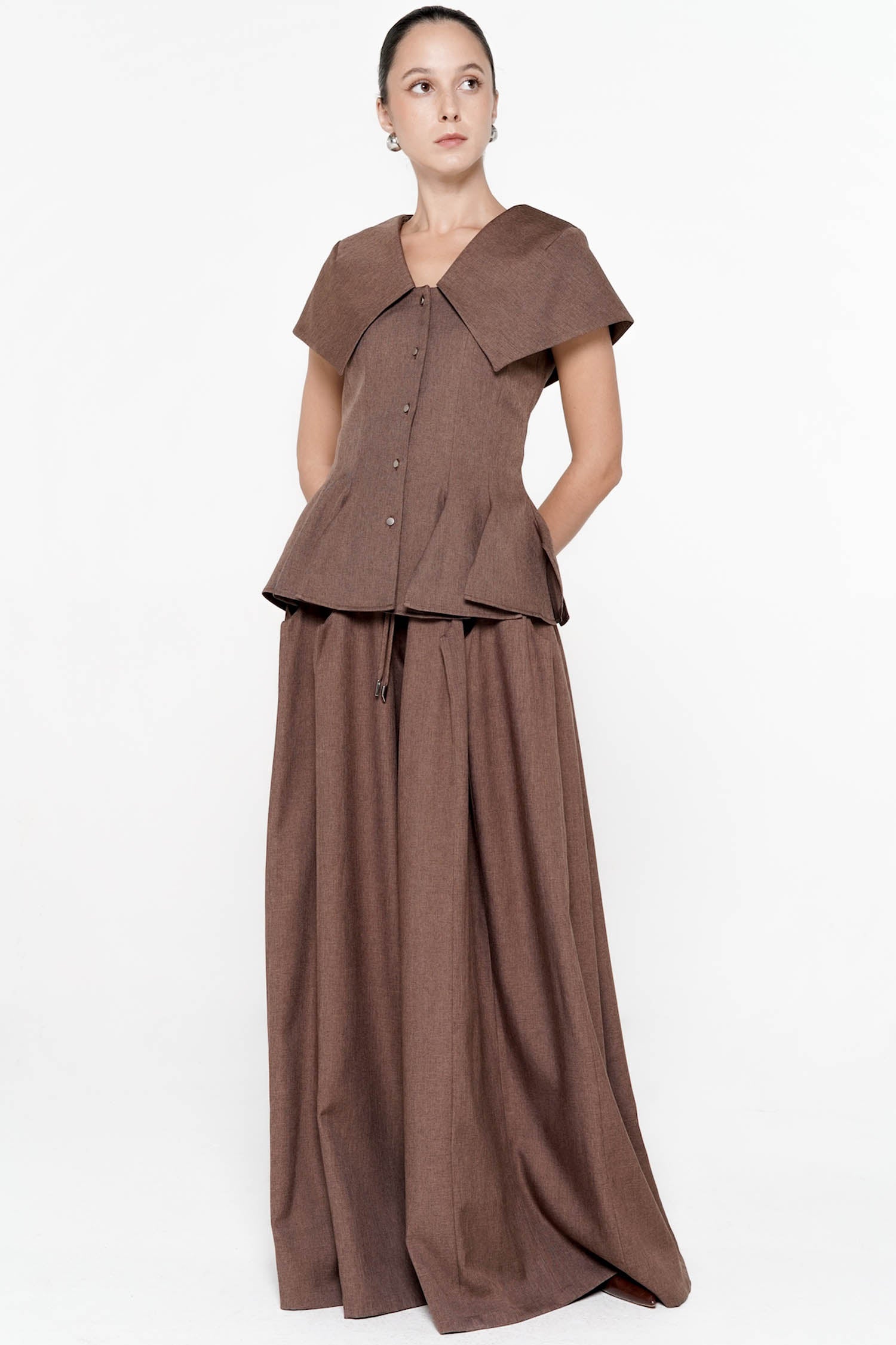 Krilo pants are crafted from a wool blend, featuring a flowing and voluminous silhouette that is accentuated by 3D panels running from the hips to the hem. Designed with a high waist for added comfort, these pants pair beautifully with either a cropped or fitted top. They also come with adjustable thin straps at the waist for a personalized fit.