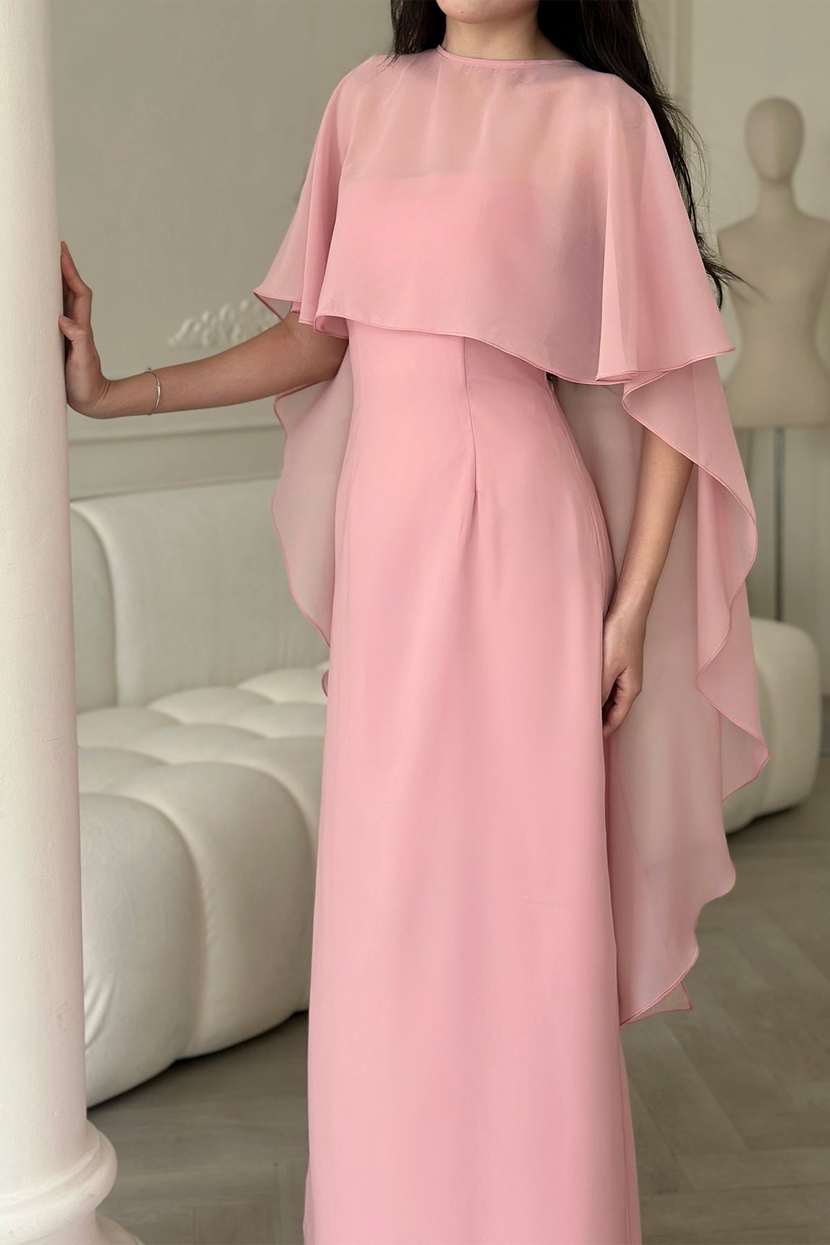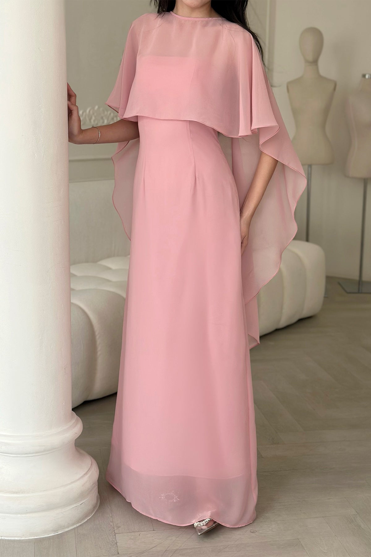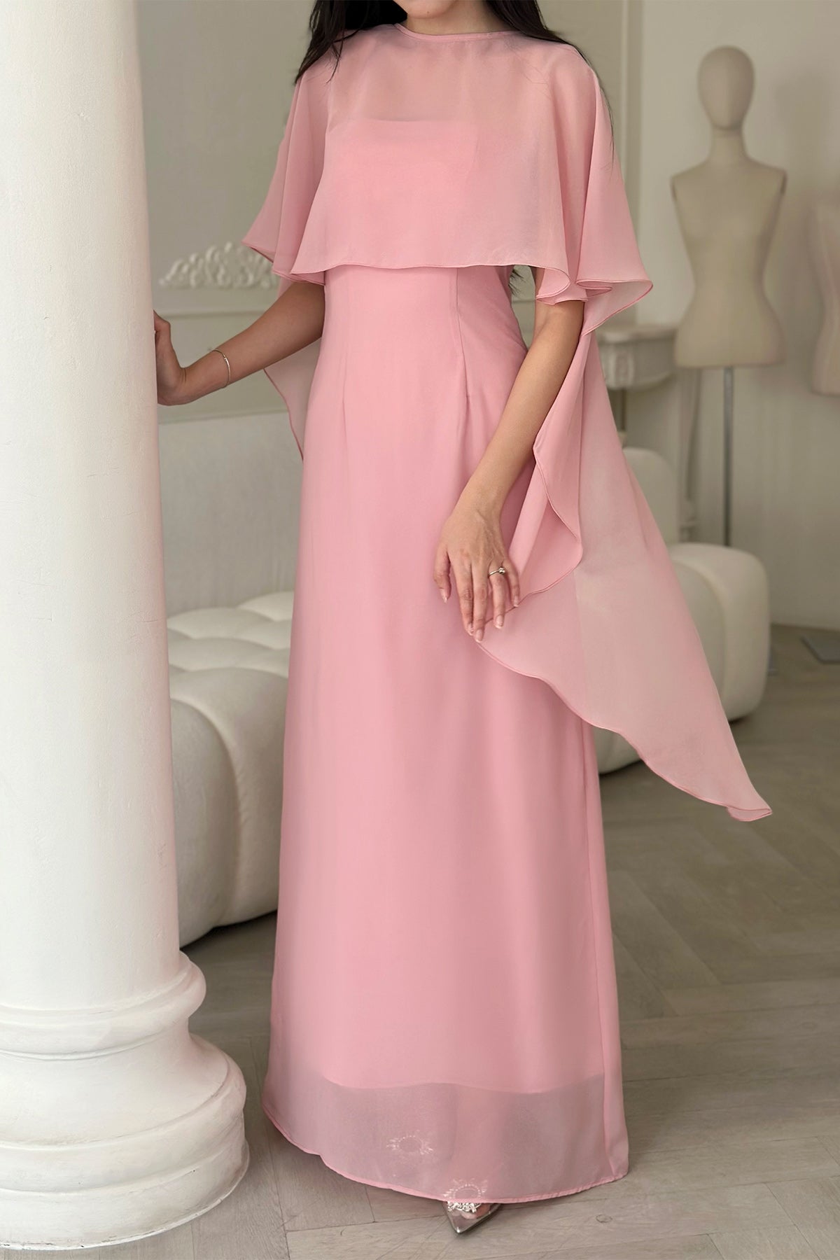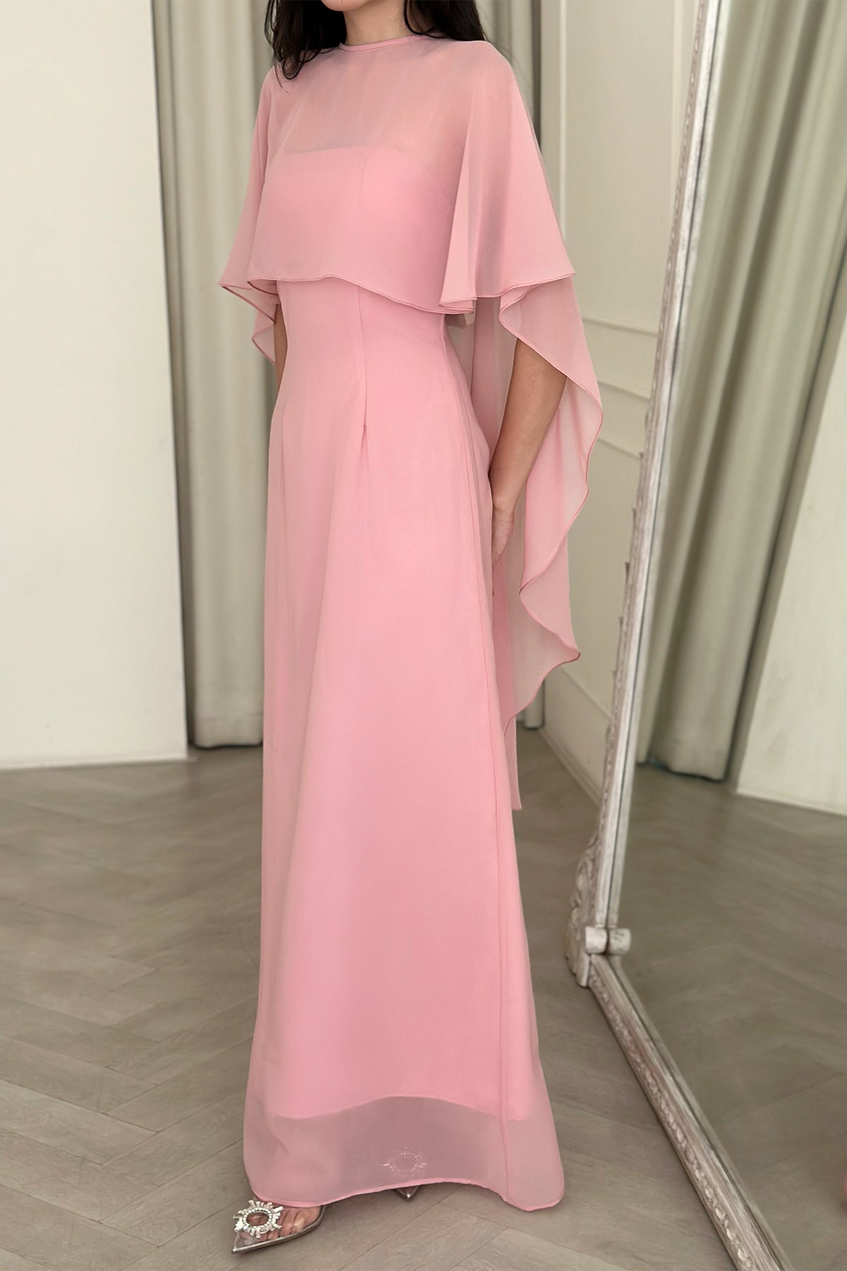 This dress is an elegant floor-length gown in a soft blush pink shade. It features a simple round neckline and a flowy chiffon overlay that drapes gracefully over the shoulders, creating a cape-like effect. The overlay adds movement and sophistication, while the dress underneath has a clean, fitted silhouette that elongates the figure. The hemline is slightly sheer at the bottom, giving a delicate and airy finish. This design is graceful and refined, making it ideal for formal occasions, evening events, or bridesmaid attire.