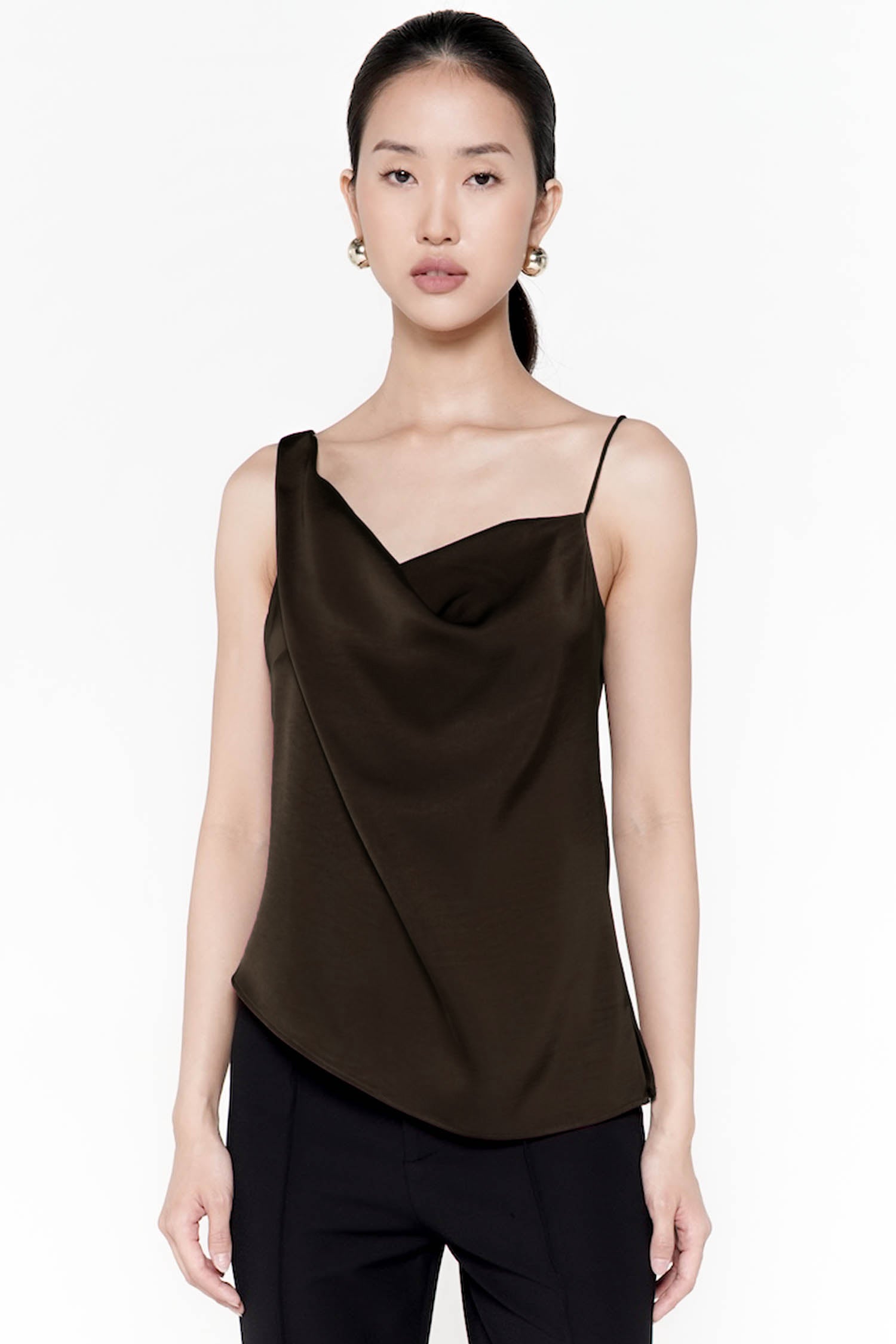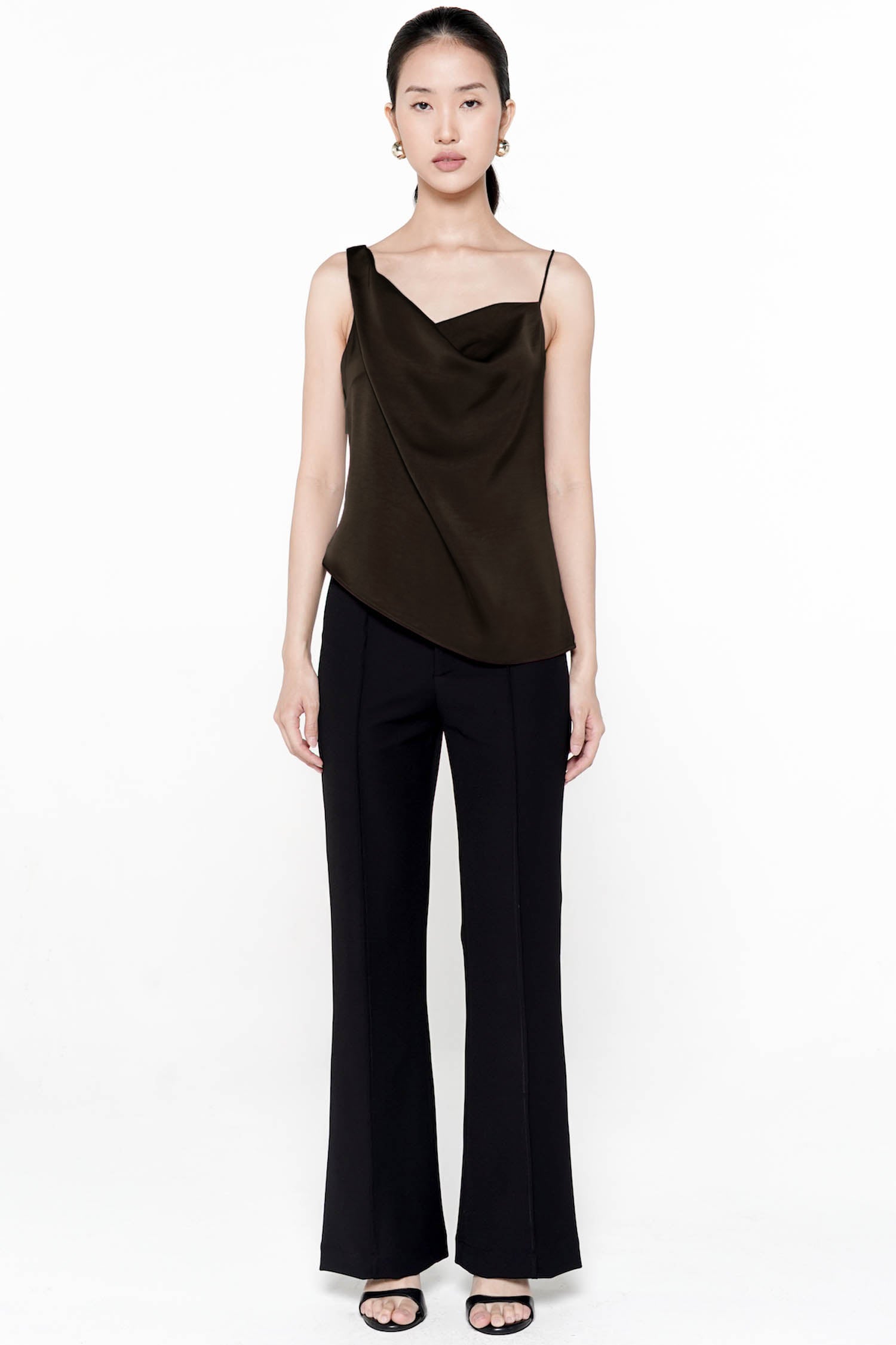 The Mykonos Asymmetrical Top is a study in fluid elegance, crafted from lustrous satin that cascades beautifully across the body with every movement. Defined by its softly draped cowl neckline and unique asymmetrical hem, the piece exudes a refined sensuality while maintaining an air of effortless sophistication. Delicate shoulder straps frame the shoulders with minimalist grace, and the gentle fold at the back enhances its sculptural, liquid-like silhouette. Available in deep wine and classic black, the Mykonos Asymmetrical Top offers a modern, feminine allure—perfect for elevated evenings or polished day-to-night dressing.
