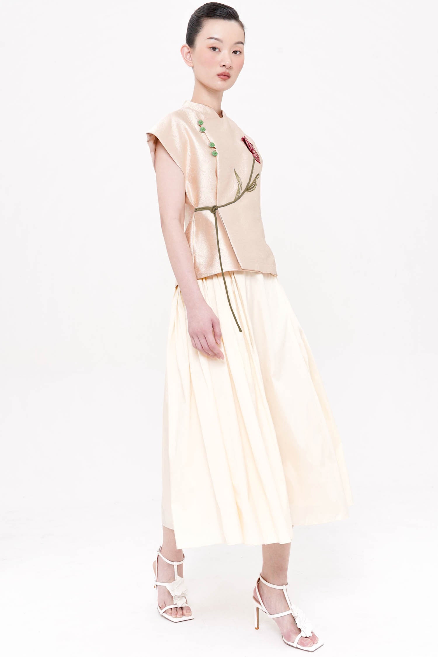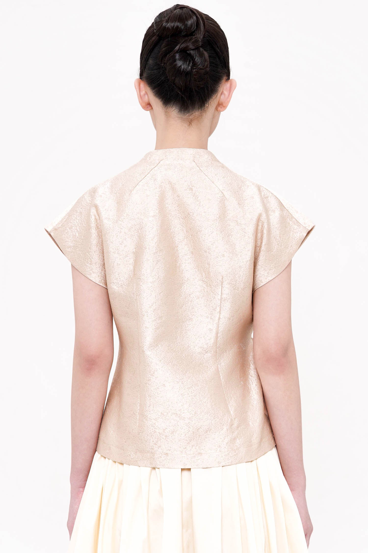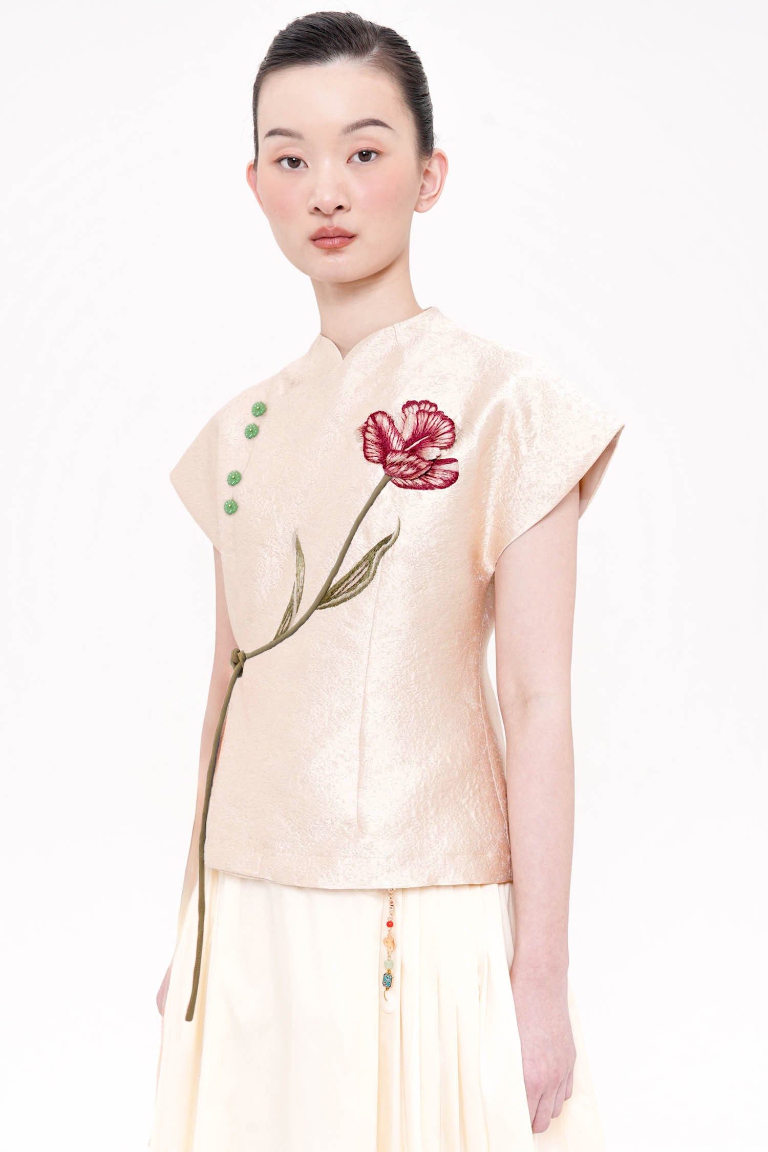 The Ning Wrap Top is a graceful expression of modern refinement, crafted from softly textured jacquard that offers both structure and fluidity. Designed with a clean wrap-inspired silhouette, it is accentuated by delicate floral embroidery that flows organically across the front, creating a subtle focal point rich in symbolism and artistry. The gently sculpted shoulders and adjustable tie detail define the waist with ease, while the refined finish allows the piece to transition seamlessly from daytime elegance to elevated occasions. Available in Nude and Blue.