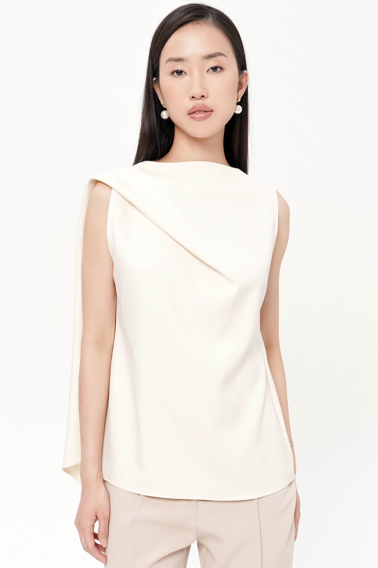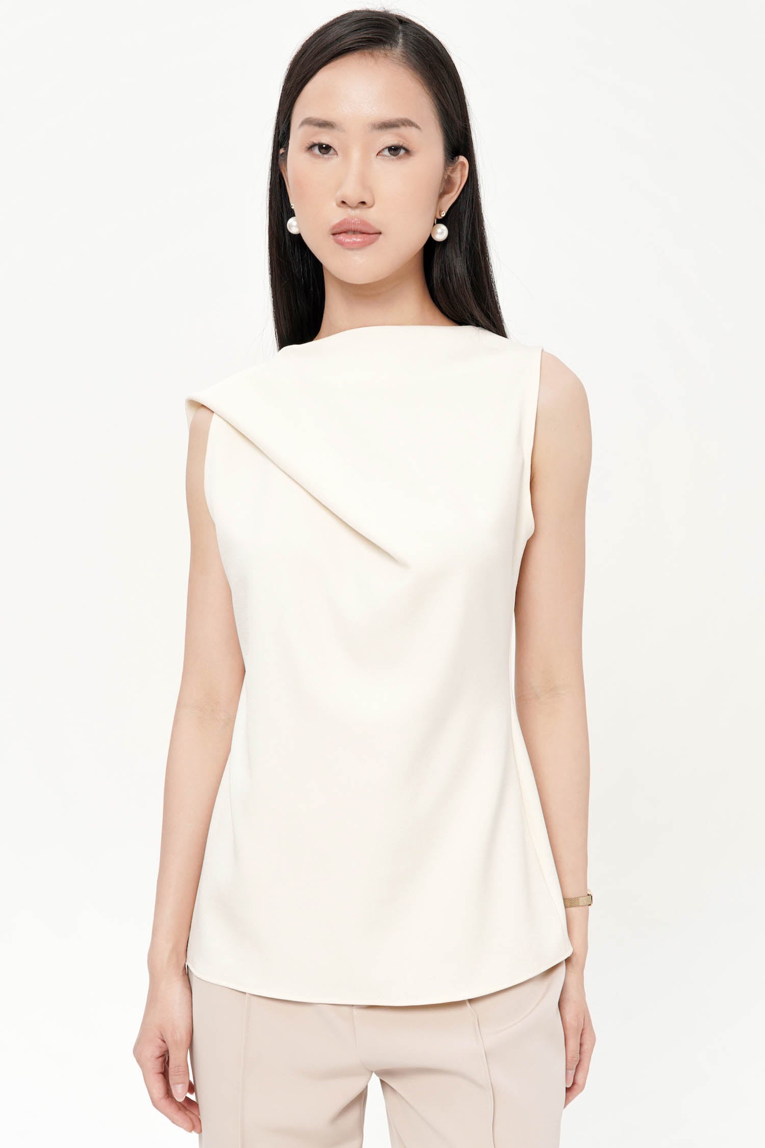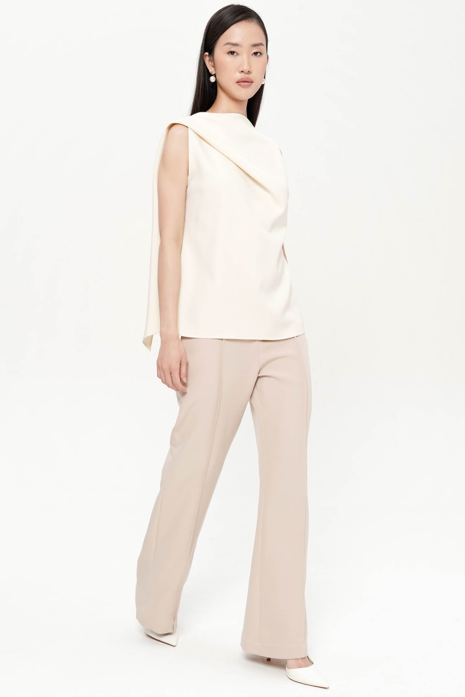 The Oaken Drape Top is a study in modern elegance, crafted from refined semi-wool that offers a structured yet fluid drape. Its sculptural silhouette is defined by an artful asymmetrical overlay that cascades softly across the neckline and shoulder, creating a sense of quiet movement and architectural grace. The sleeveless cut enhances its clean, contemporary appeal, while the tailored fit ensures a polished finish that flatters effortlessly. Available in Ivory, Espresso, and Dark Grey, the Oaken Drape Top is a versatile statement piece, seamlessly elevating both tailored ensembles and understated separates with its timeless sophistication.