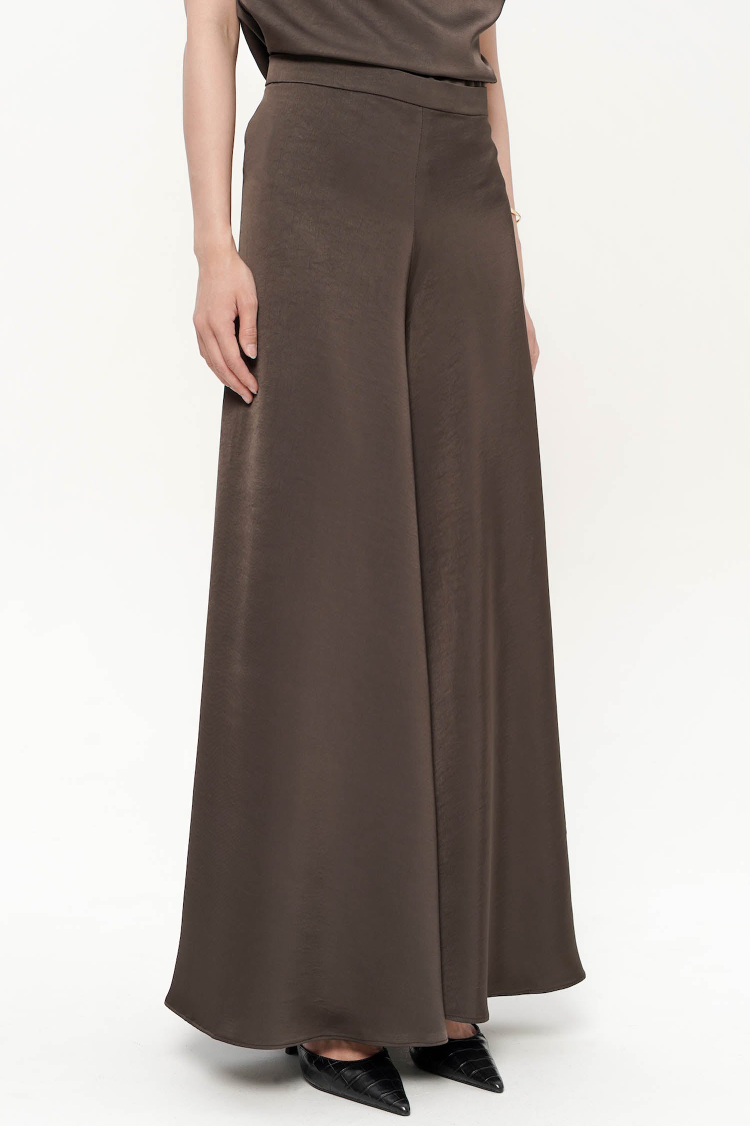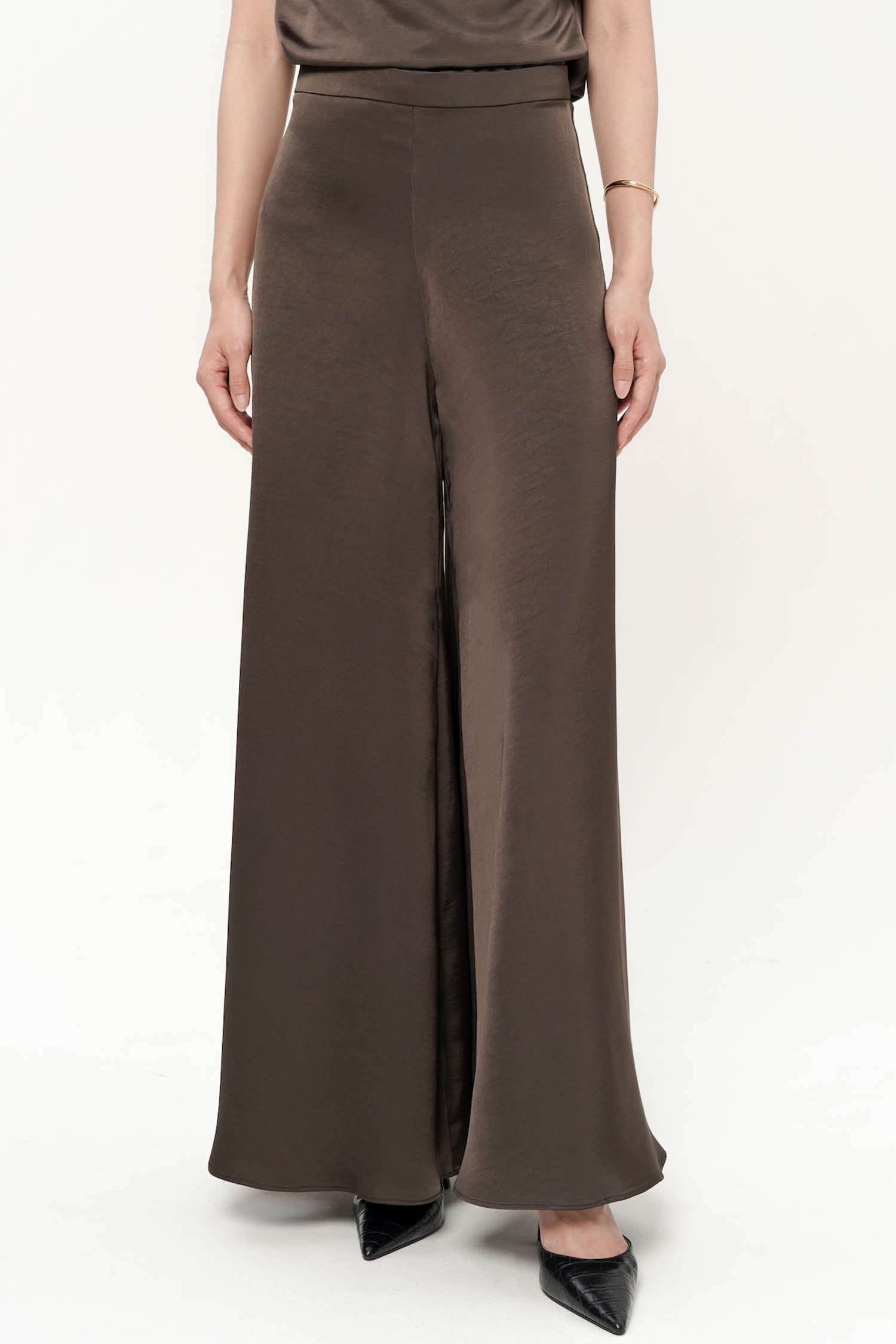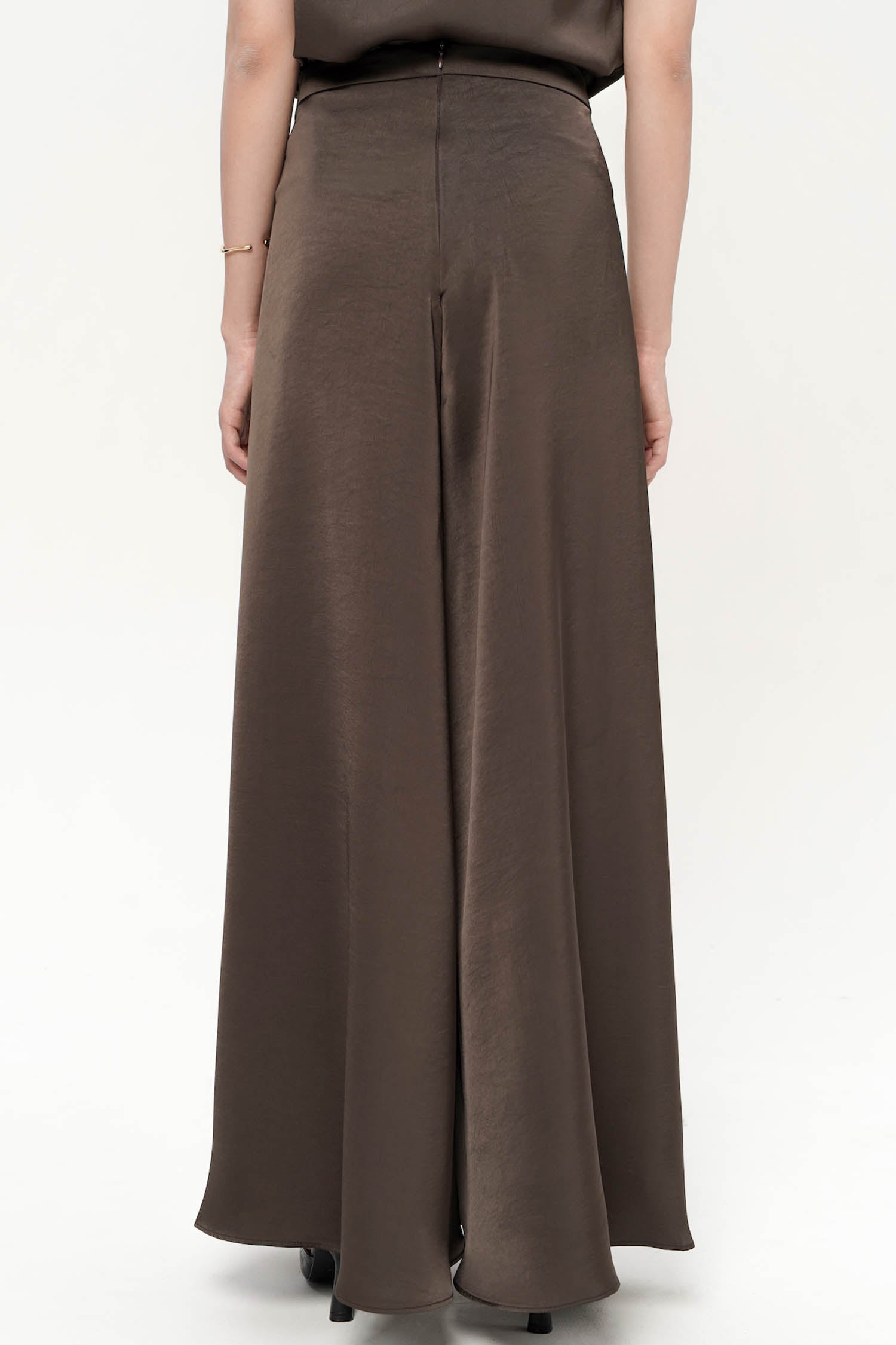 The Oriel Flare Pants embody understated luxury with their fluid silhouette and luminous satin silk finish. Designed to sit gracefully at the waist, they fall into a soft, elongated flare that moves with effortless elegance, creating a refined sense of motion with every step. The smooth, light-catching texture enhances their sophisticated appeal, while the clean, minimal construction ensures a timeless versatility suited for both formal and elevated everyday wear. Available in Cocoa and White, the Oriel Flare Pants are a statement of quiet refinement, perfect for pairing with tailored tops or delicate draped silhouettes.