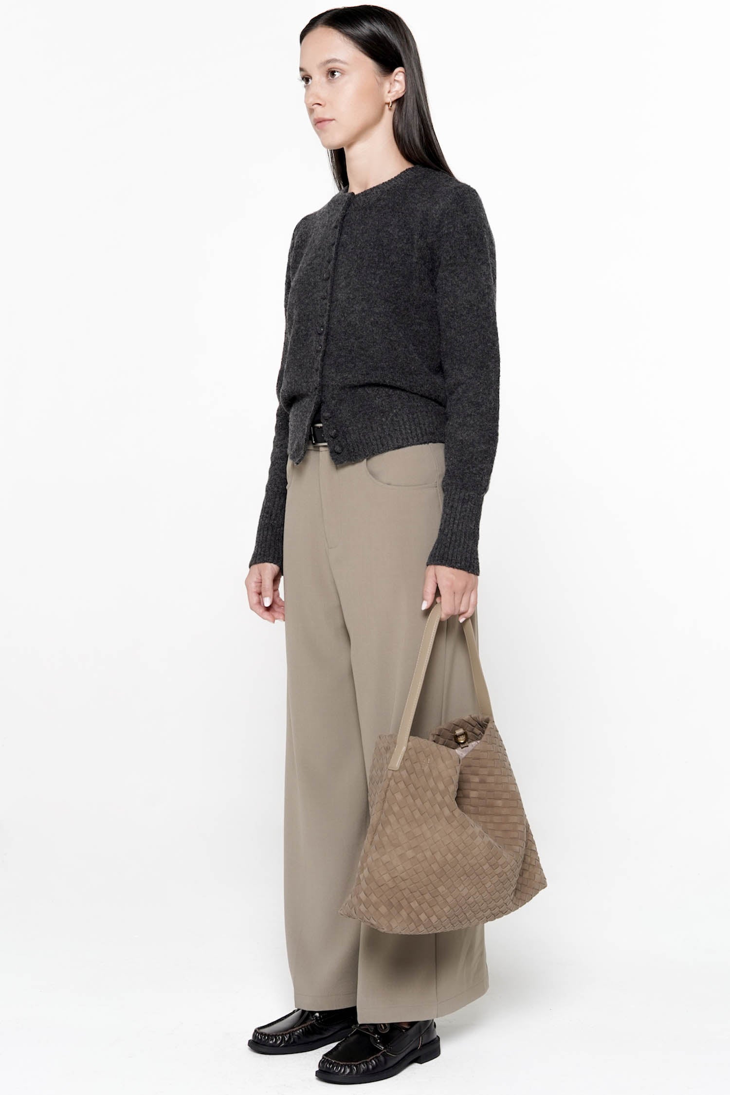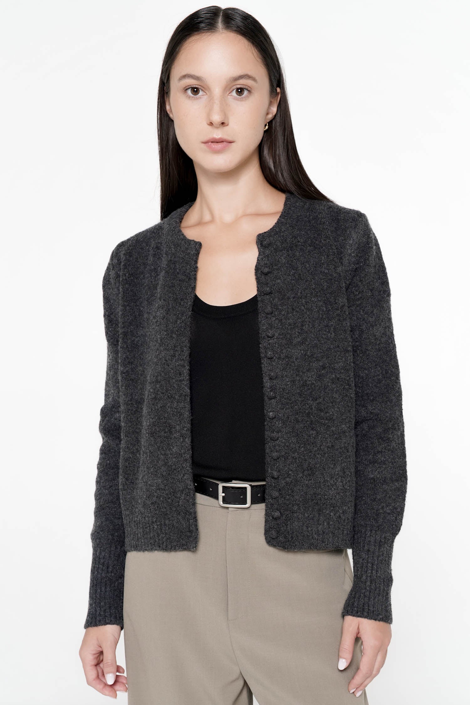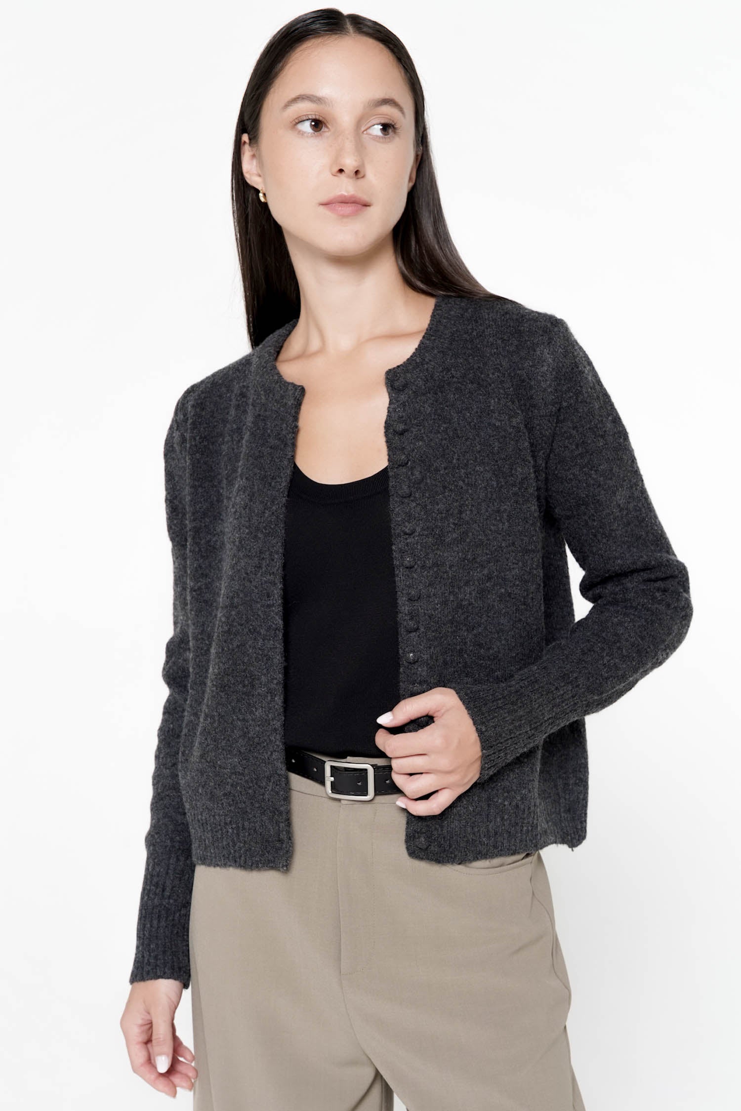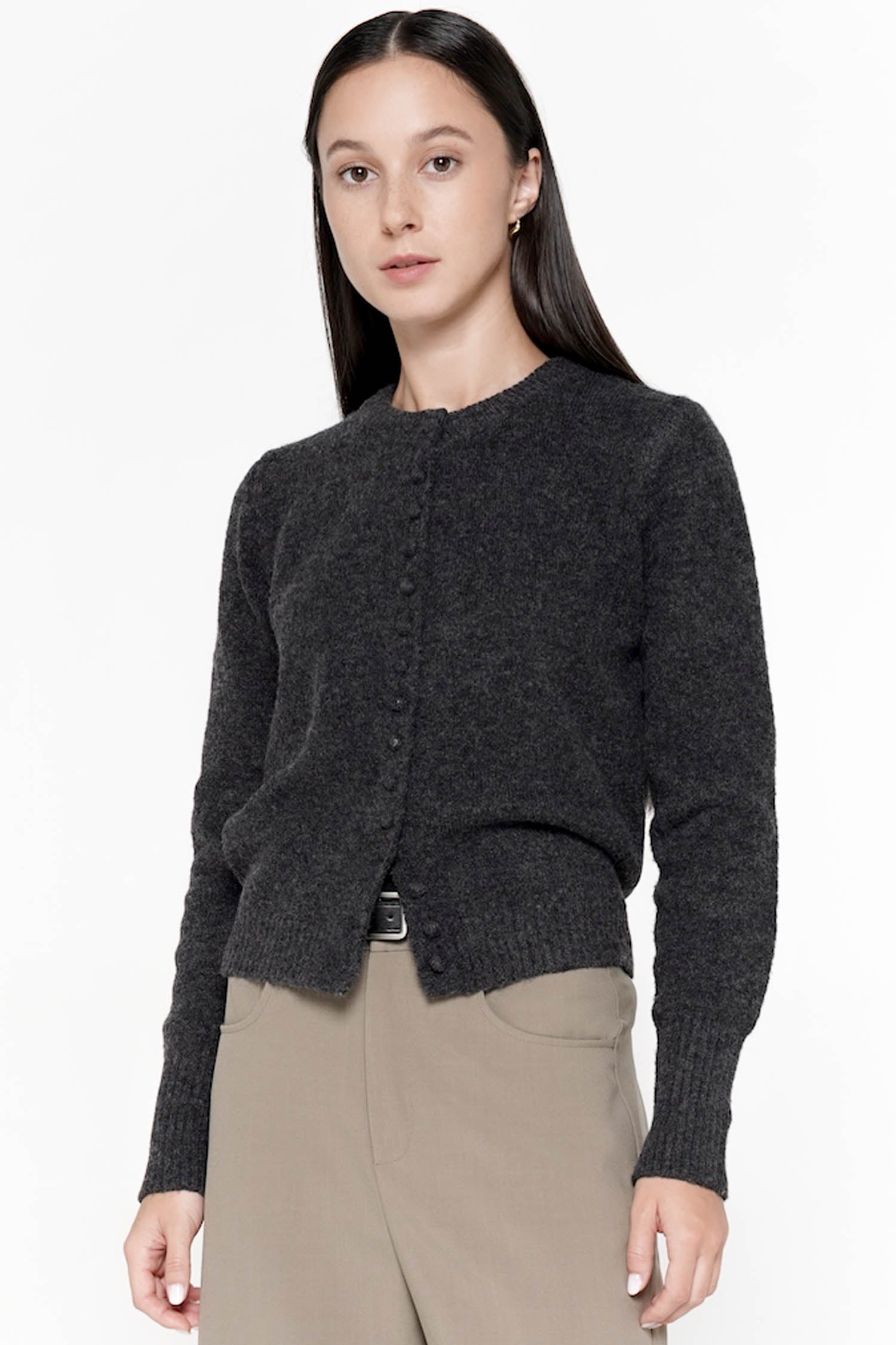 The Raina Cardigan is a timeless essential crafted from a soft polyester knit that offers warmth, comfort, and enduring elegance. Designed with a refined round neckline and adorned with a row of delicate, fabric-covered buttons, it balances minimalism with subtle, textural charm. Its clean silhouette and gently fitted proportions make it effortlessly versatile—layer it over everyday basics for understated polish or pair it with tailored pieces for a more elevated look. Finished with ribbed hems for a touch of structure, the Raina Cardigan is an elegant wardrobe staple available in olive, broken white, and espresso.