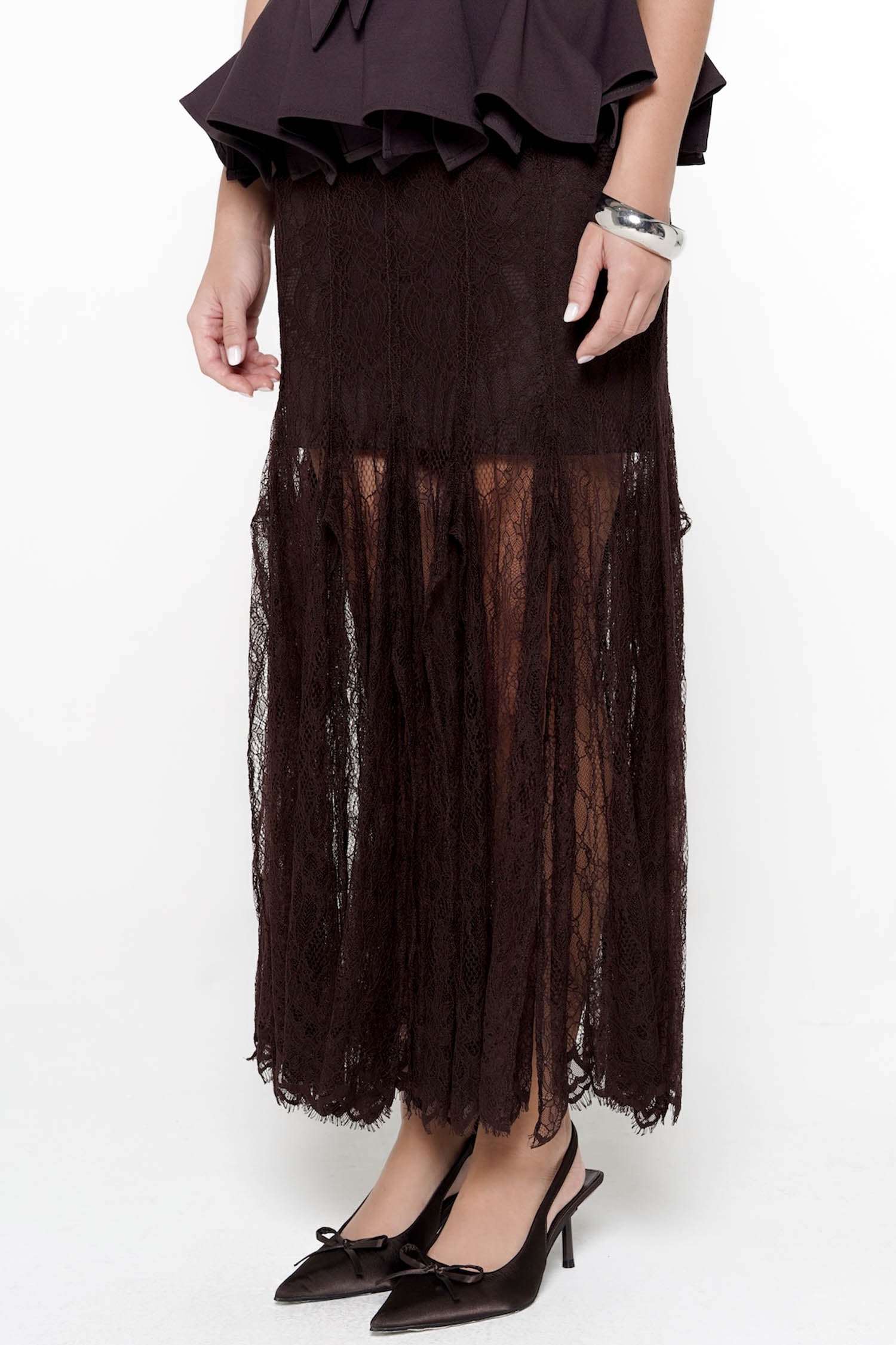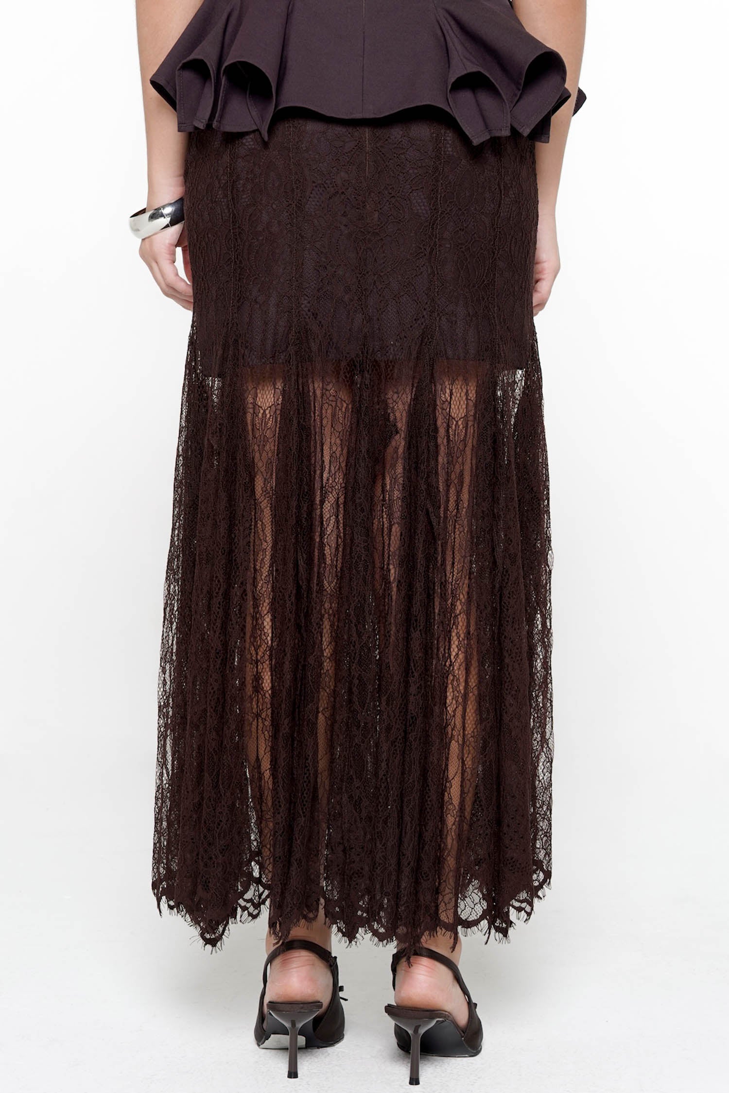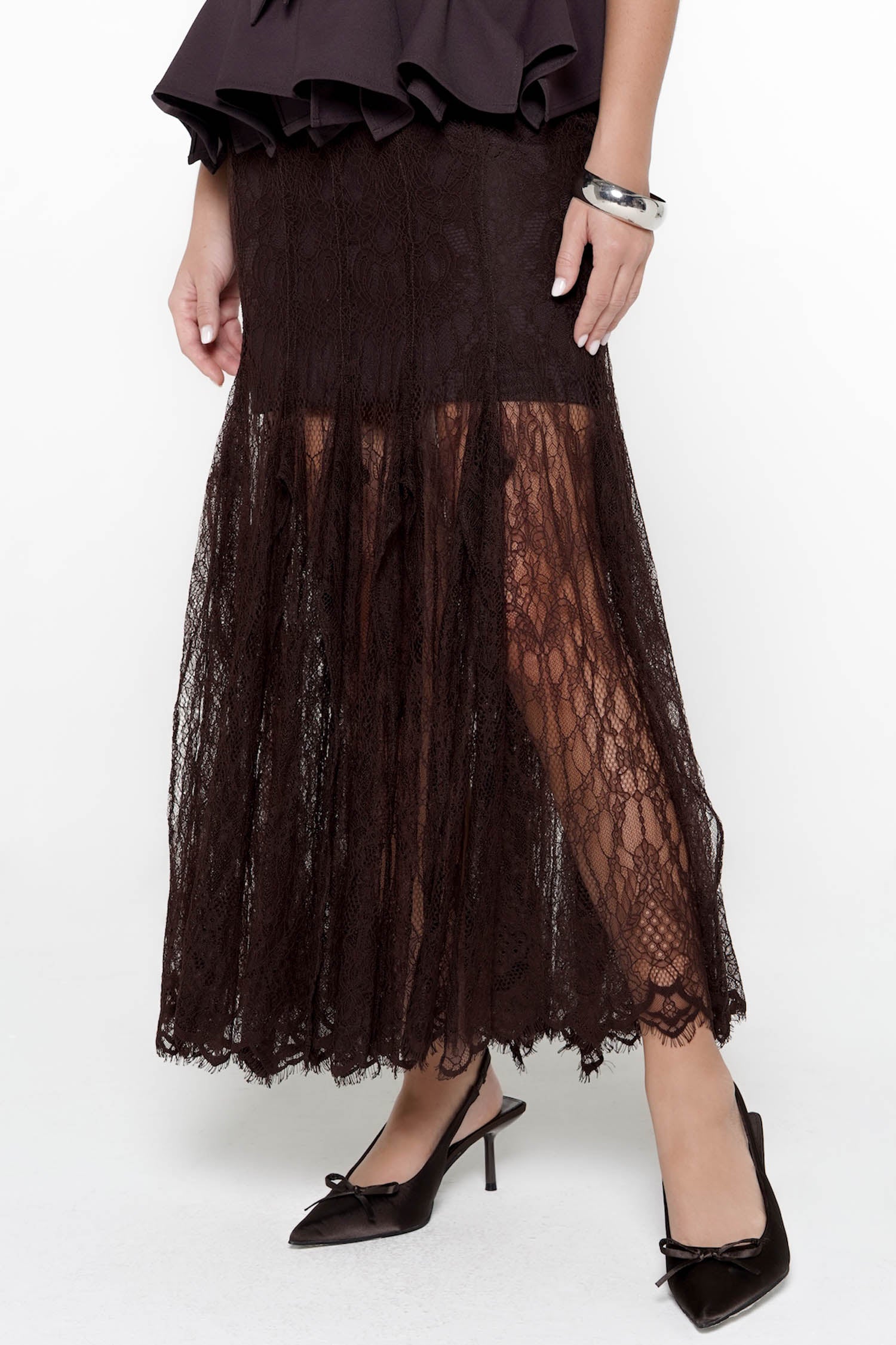 See-through midi skirt cut from Chantilly lace with basic mini skirt inner. Best paired with Viola Top Espresso.