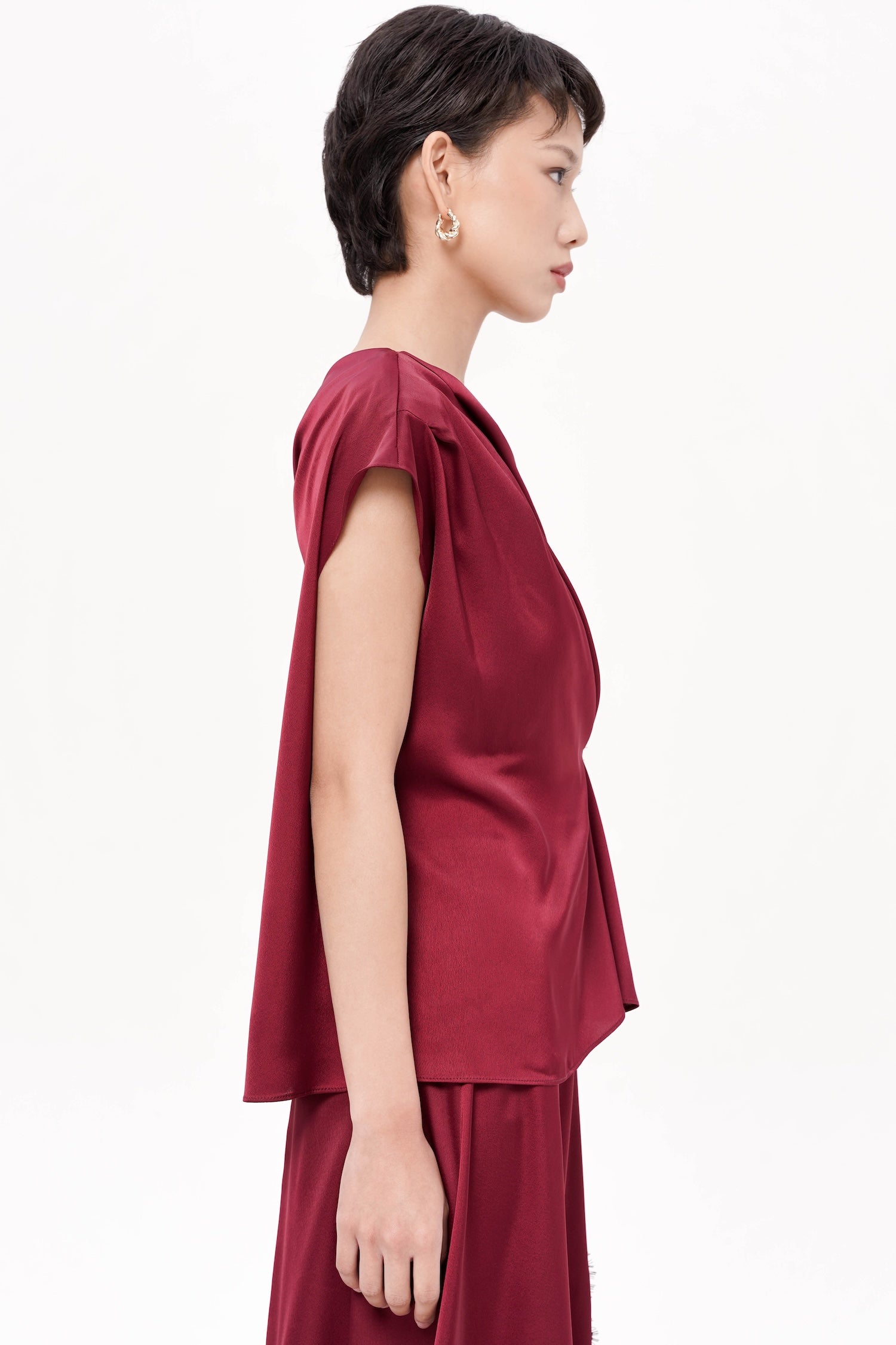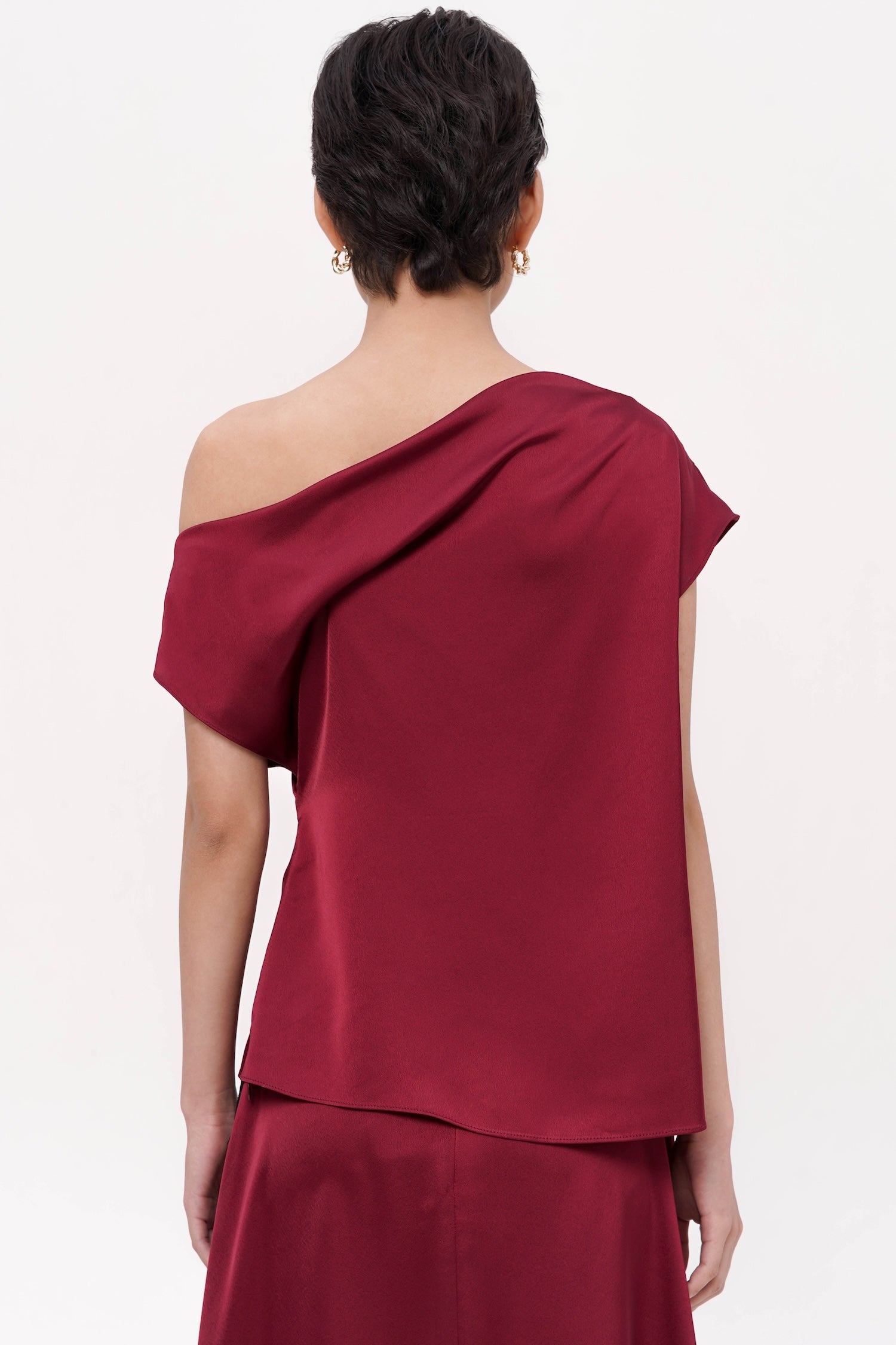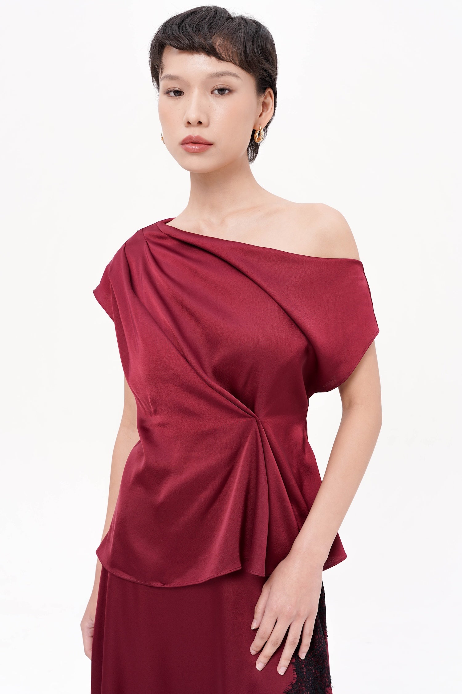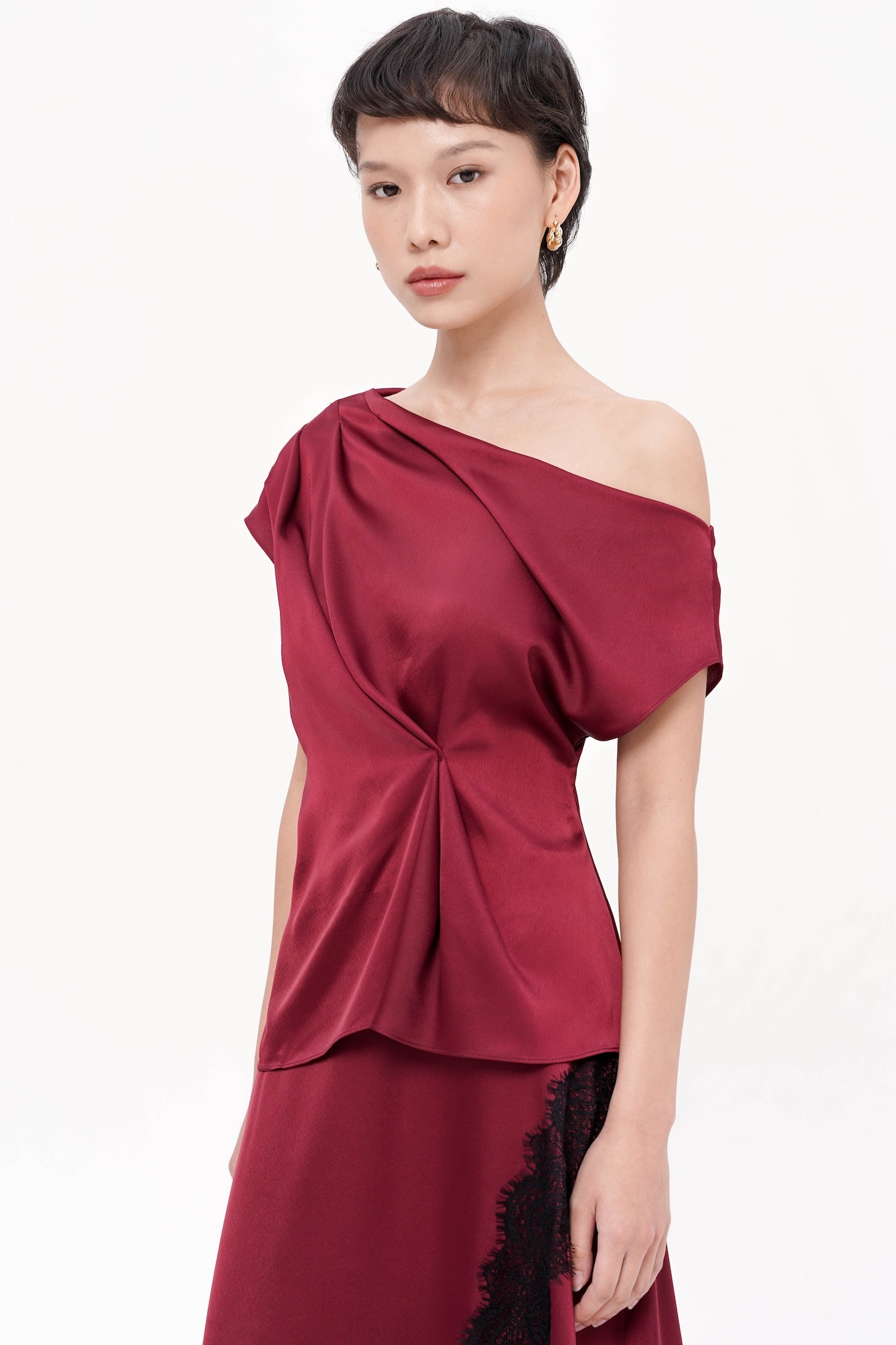 The Richell Asymmetrical Top, crafted from smooth, luminous satin, delivers an effortlessly refined silhouette through its sculptural draping and one-shoulder neckline that frames the upper body with modern elegance. Thoughtfully designed with a soft twist detail that gathers at the waist, the top creates a gentle, flattering contour while maintaining fluid movement throughout. Its clean lines, understated sheen, and elevated asymmetry make it a versatile statement piece—equally suited for formal occasions or sophisticated evenings out. Available in two timeless shades: Wine and Black.