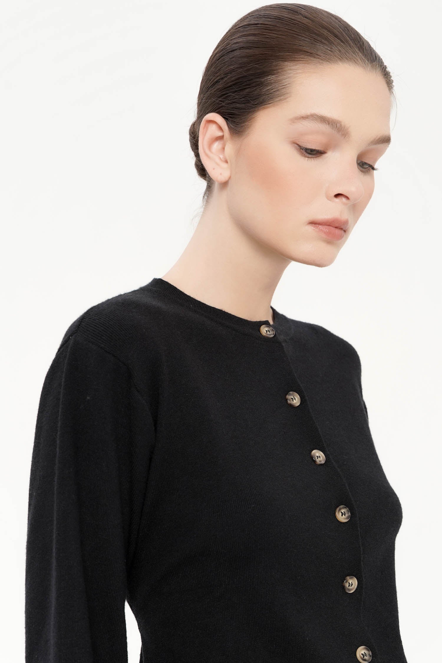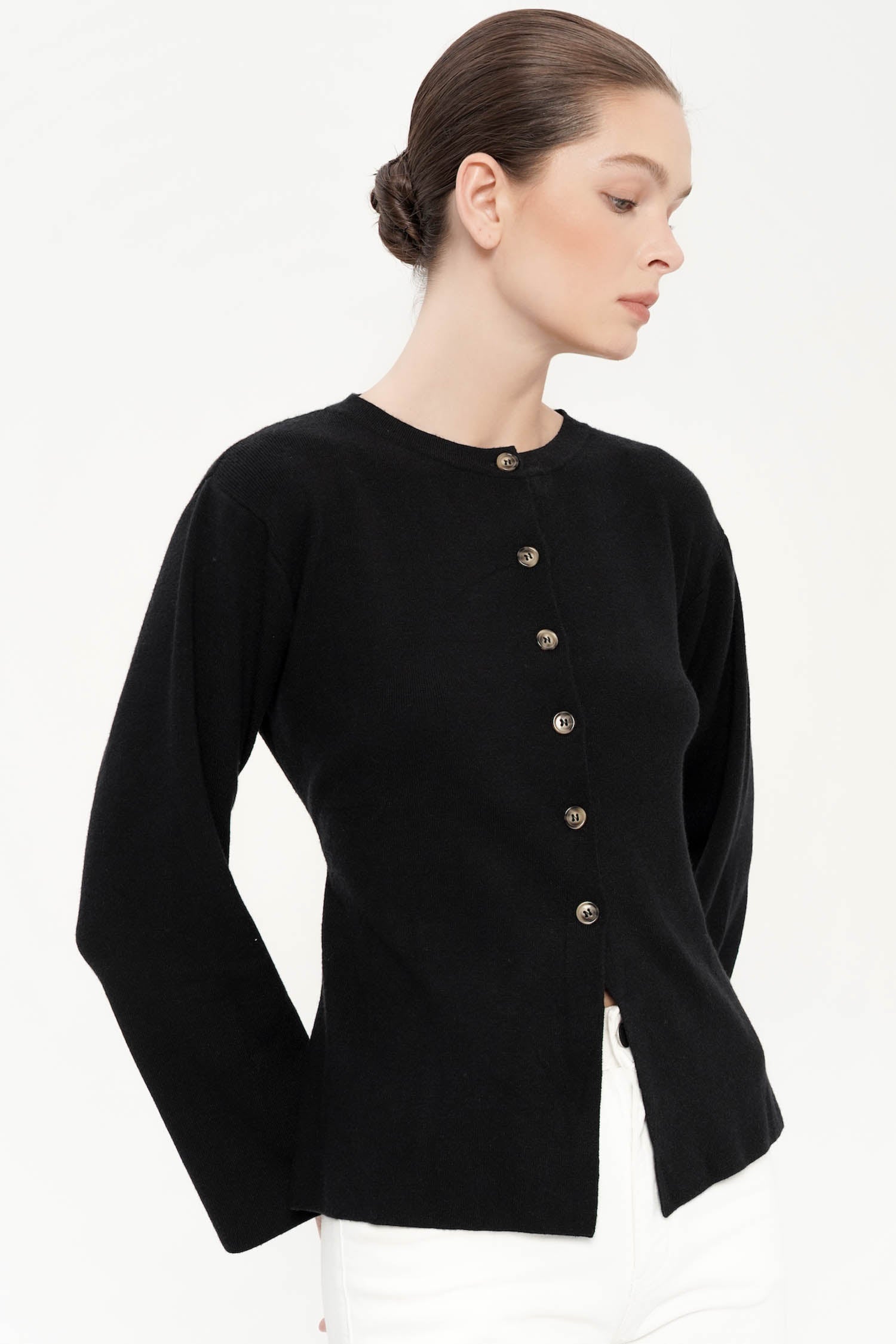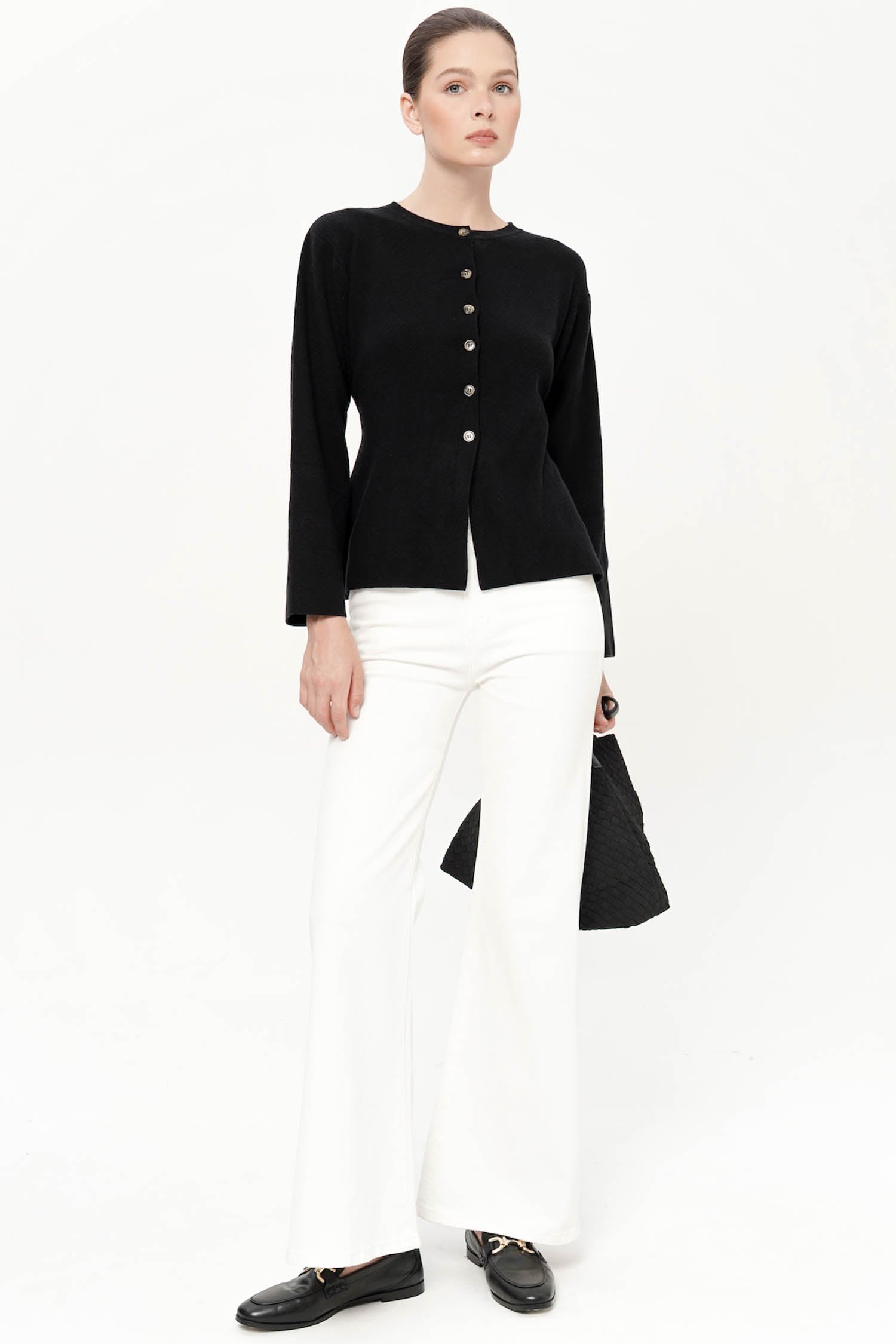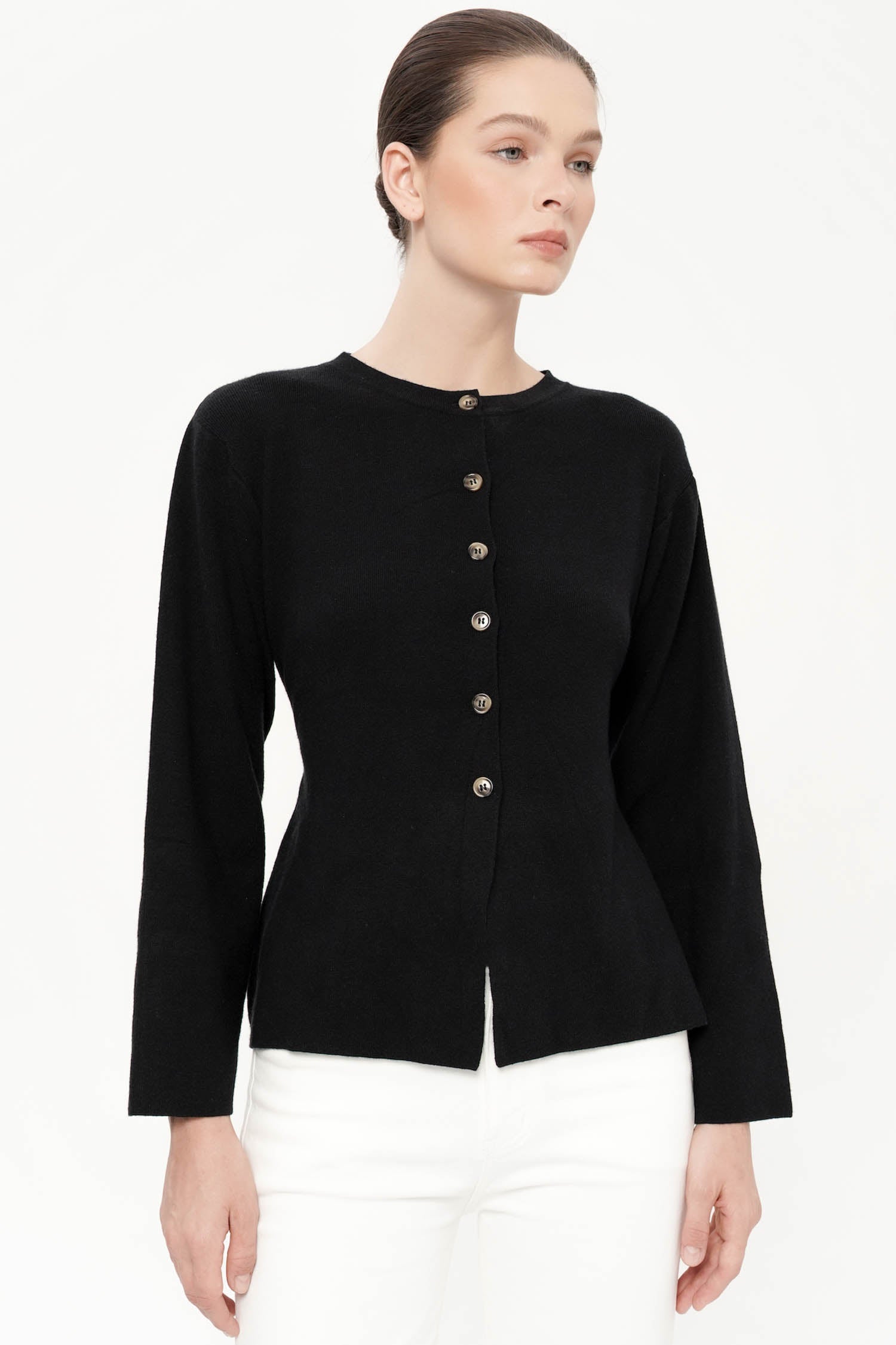The Roseau Cinched Knit Top offers a refined balance of comfort and elegance, crafted from soft cotton knit that drapes gently against the body while maintaining a polished silhouette. Designed with a clean round neckline and delicate front button detailing, it exudes understated sophistication, while the subtle cinched waist at the back creates a flattering, feminine shape. The long sleeves and slightly flared hem lend a graceful structure, making it an effortless piece for both casual refinement and elevated everyday wear. Available in Black, Wine, and Dark Grey, the Roseau Cinched Knit Top is a timeless essential that seamlessly blends versatility with quiet luxury.