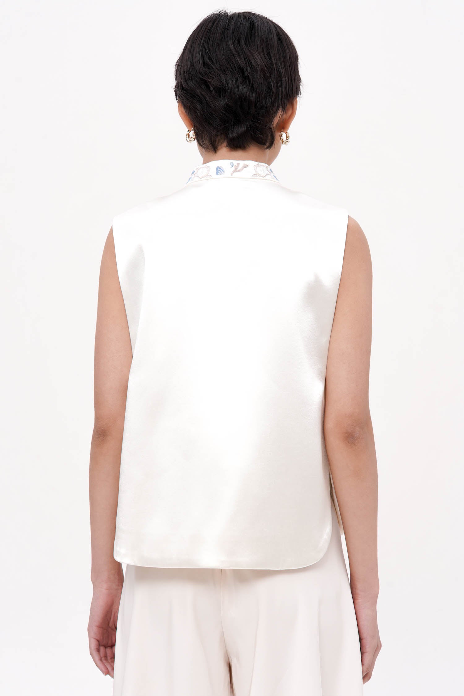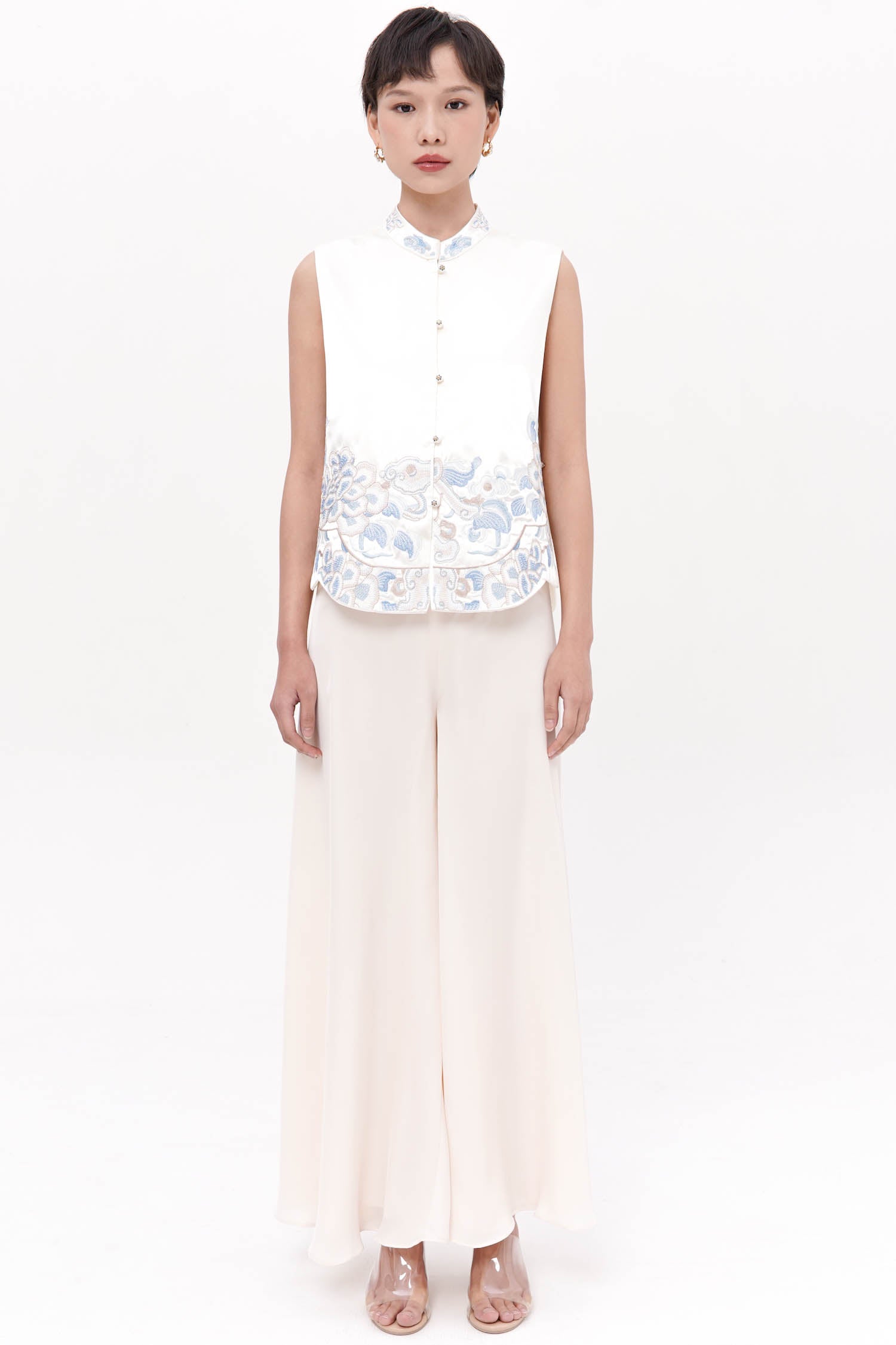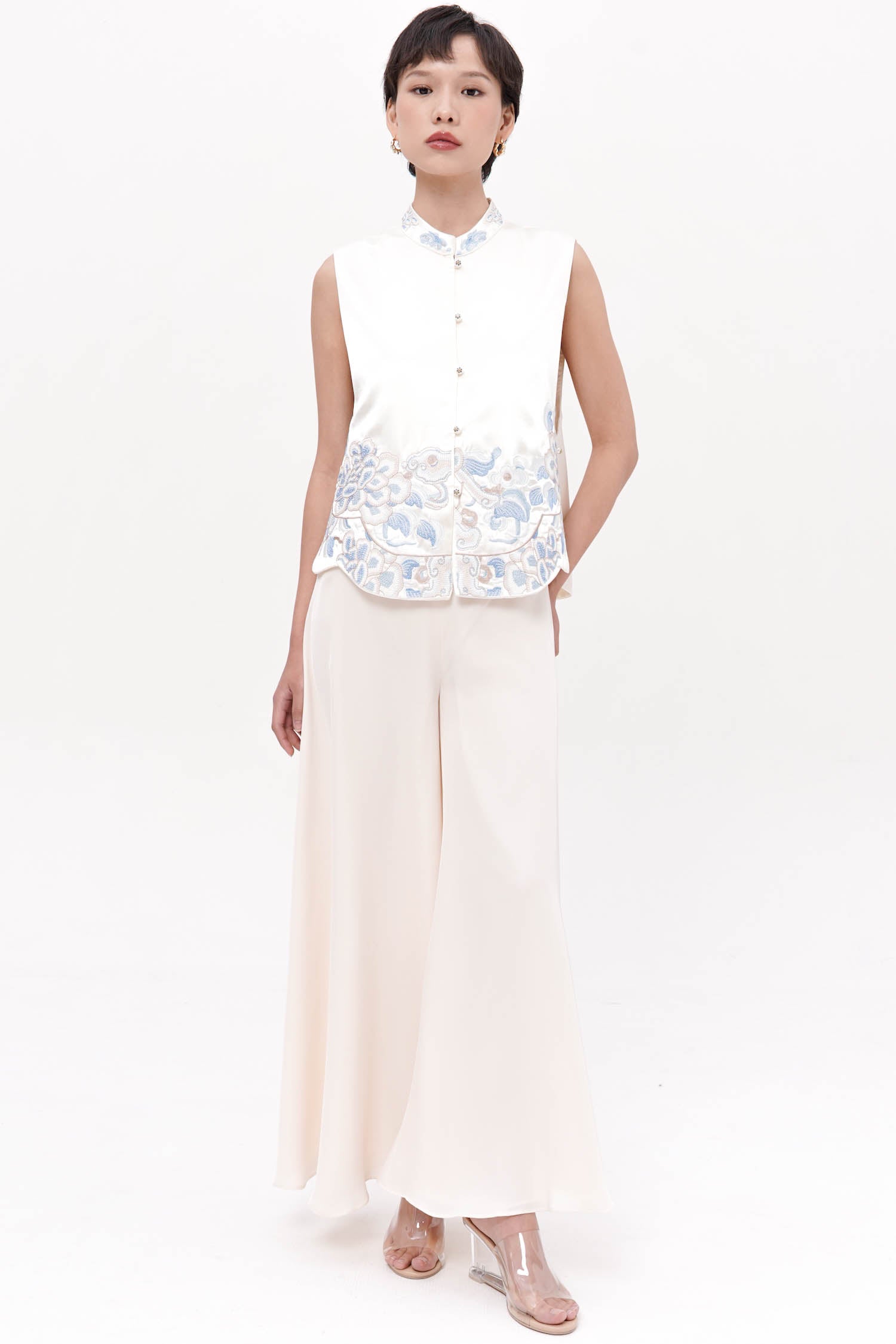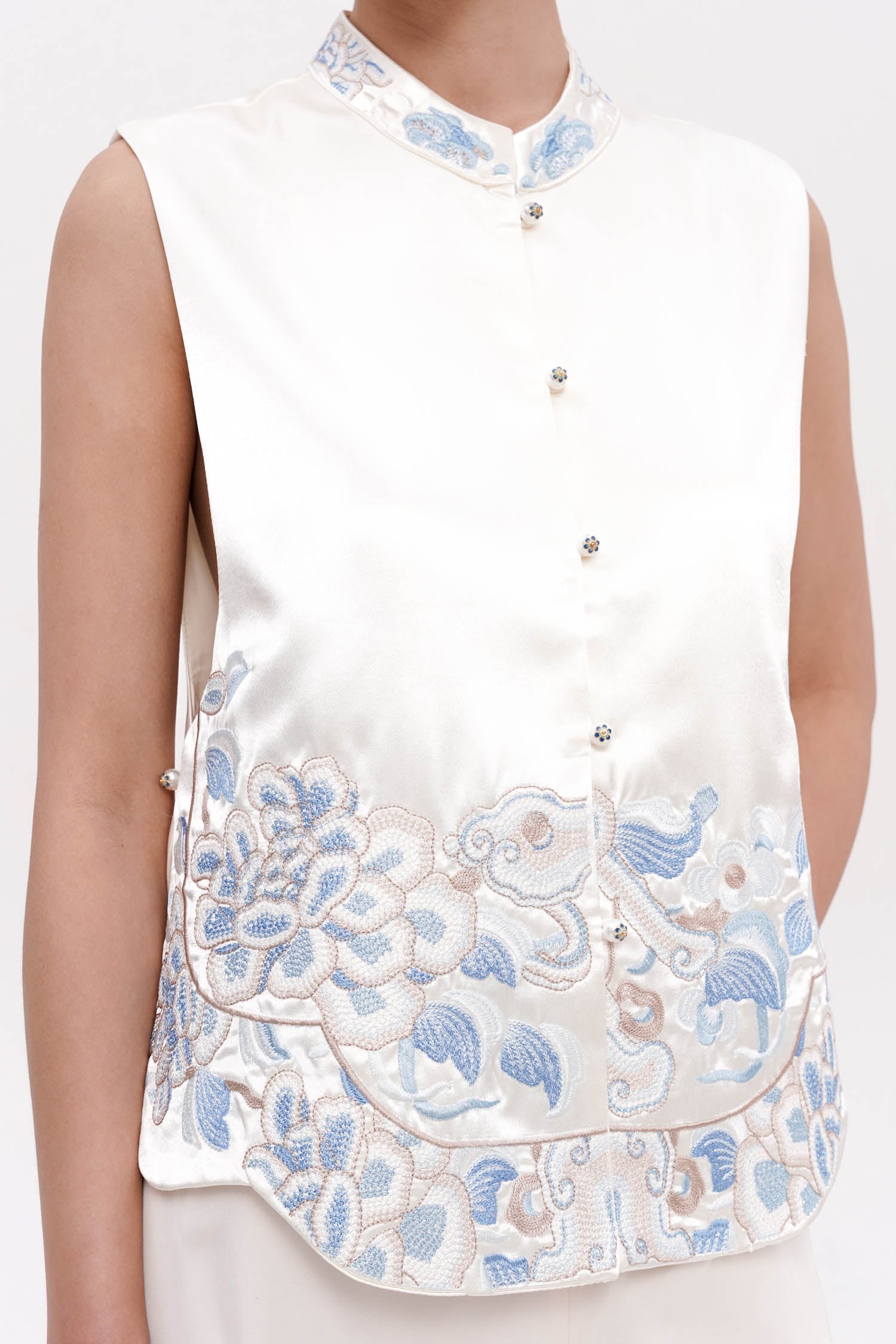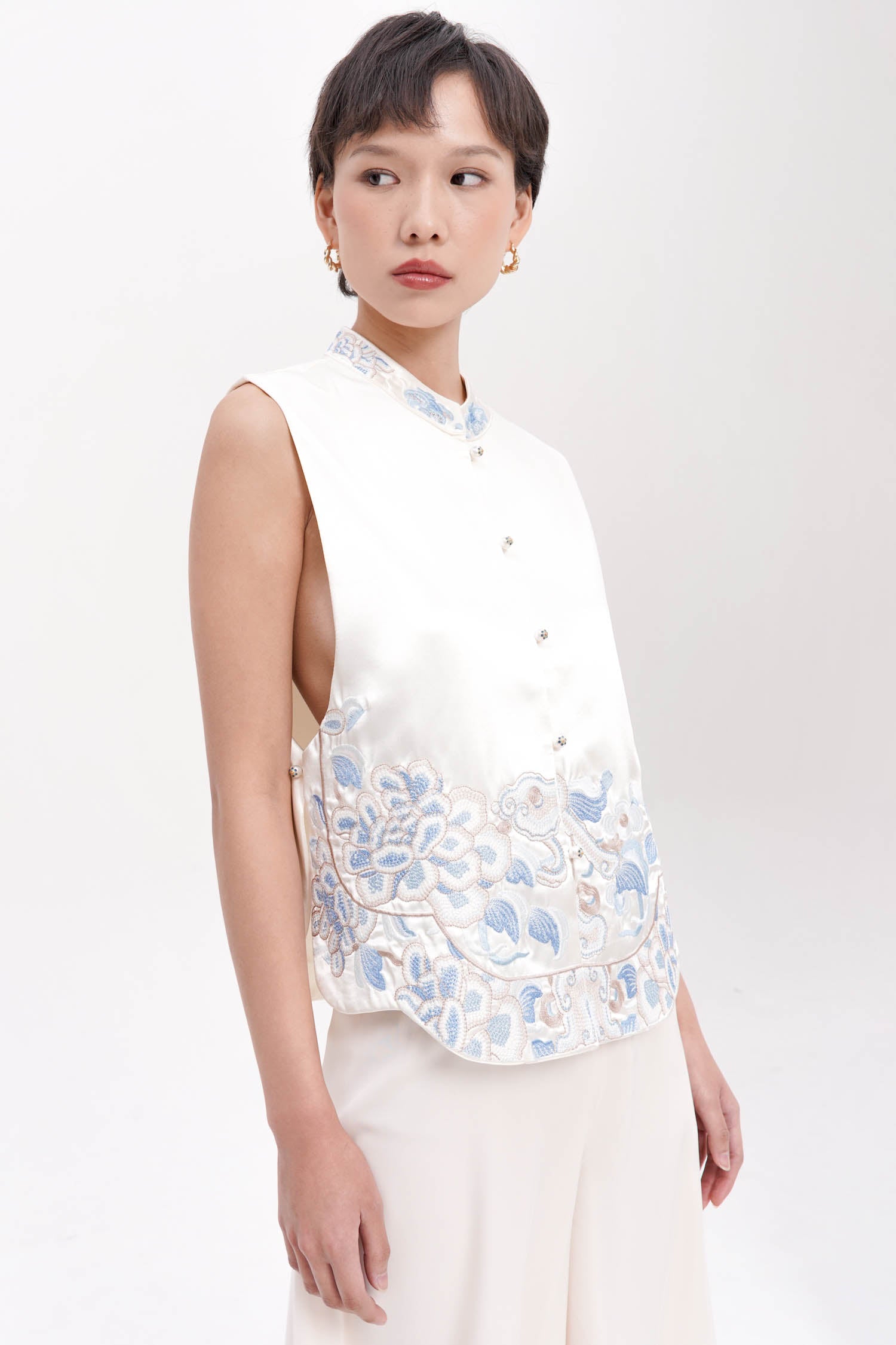 The Ruhai Qipao Vest in White-Blue captures a d...