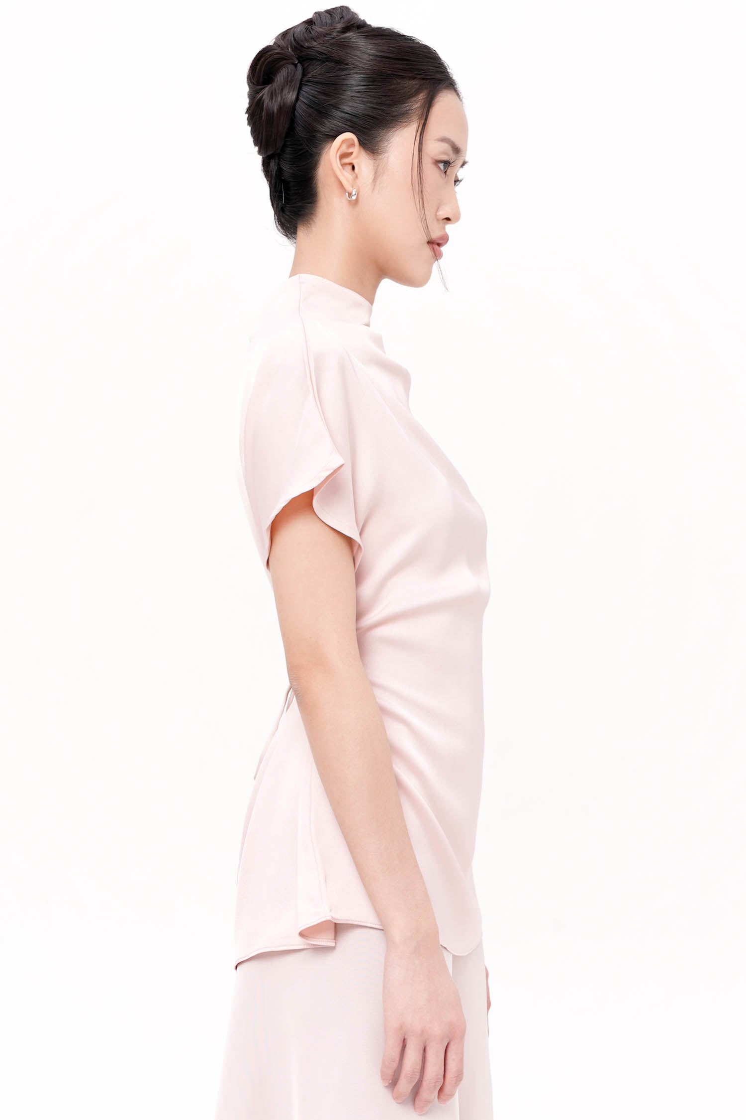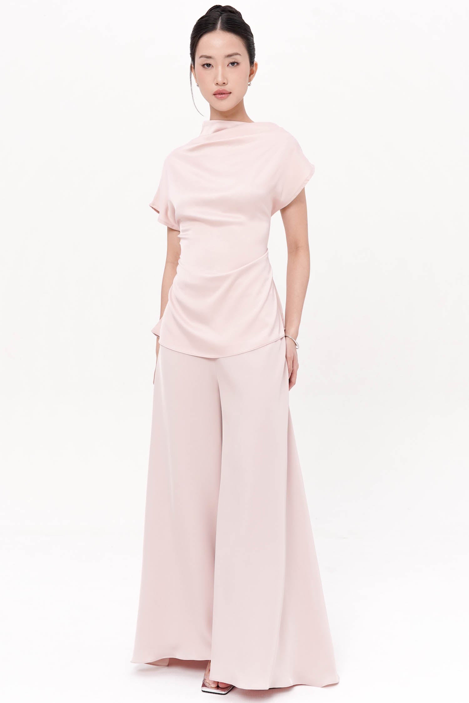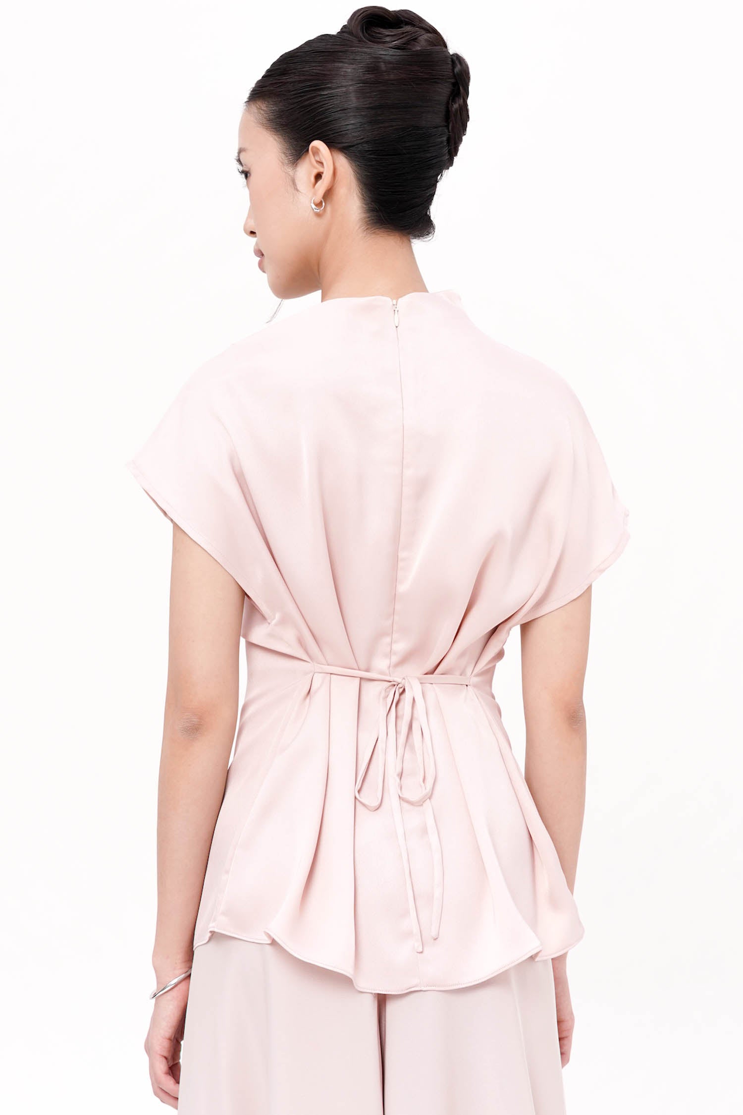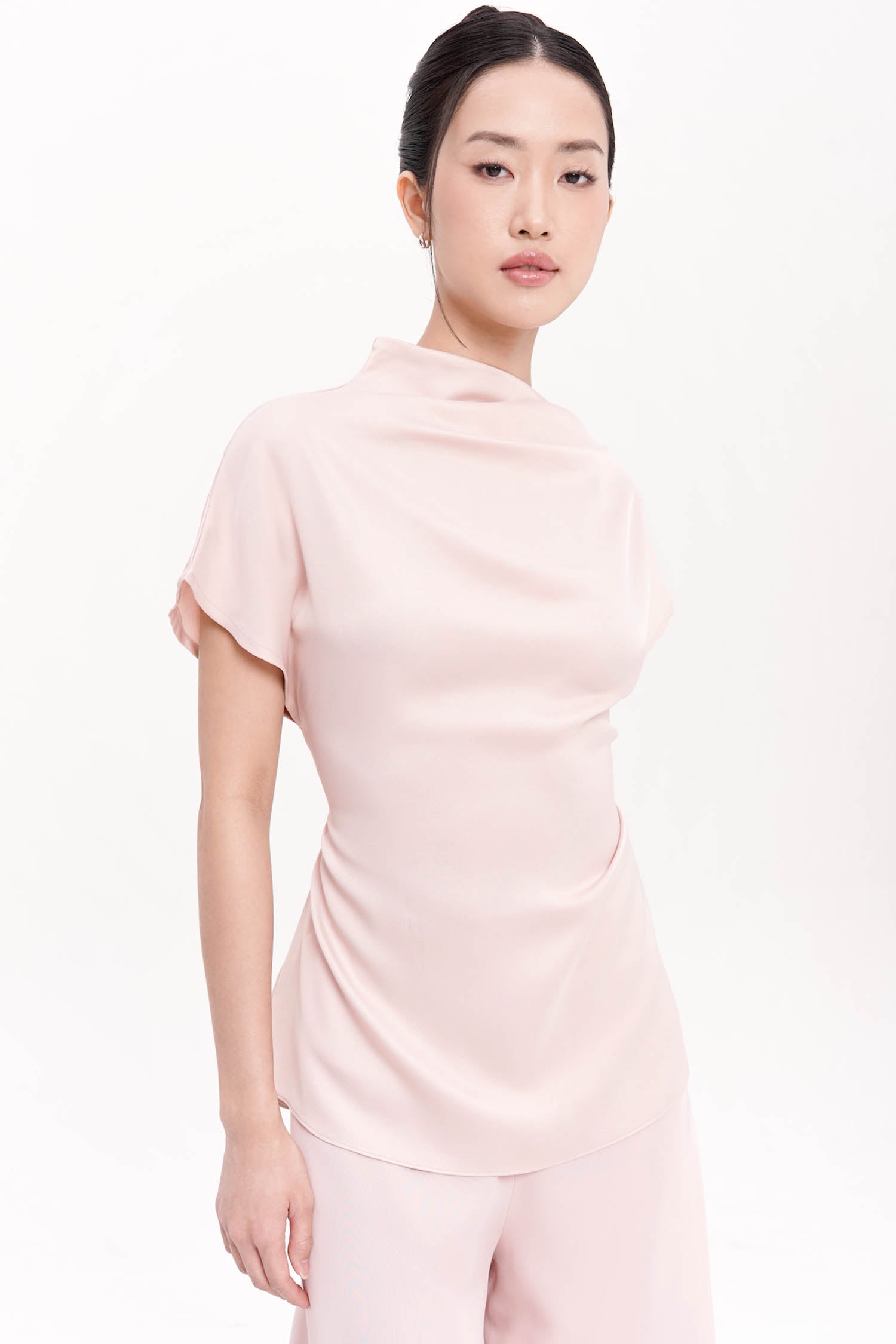 The Salomi Drape Blouse is a refined expression of soft elegance, crafted from luxurious satin that drapes fluidly across the body with an effortless, sculpted grace. Featuring a gentle high neckline that cascades into subtle asymmetrical folds, this design highlights delicate movement while maintaining a clean, feminine silhouette. Its flutter sleeves and thoughtfully placed side gathers create a flattering contour, complemented by a slender back tie that allows for a customizable fit. Available in blush and mint, the Salomi Drape Blouse brings a polished serenity to any wardrobe, perfect for both elevated daytime dressing and sophisticated evening ensembles.
