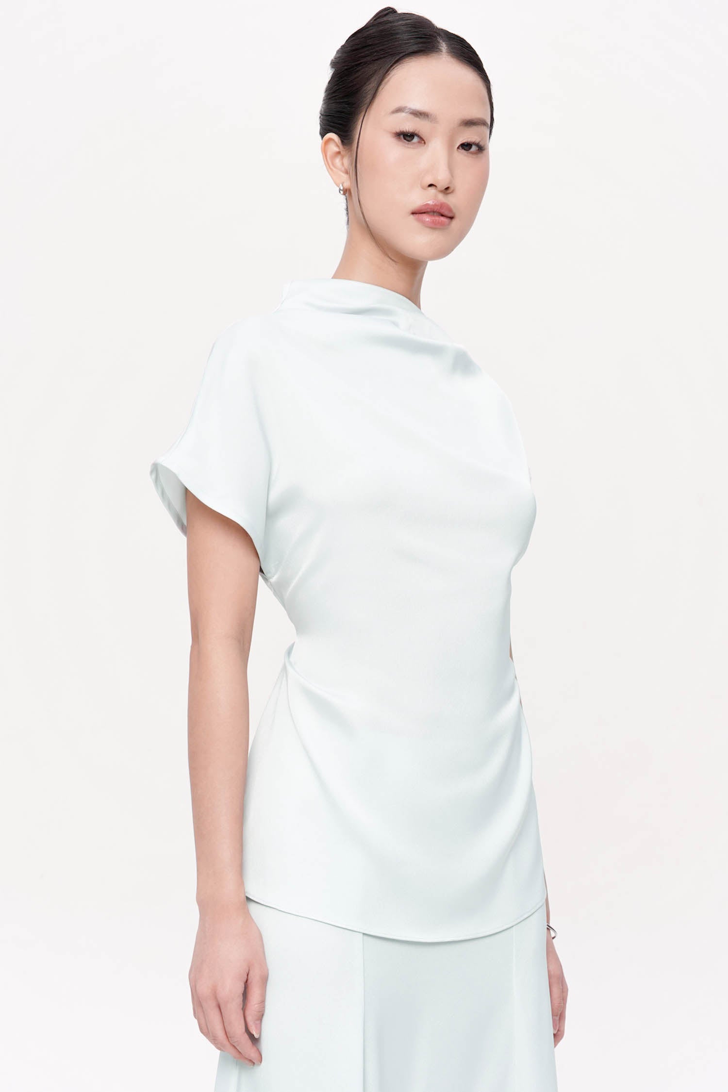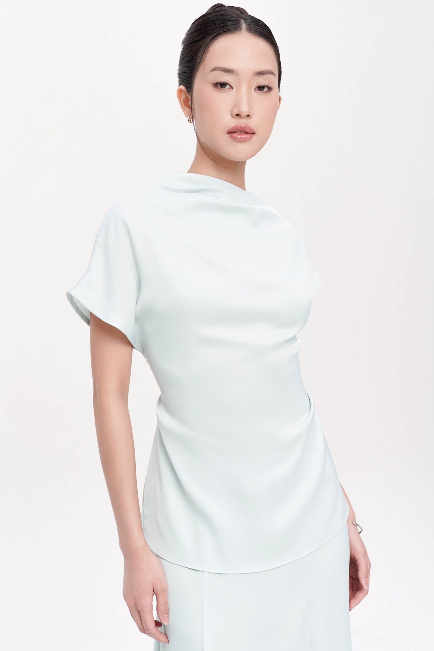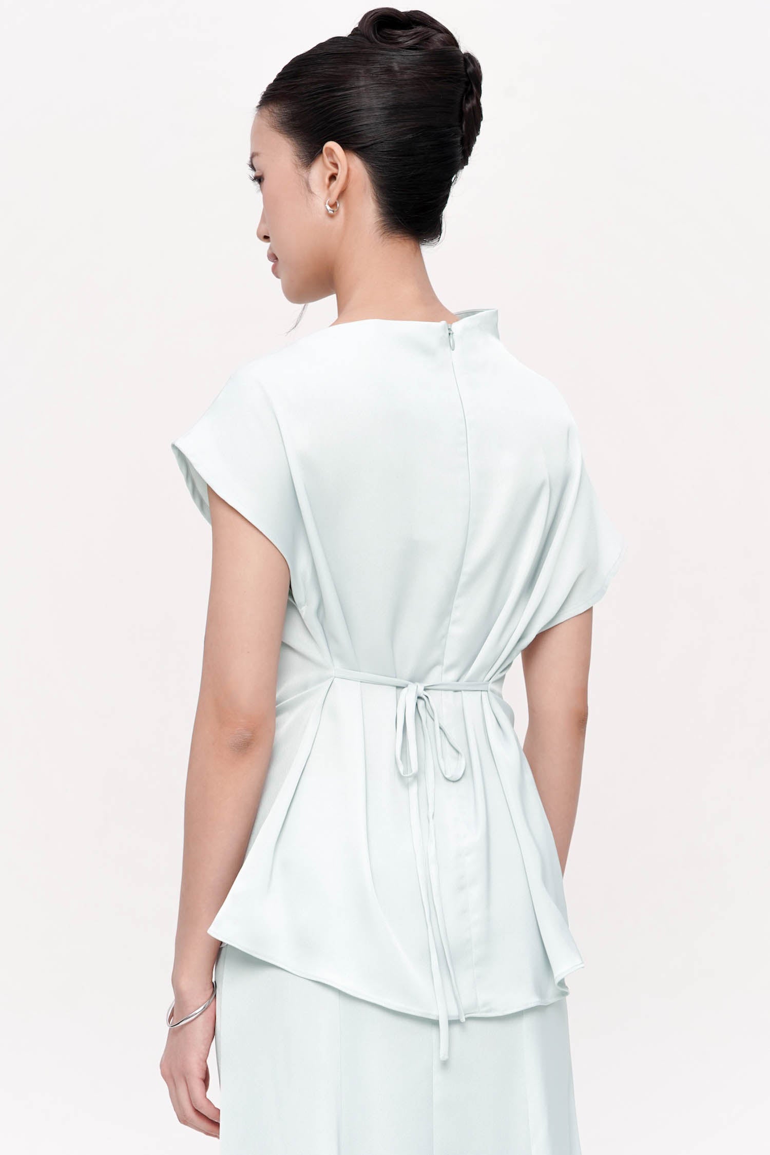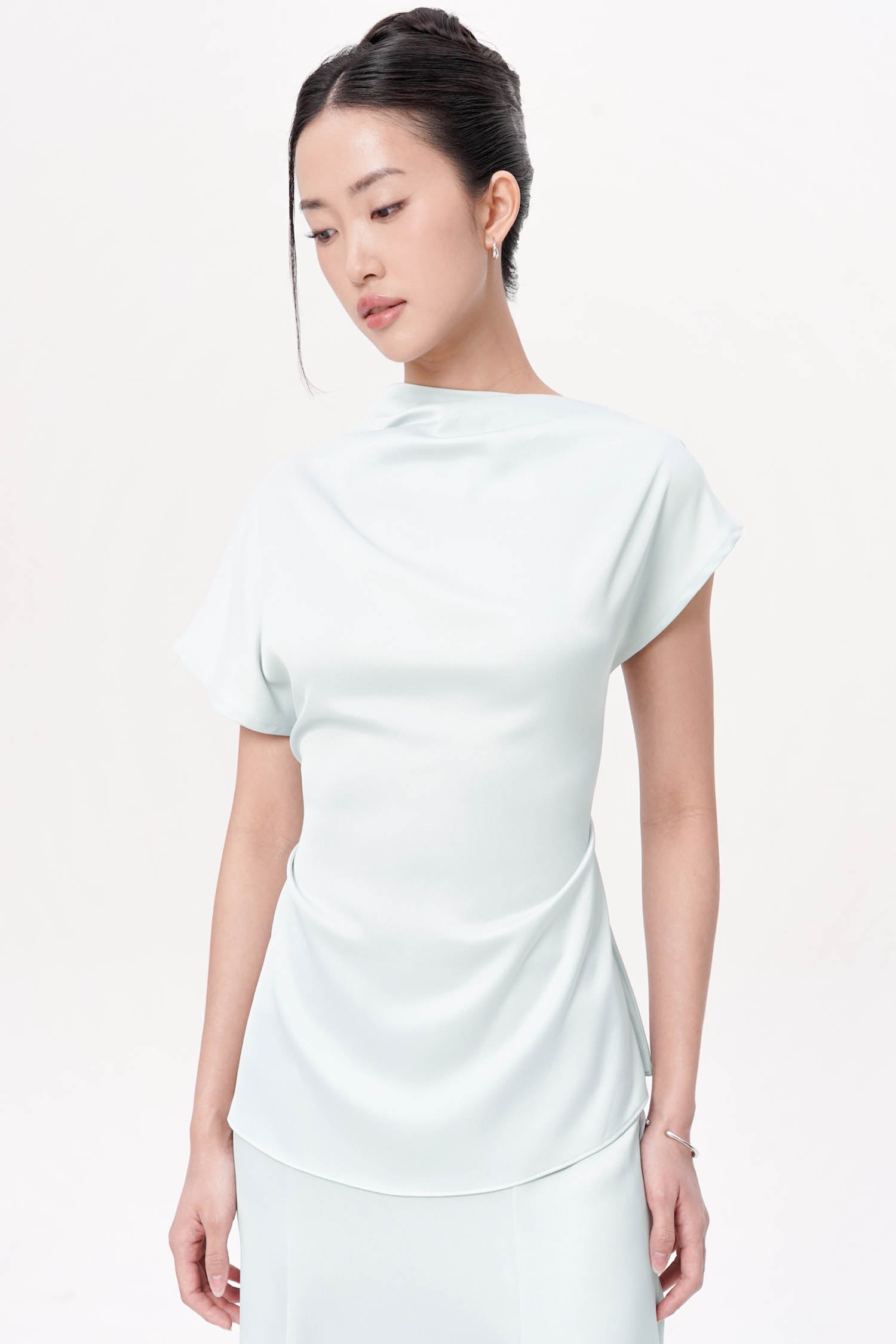 The Salomi Drape Blouse is a refined expression of soft elegance, crafted from luxurious satin that drapes fluidly across the body with an effortless, sculpted grace. Featuring a gentle high neckline that cascades into subtle asymmetrical folds, this design highlights delicate movement while maintaining a clean, feminine silhouette. Its flutter sleeves and thoughtfully placed side gathers create a flattering contour, complemented by a slender back tie that allows for a customizable fit. Available in blush and mint, the Salomi Drape Blouse brings a polished serenity to any wardrobe, perfect for both elevated daytime dressing and sophisticated evening ensembles.