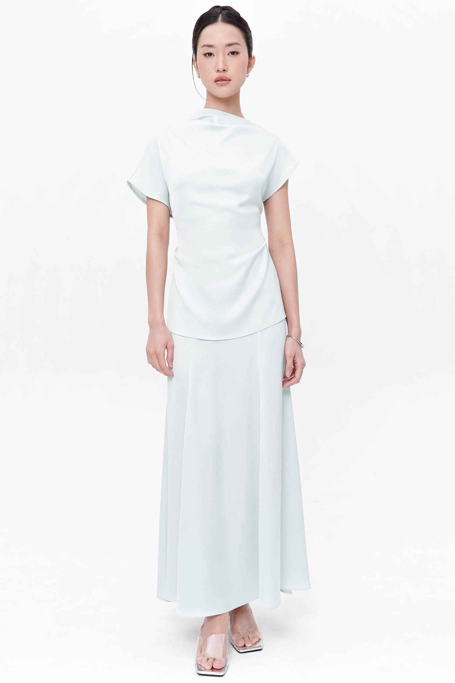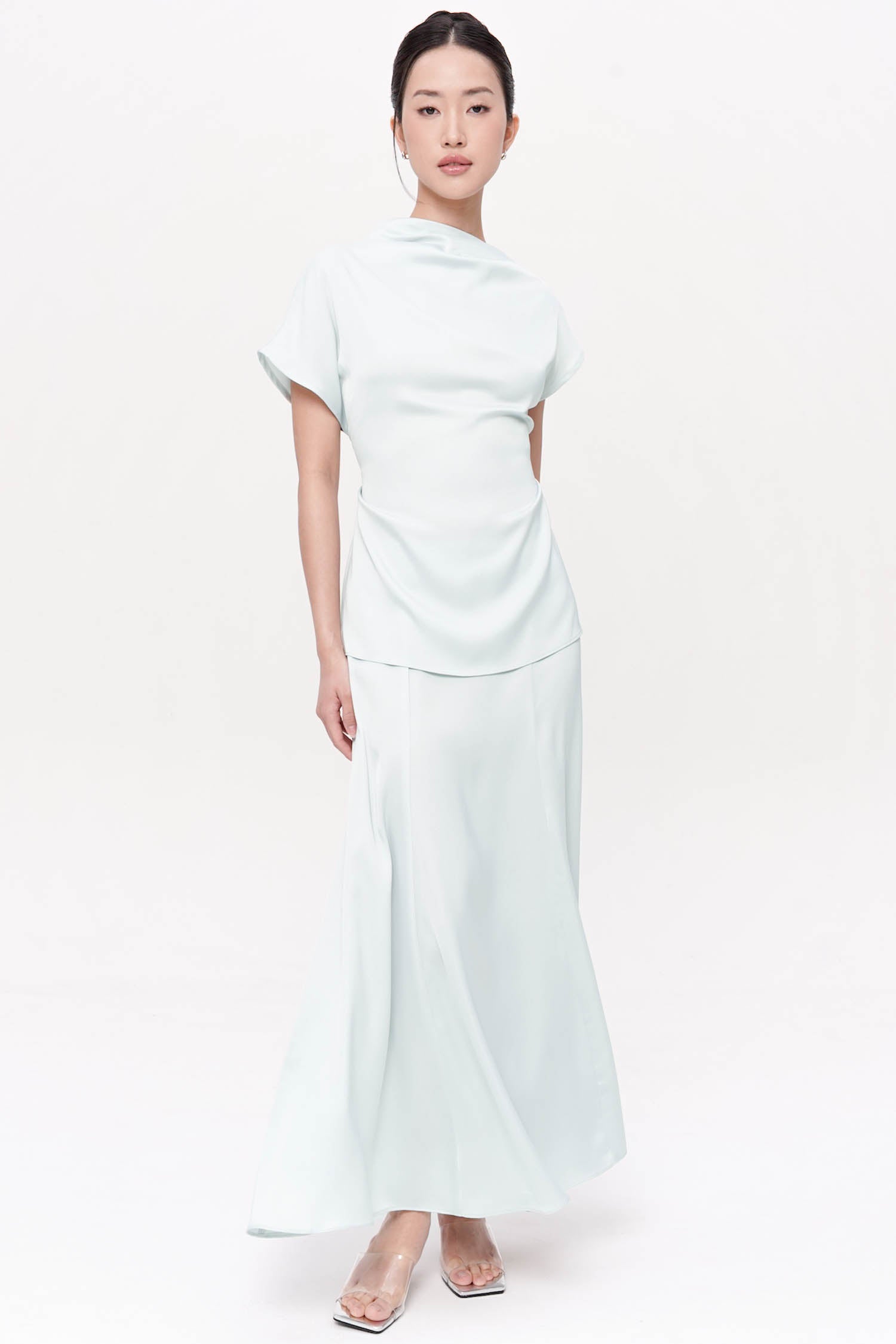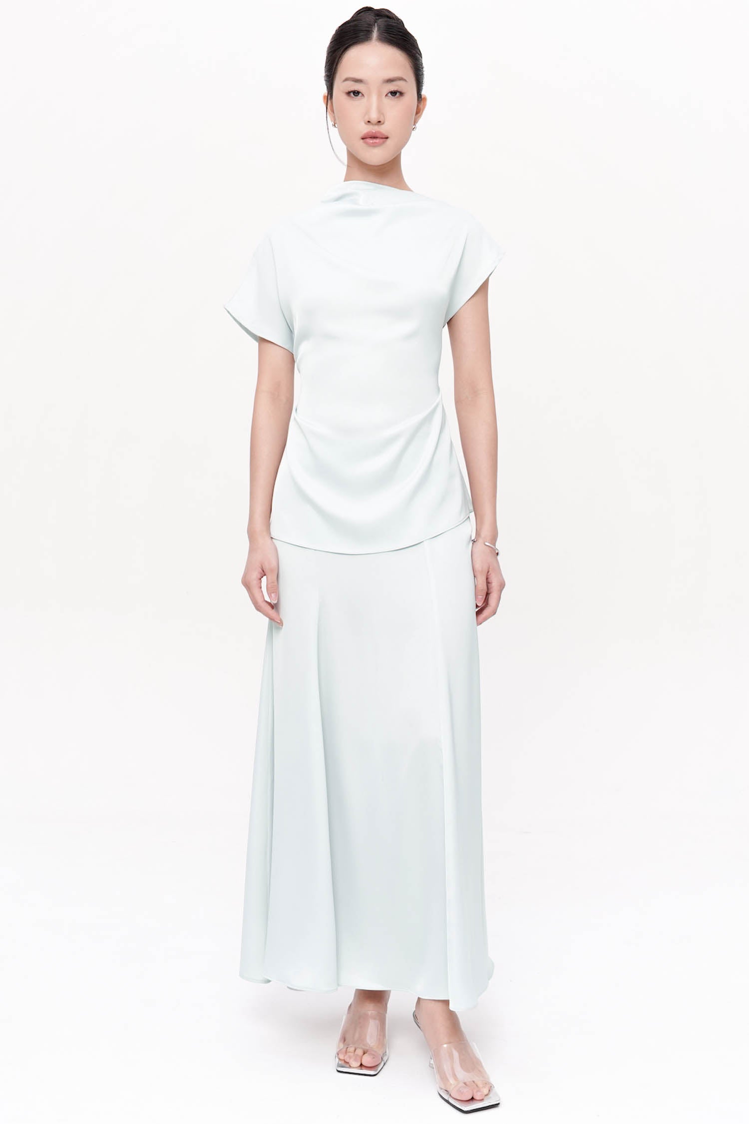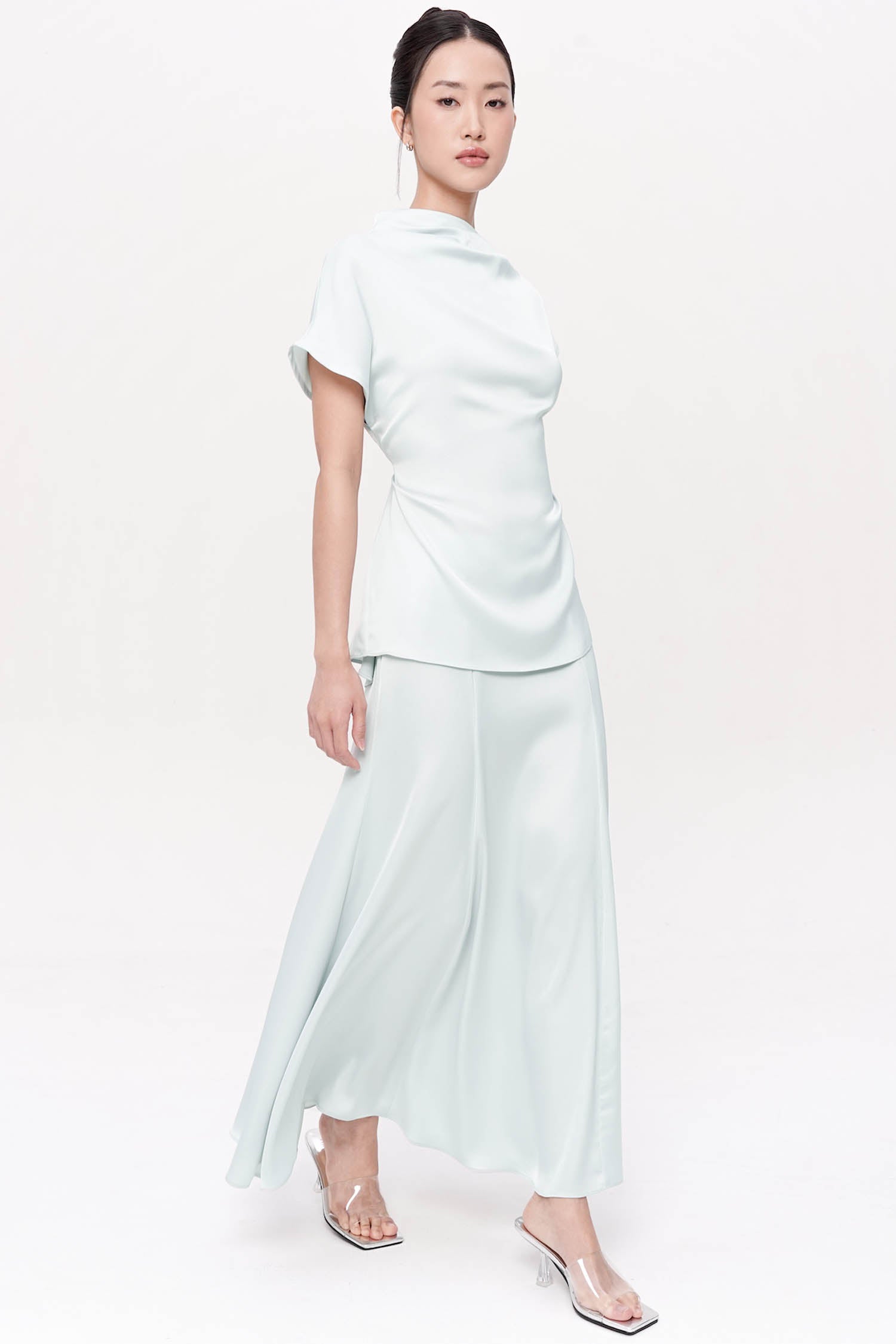The Salomi Drape Blouse is a refined expression of soft elegance, crafted from luxurious satin that drapes fluidly across the body with an effortless, sculpted grace. Featuring a gentle high neckline that cascades into subtle asymmetrical folds, this design highlights delicate movement while maintaining a clean, feminine silhouette. Its flutter sleeves and thoughtfully placed side gathers create a flattering contour, complemented by a slender back tie that allows for a customizable fit. Available in blush and mint, the Salomi Drape Blouse brings a polished serenity to any wardrobe, perfect for both elevated daytime dressing and sophisticated evening ensembles.
