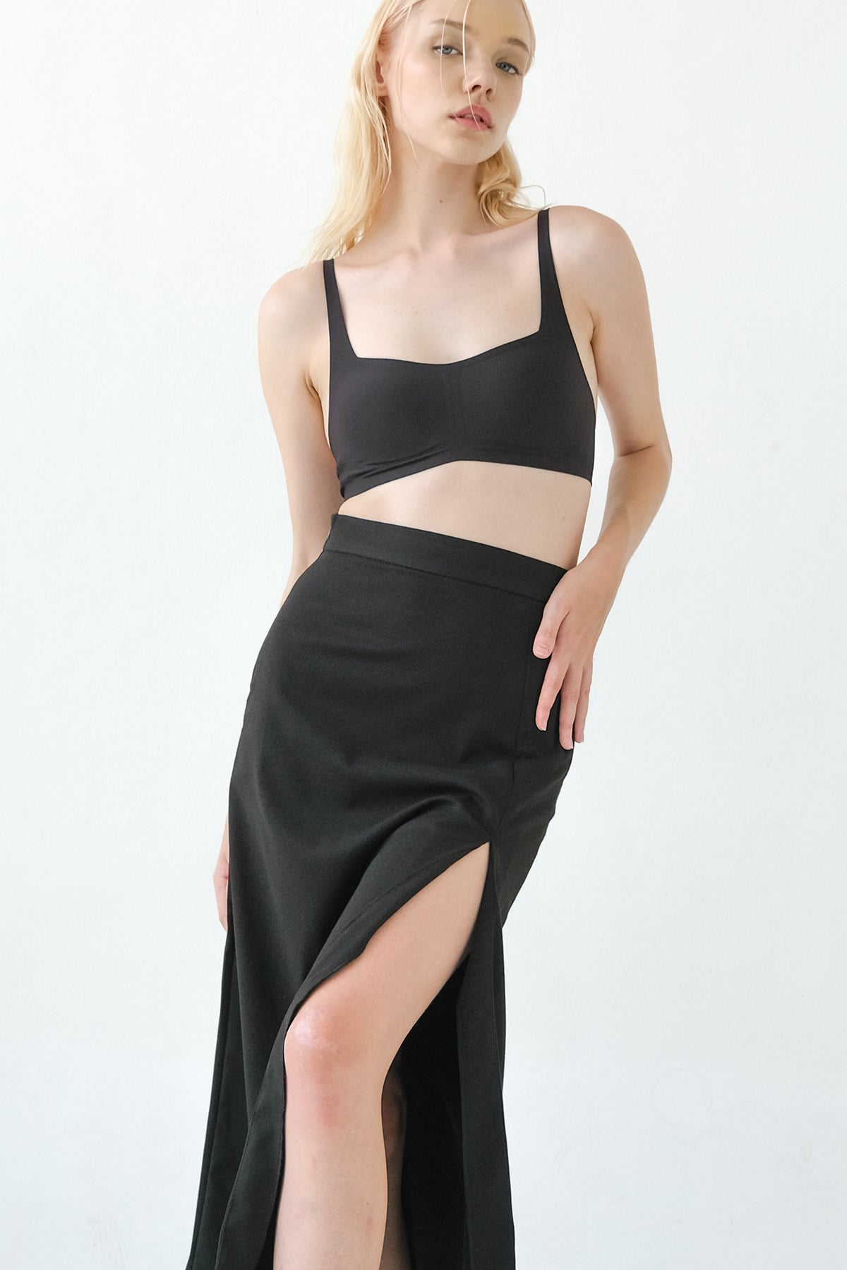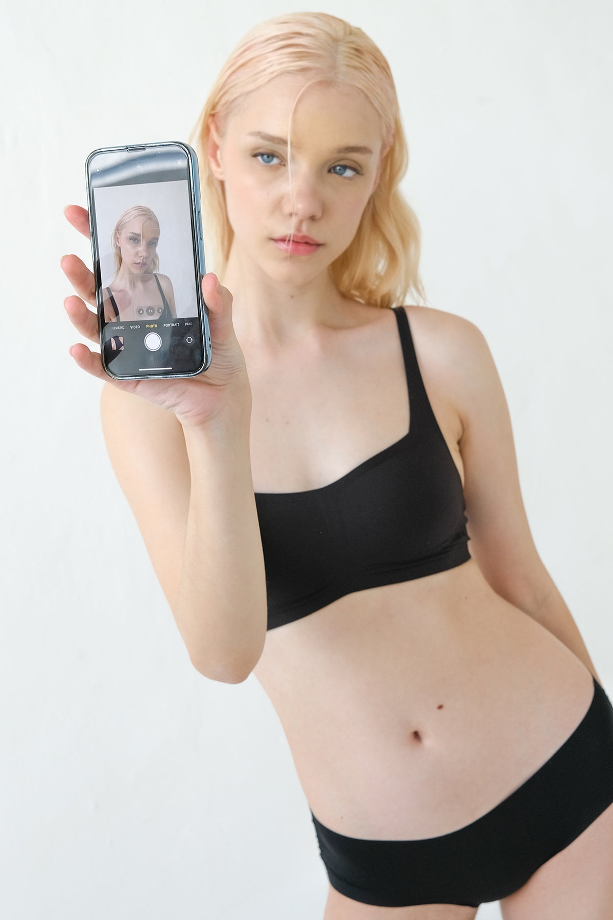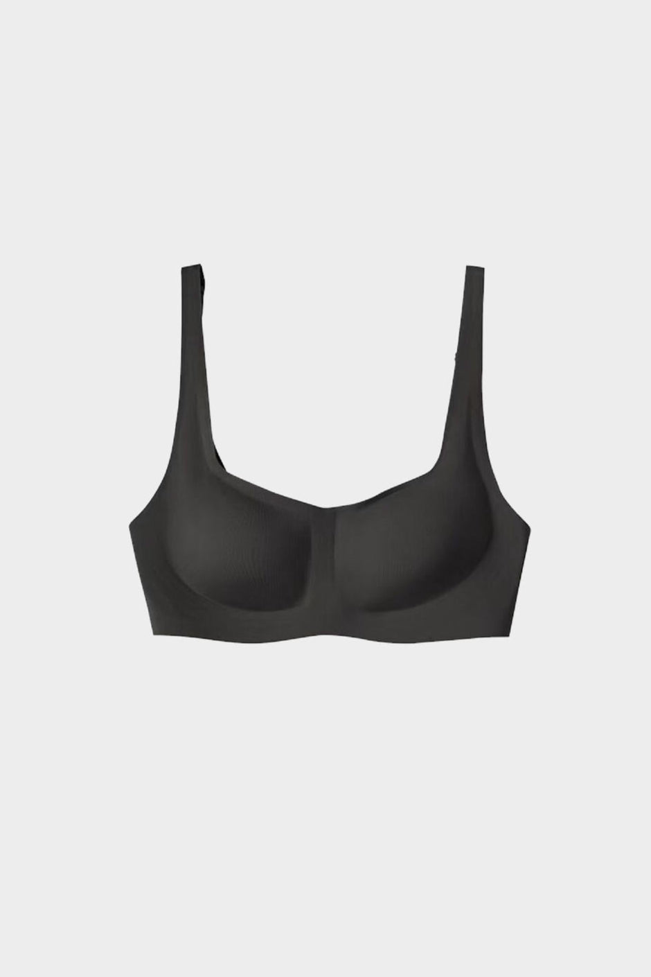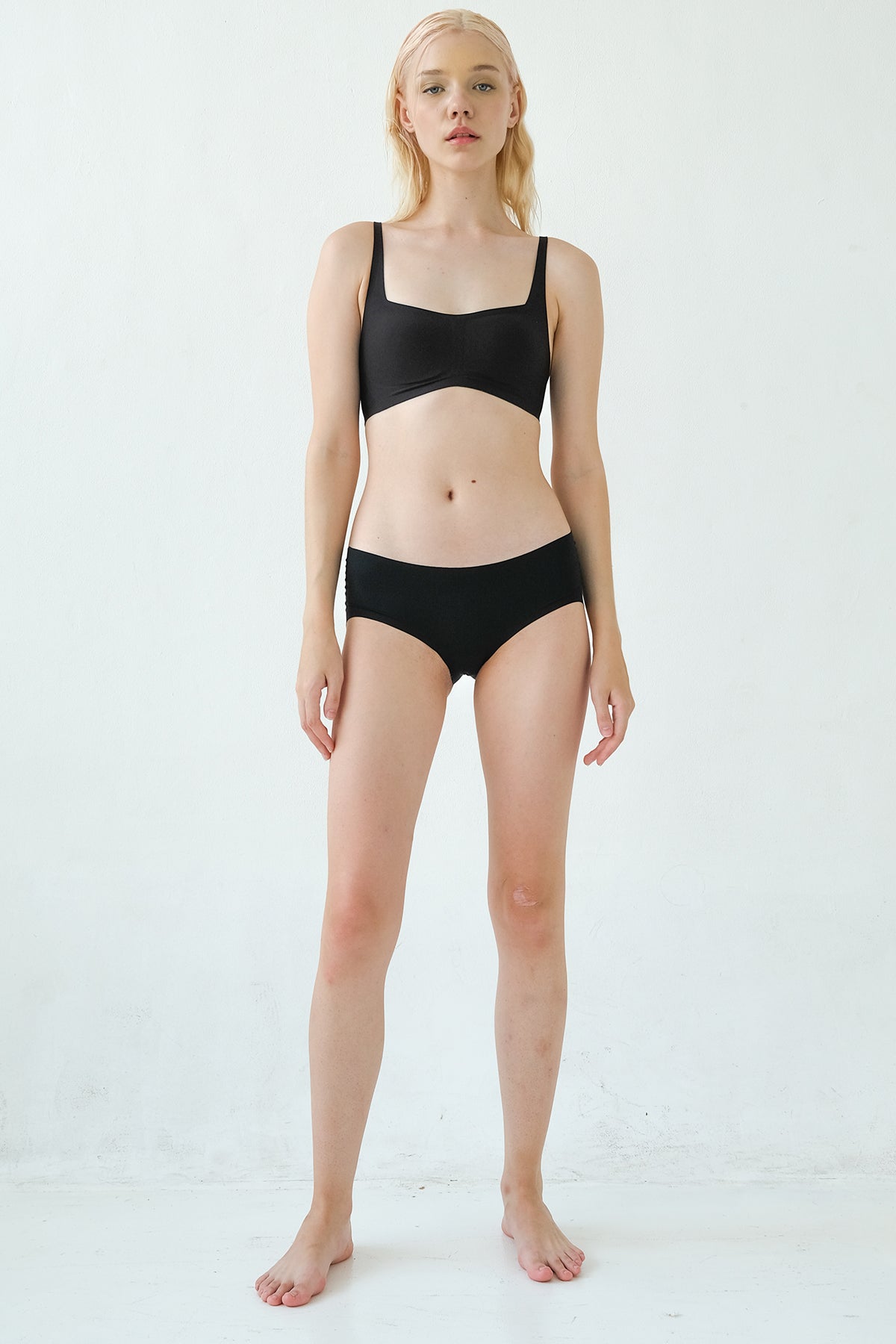 Wireless demi bra with straight neckline with light-medium support and fabric that does not dig into your skin. Seamless, light and airy, sweat-wicking and breathable. Partial coverage bra with removable cups, clasp closures and wirefree. Can be paired with an outer and used as a crop bikini top!