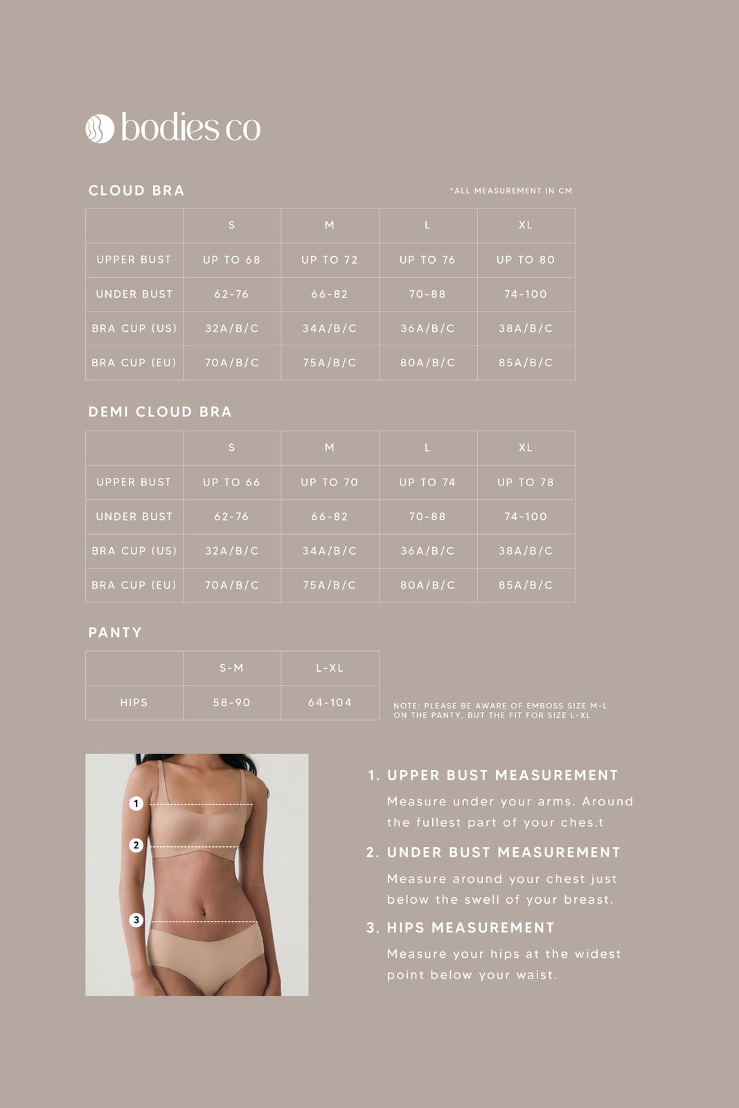 Upper bust up to up to 78 cm | Under bust 74-100 cm | Bra Cup 38 A/B/C (US) / 85 A/B/C (EU)