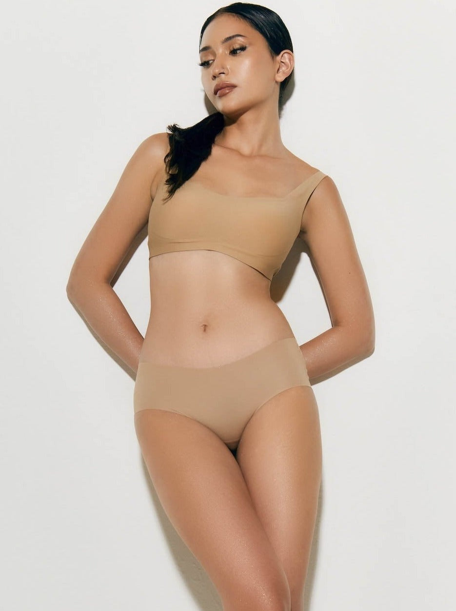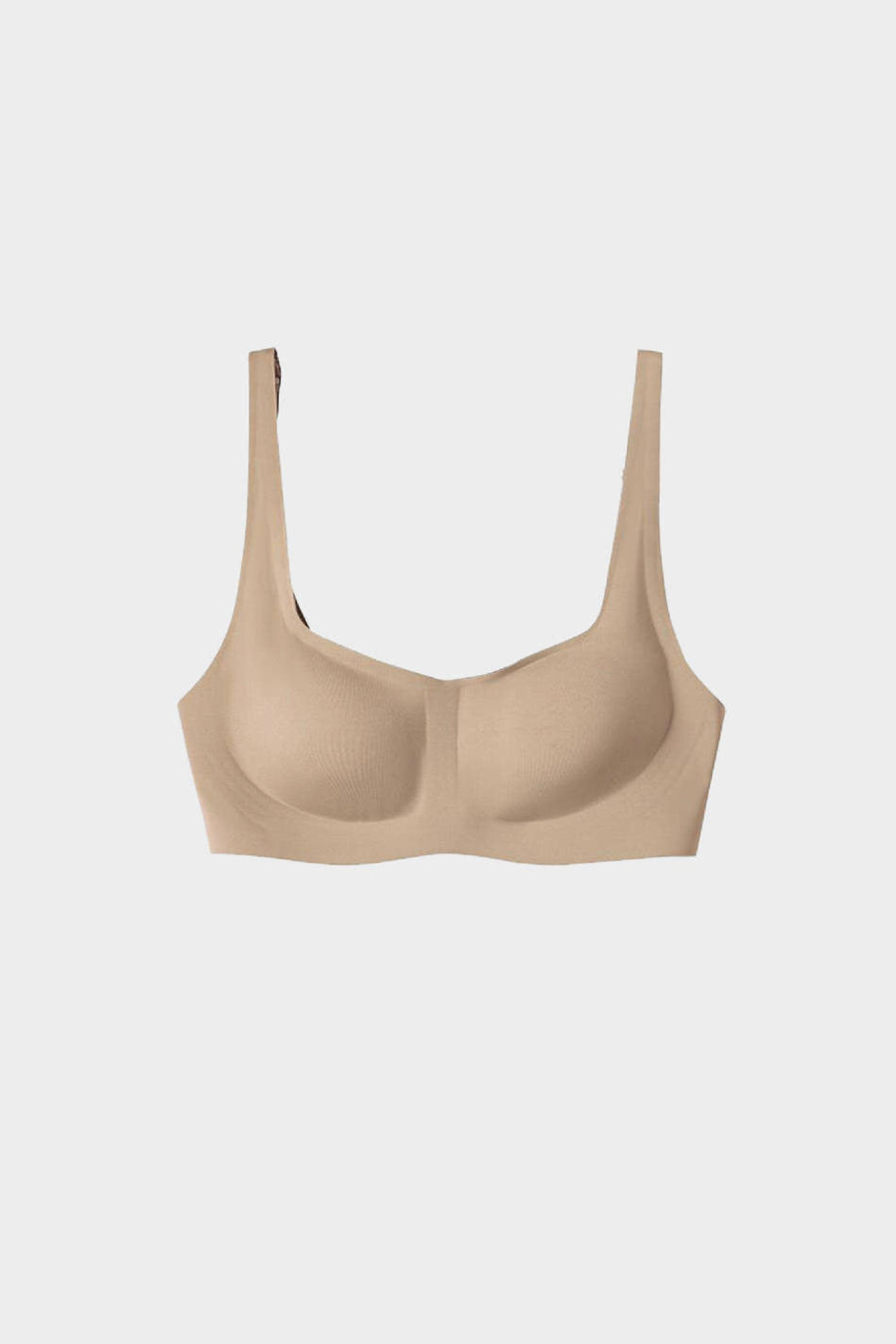 Wireless demi bra with straight neckline with light-medium support and fabric that does not dig into your skin. Seamless, light and airy, sweat-wicking and breathable. Partial coverage bra with removable cups, clasp closures and wirefree. Can be paired with an outer and used as a crop bikini top!