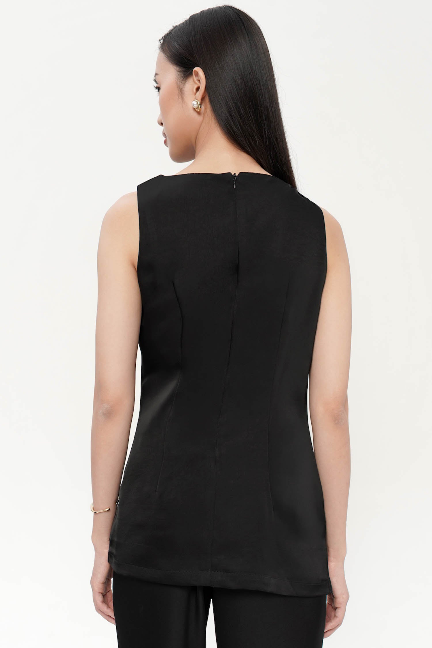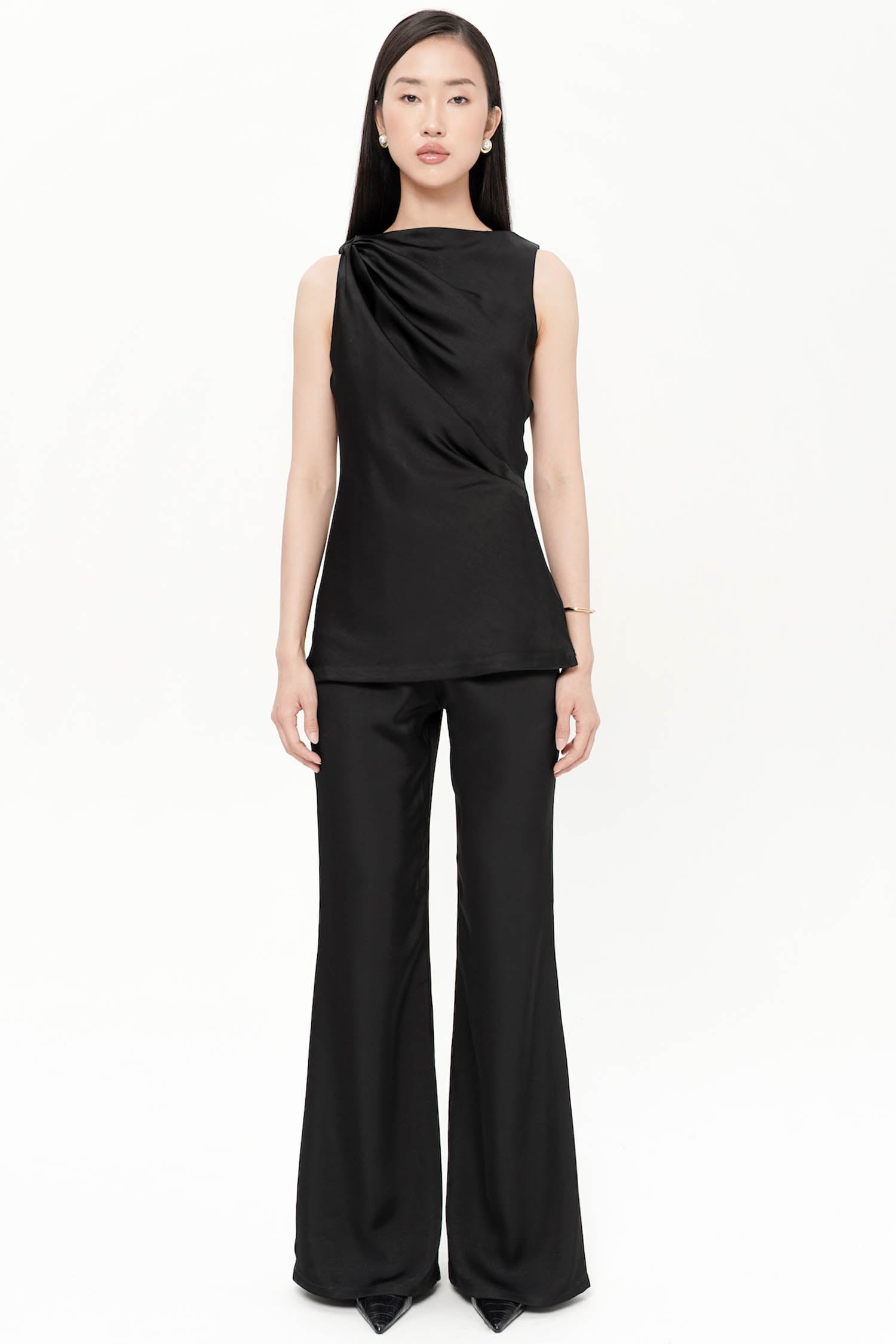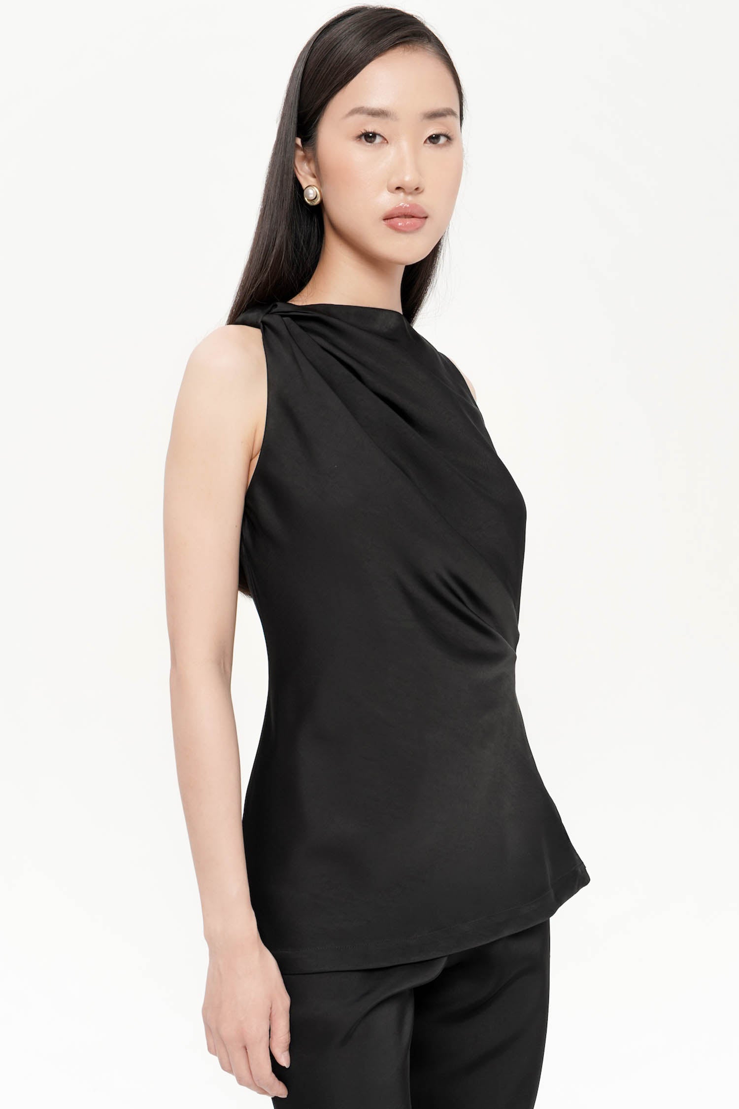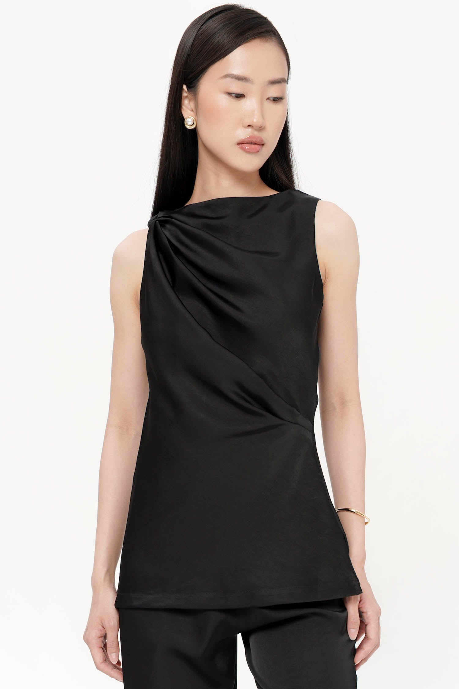 The Serena Drape Top embodies refined femininity with its fluid silhouette and artfully sculpted draping that cascades gracefully across the bodice, creating a flattering, elongated line. Crafted from luxurious satin silk, the fabric offers a luminous sheen and a silky-smooth touch that elevates the piece with an air of quiet sophistication, while the sleeveless cut and softly contoured neckline enhance its modern elegance. Designed to transition effortlessly from day to evening, the Serena Drape Top pairs beautifully with tailored trousers or skirts, making it a timeless wardrobe essential. Available in Butter, Cocoa, and Etoupe, each shade reflects understated luxury and versatile charm.