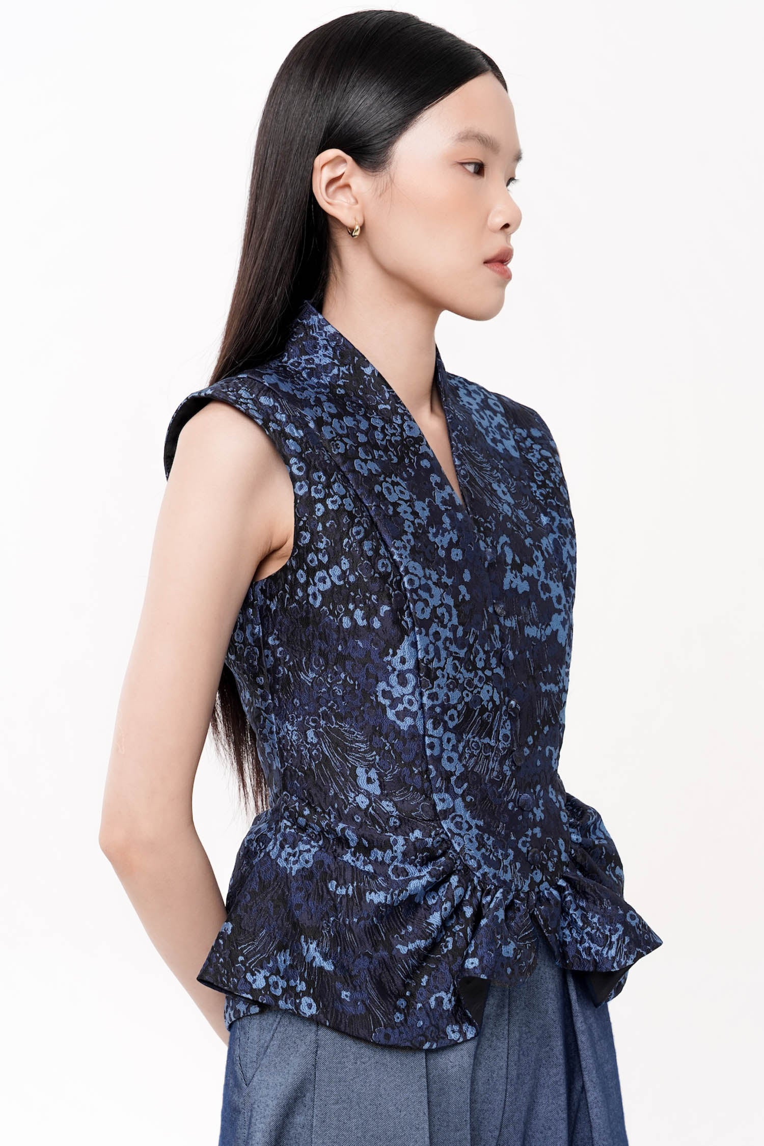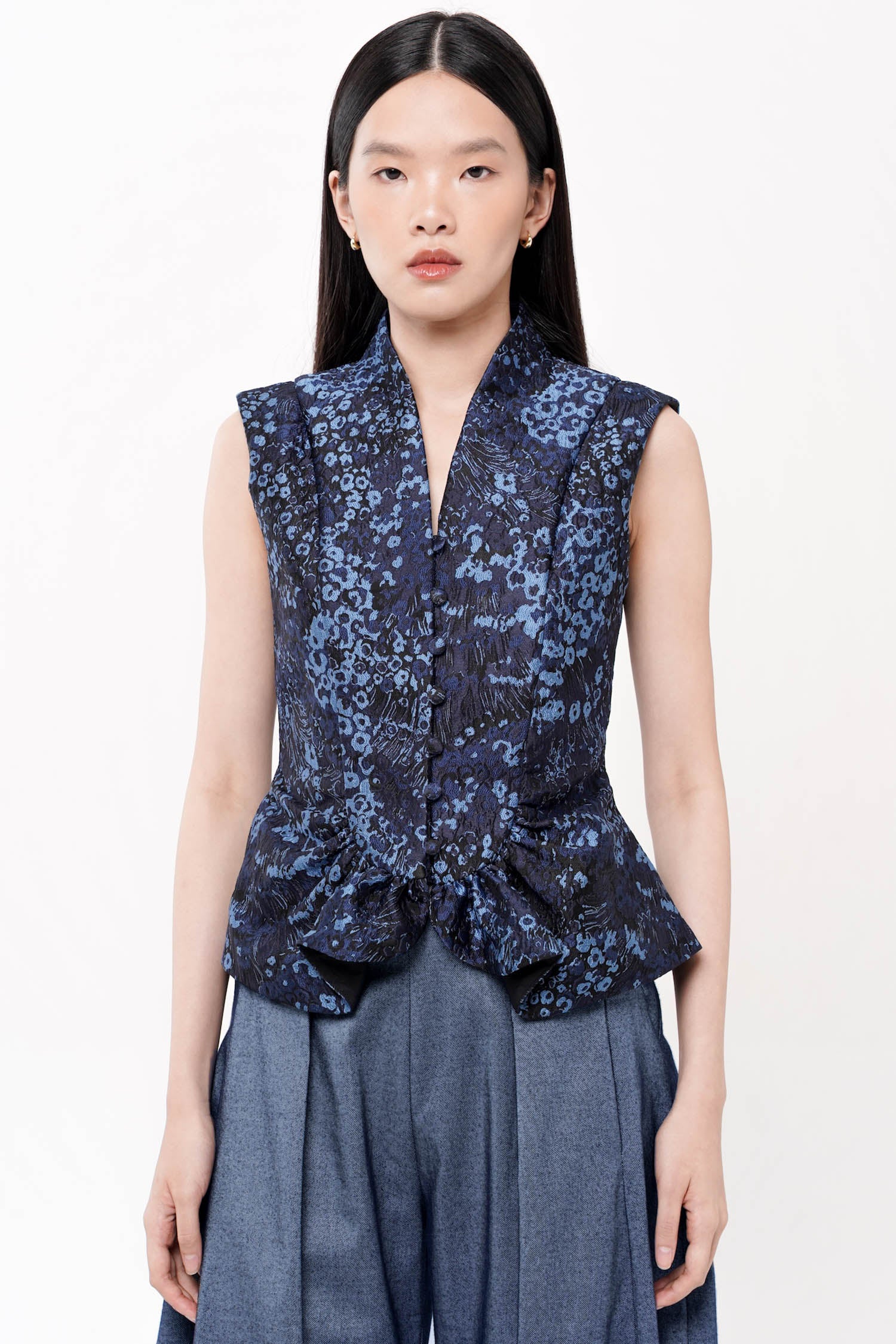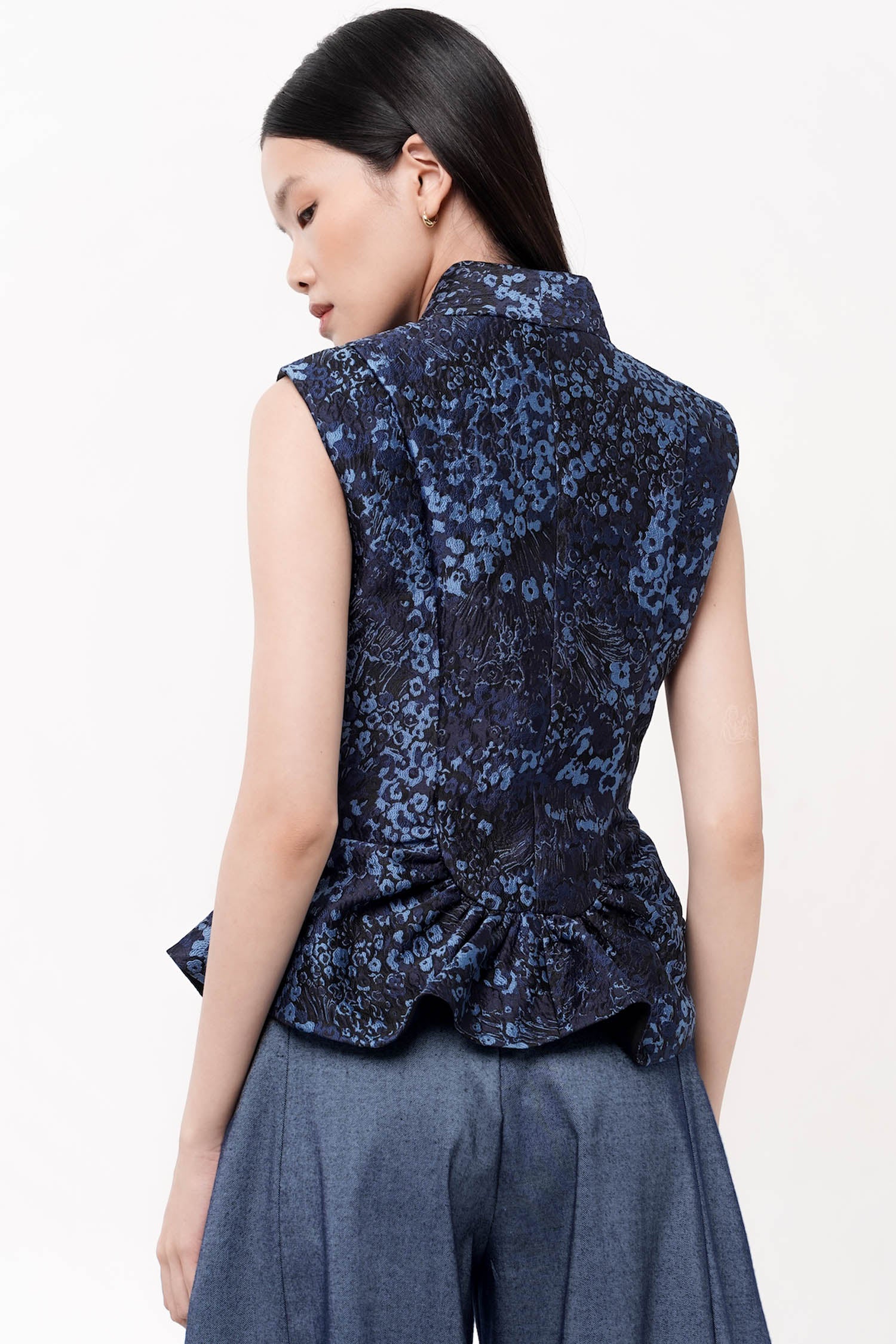 This top exemplifies contemporary design through its minimalist sleeveless construction. The gather details at front and back create subtle sculptural interest while enhancing the garment's drape and silhouette.