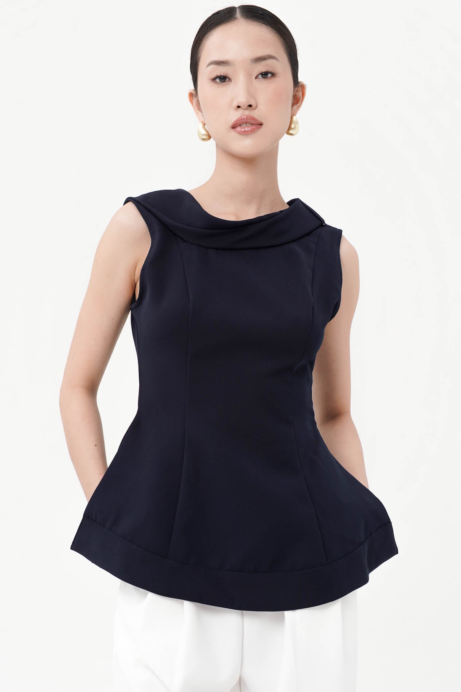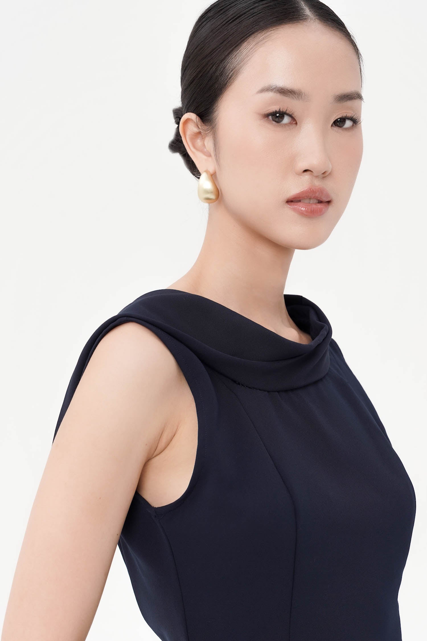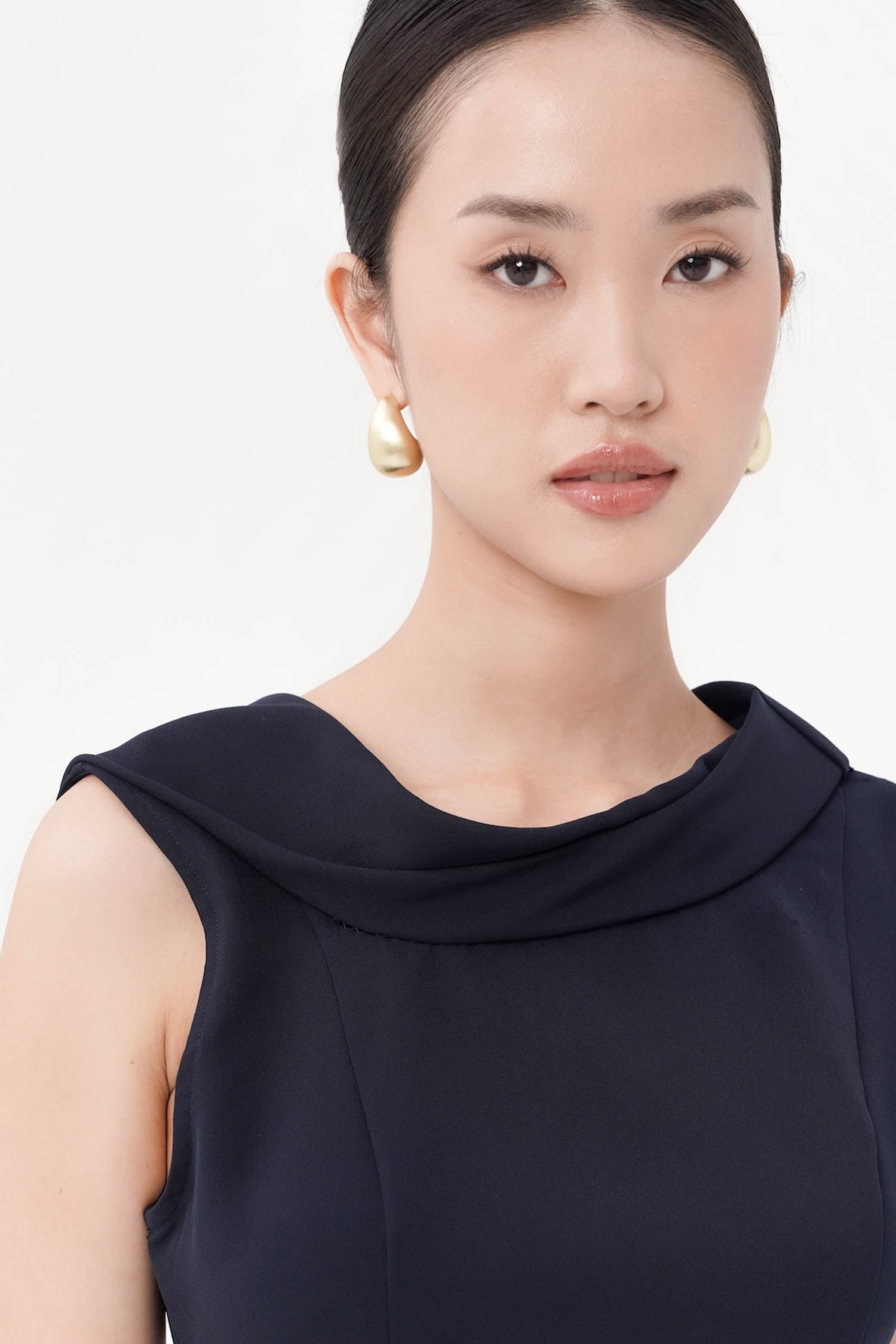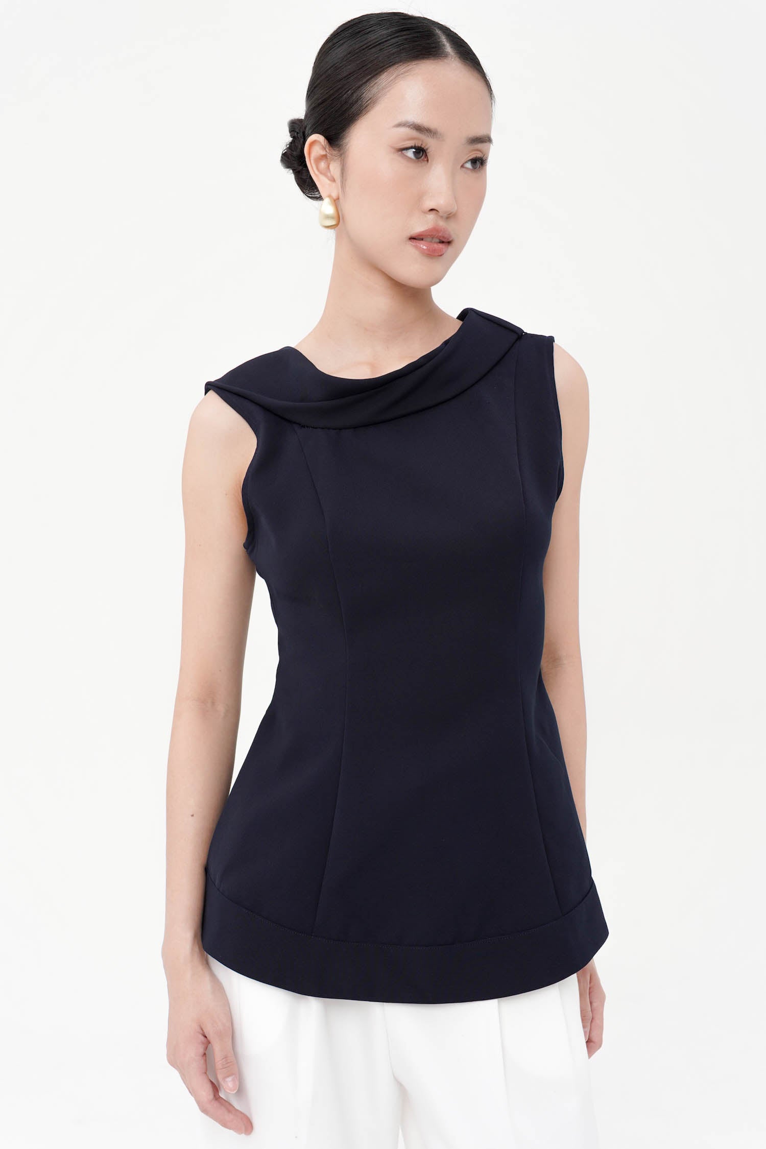 The Tacey Twist Shawl Neck Top is a refined statement piece that marries architectural elegance with modern minimalism. Tailored from premium semi wool, this sleeveless design features a sculpted silhouette with a softly flared hem that flatters the form while maintaining ease of movement. The distinctive twist shawl neckline drapes gracefully across the shoulders and back, adding depth and sophistication to its clean lines. Offered in timeless shades of charcoal and navy, this top is a versatile choice that transitions seamlessly from polished daytime ensembles to elevated evening looks.