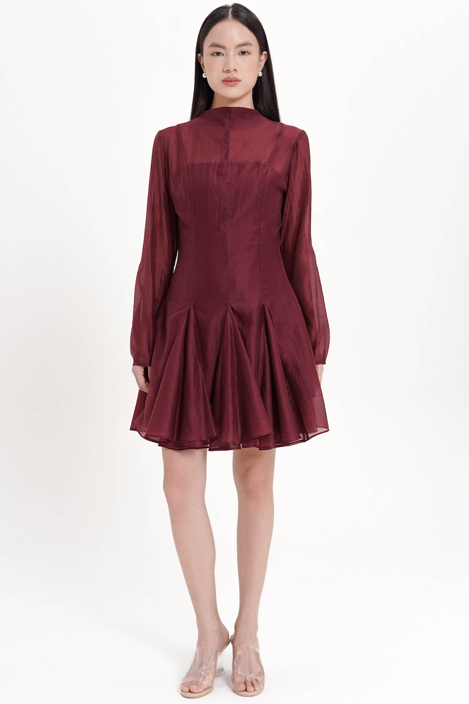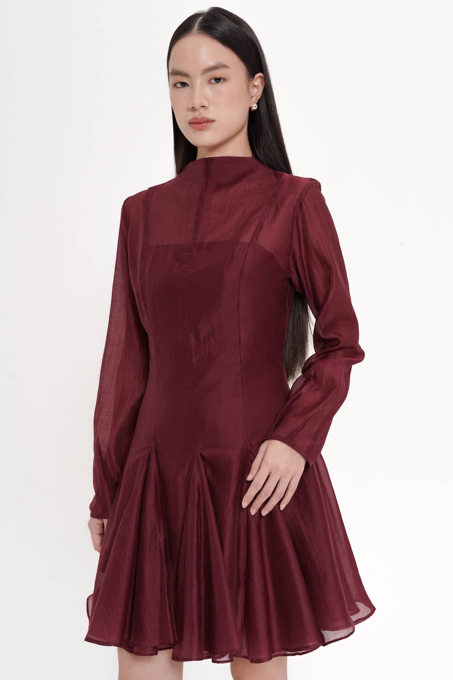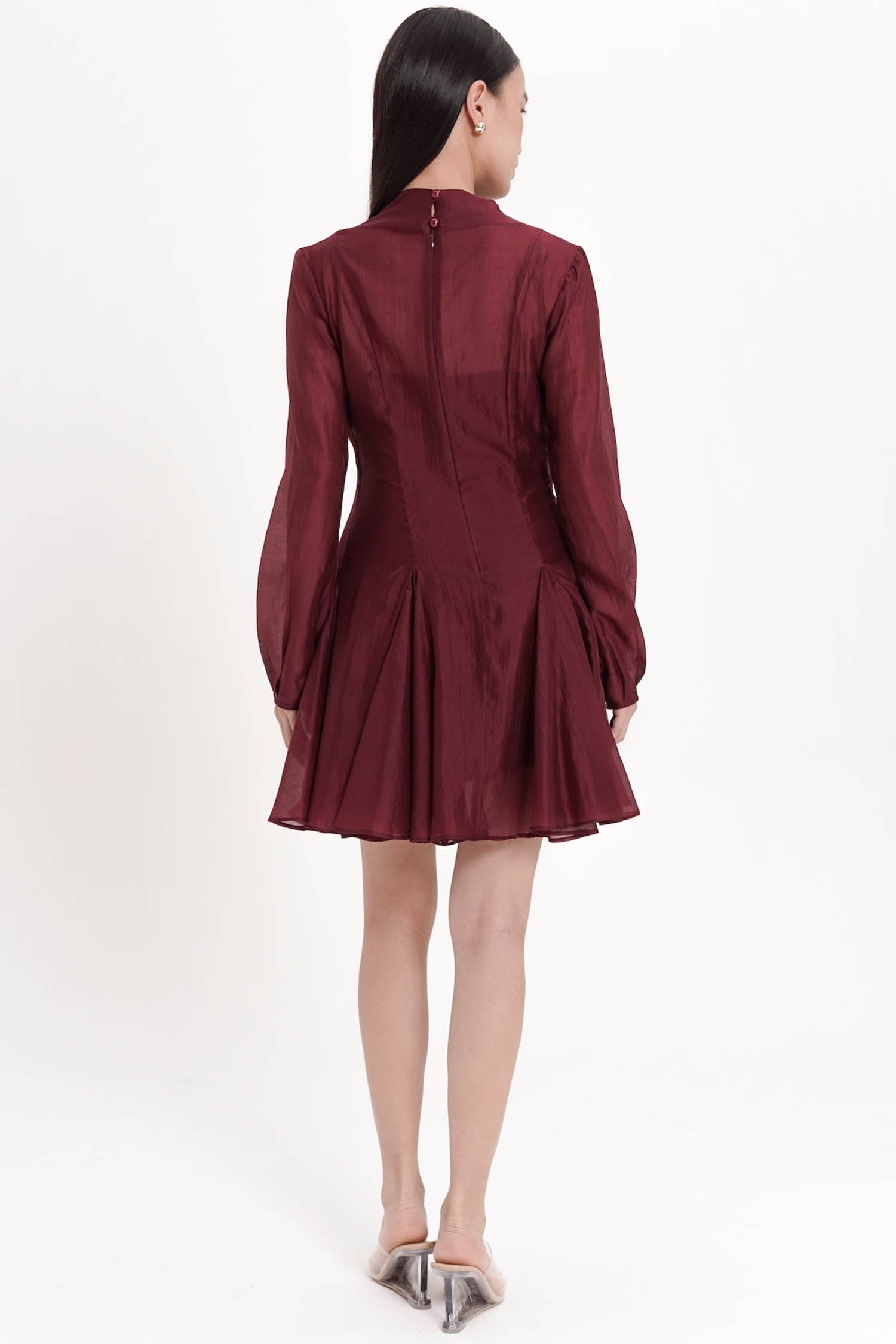 The Truette Two-piece Mini Dress exudes refined elegance with a modern romantic allure, crafted from lustrous polyester that drapes effortlessly to create a graceful, sculpted silhouette. Designed as a two-piece ensemble with a delicately sheer outer layer and a sleek, structured inner dress, it features soft balloon sleeves, a subtle high neckline, and a beautifully flared mini skirt that moves with an airy, feminine fluidity. Offered in an exquisite palette of porcelain, navy, and maroon, this piece balances sophistication and charm, making it an exceptional choice for soirées, celebrations, or any moment that calls for poised, standout style.
