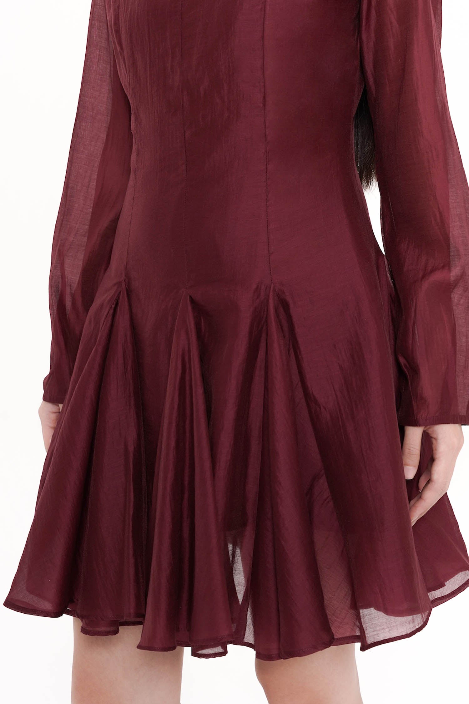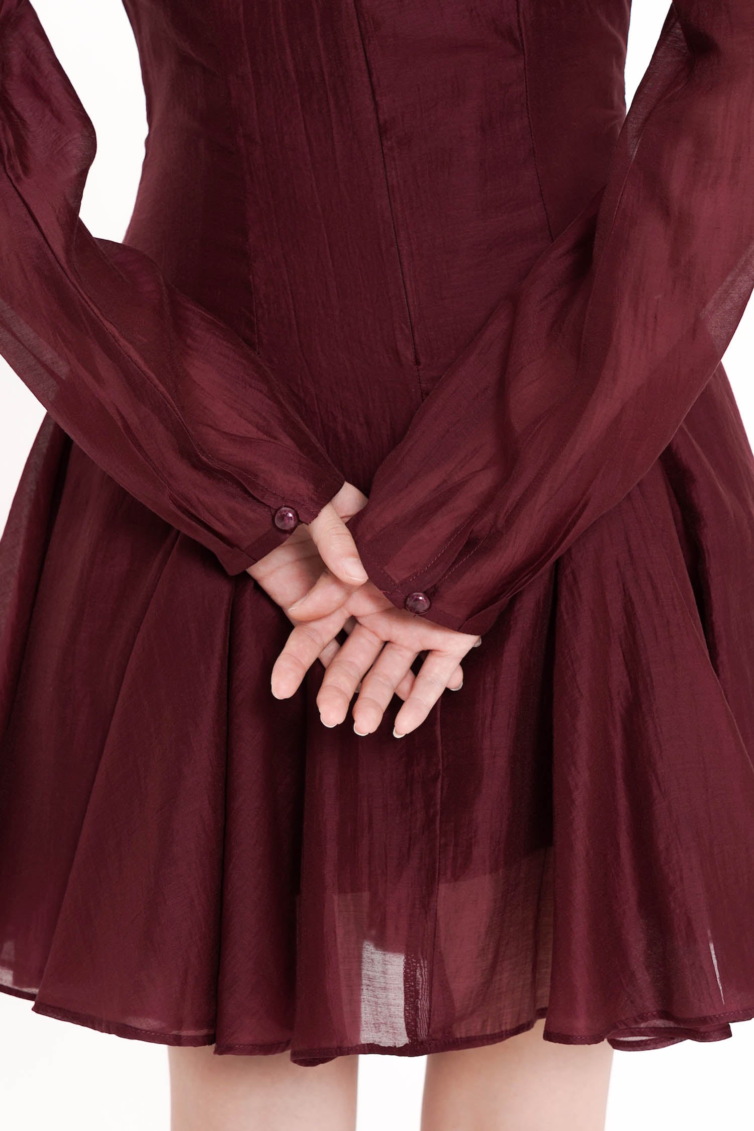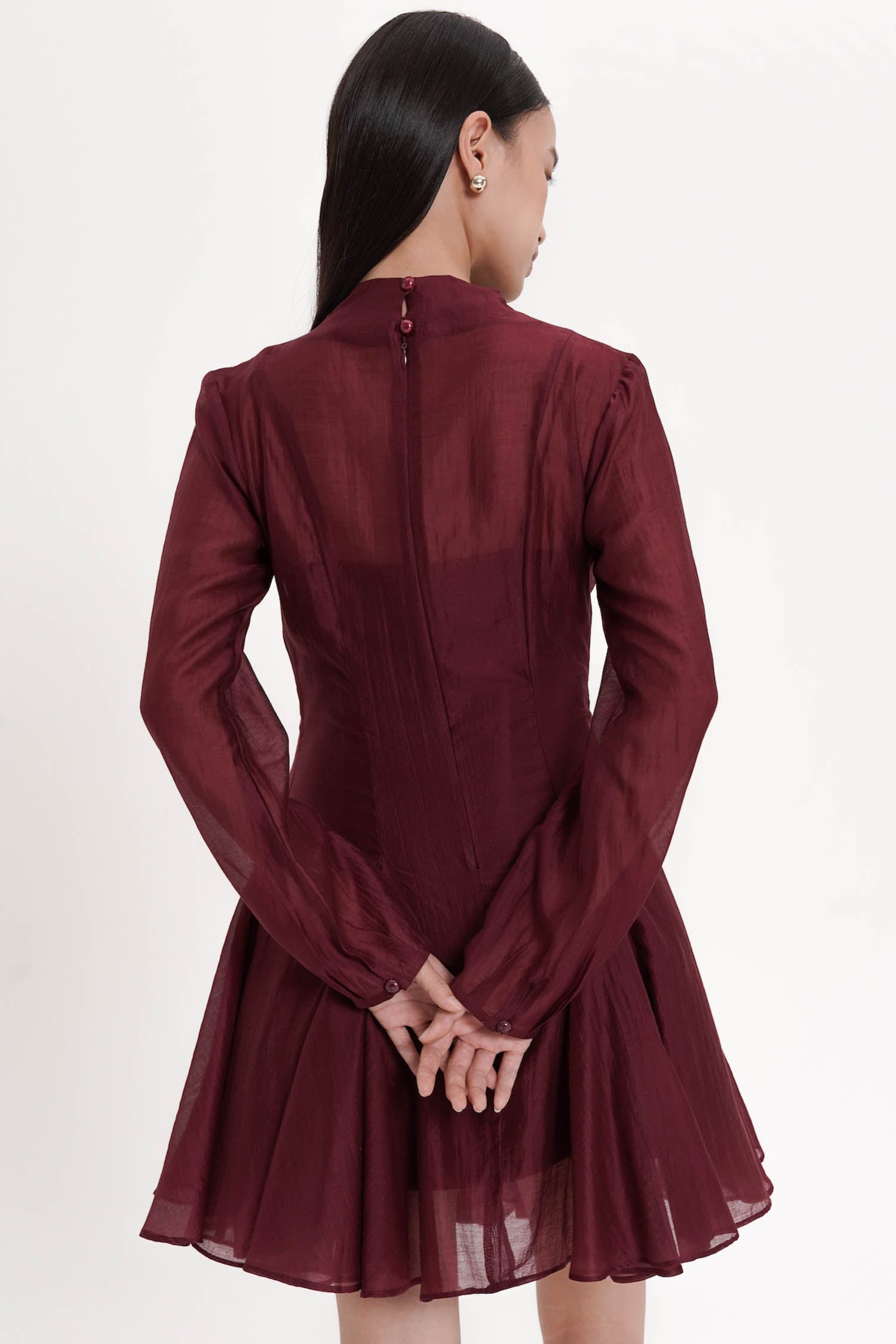 The Truette Two-piece Mini Dress exudes refined elegance with a modern romantic allure, crafted from lustrous polyester that drapes effortlessly to create a graceful, sculpted silhouette. Designed as a two-piece ensemble with a delicately sheer outer layer and a sleek, structured inner dress, it features soft balloon sleeves, a subtle high neckline, and a beautifully flared mini skirt that moves with an airy, feminine fluidity. Offered in an exquisite palette of porcelain, navy, and maroon, this piece balances sophistication and charm, making it an exceptional choice for soirées, celebrations, or any moment that calls for poised, standout style.