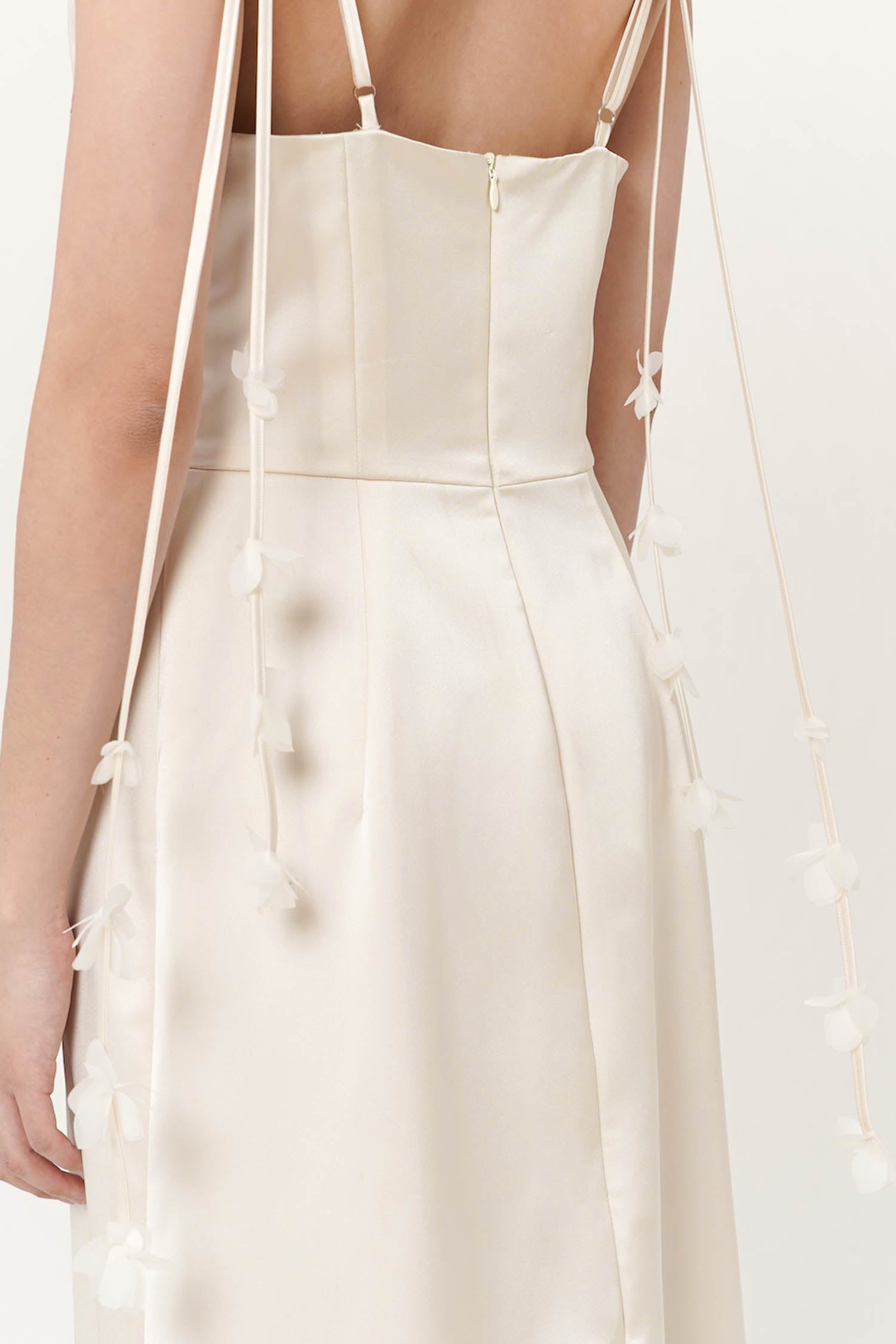The Vale Dress is a satin slip style with a V-neckline, slim adjustable straps and a fluid floor-length silhouette—modern, timeless, and effortlessly elegant.