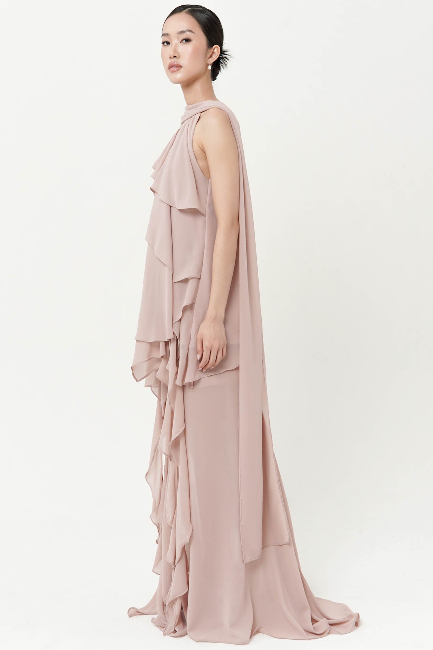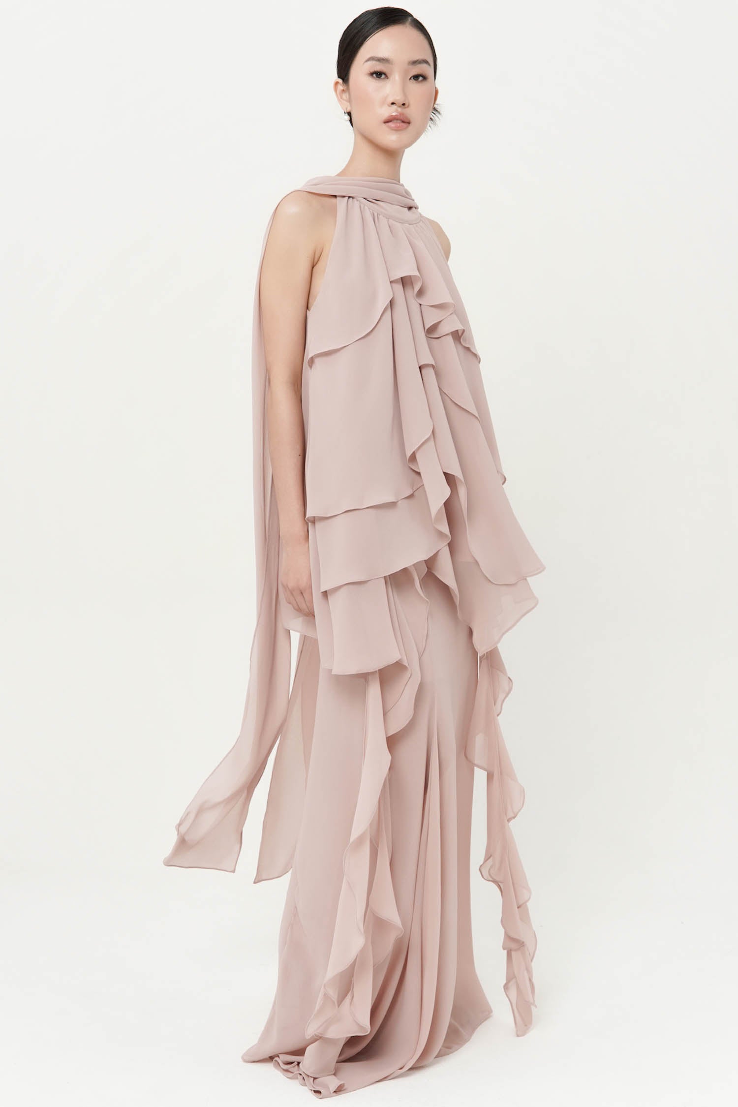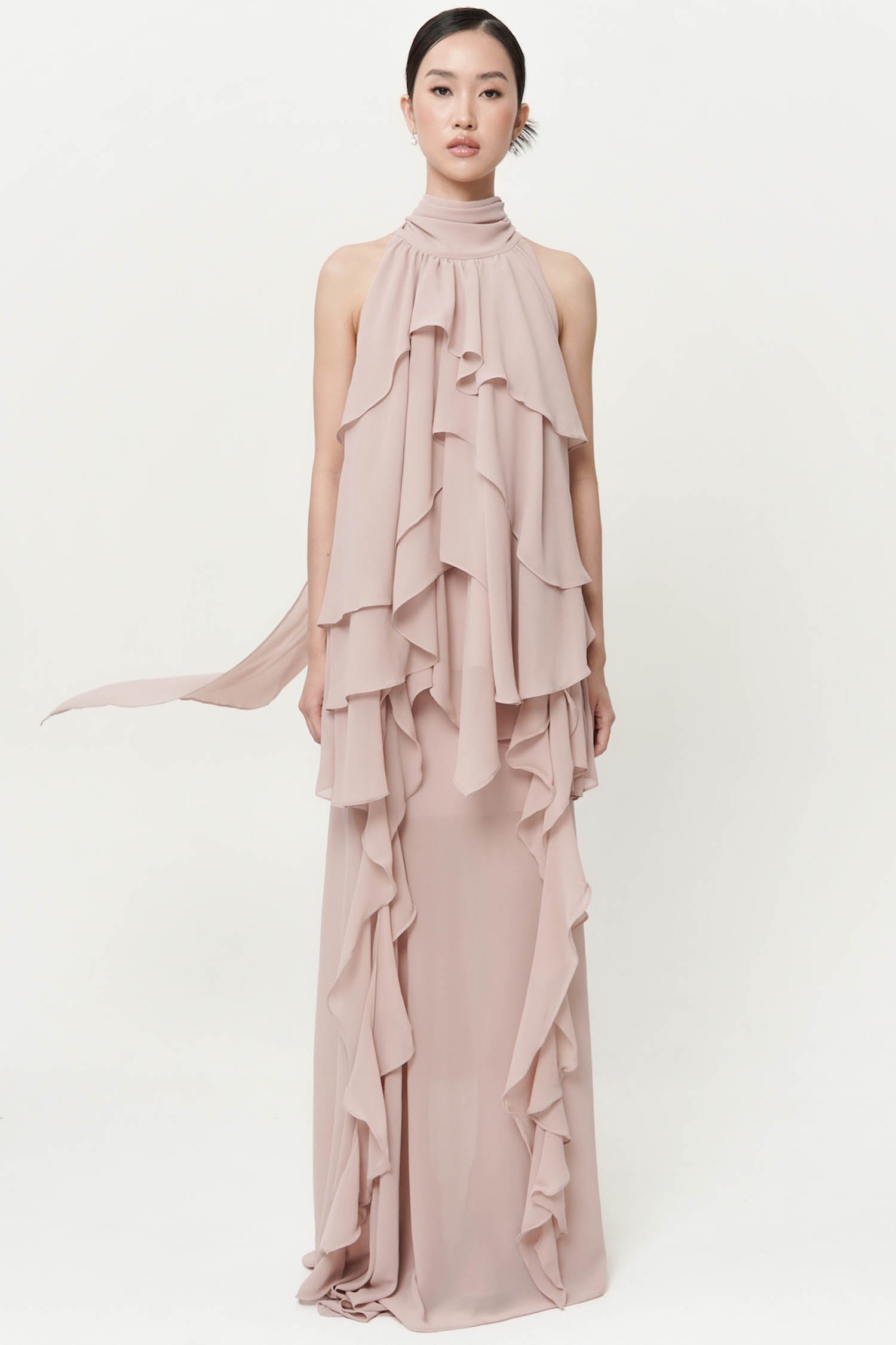 This set features a sophisticated two-piece look in soft blush pink. The top is a high-neck halter style adorned with cascading layered ruffles that flow dramatically down the front, creating movement and volume. It extends into a cape-like back detail, adding elegance and a modern twist. The bottom consists of a sleek, floor-length fitted skirt with a smooth silhouette that contrasts beautifully with the flowy, ruffled overlay. This ensemble strikes a balance between romantic femininity and contemporary glamour, perfect for formal occasions or evening events.