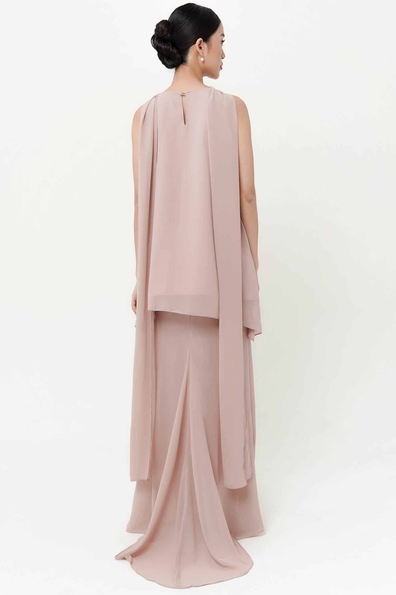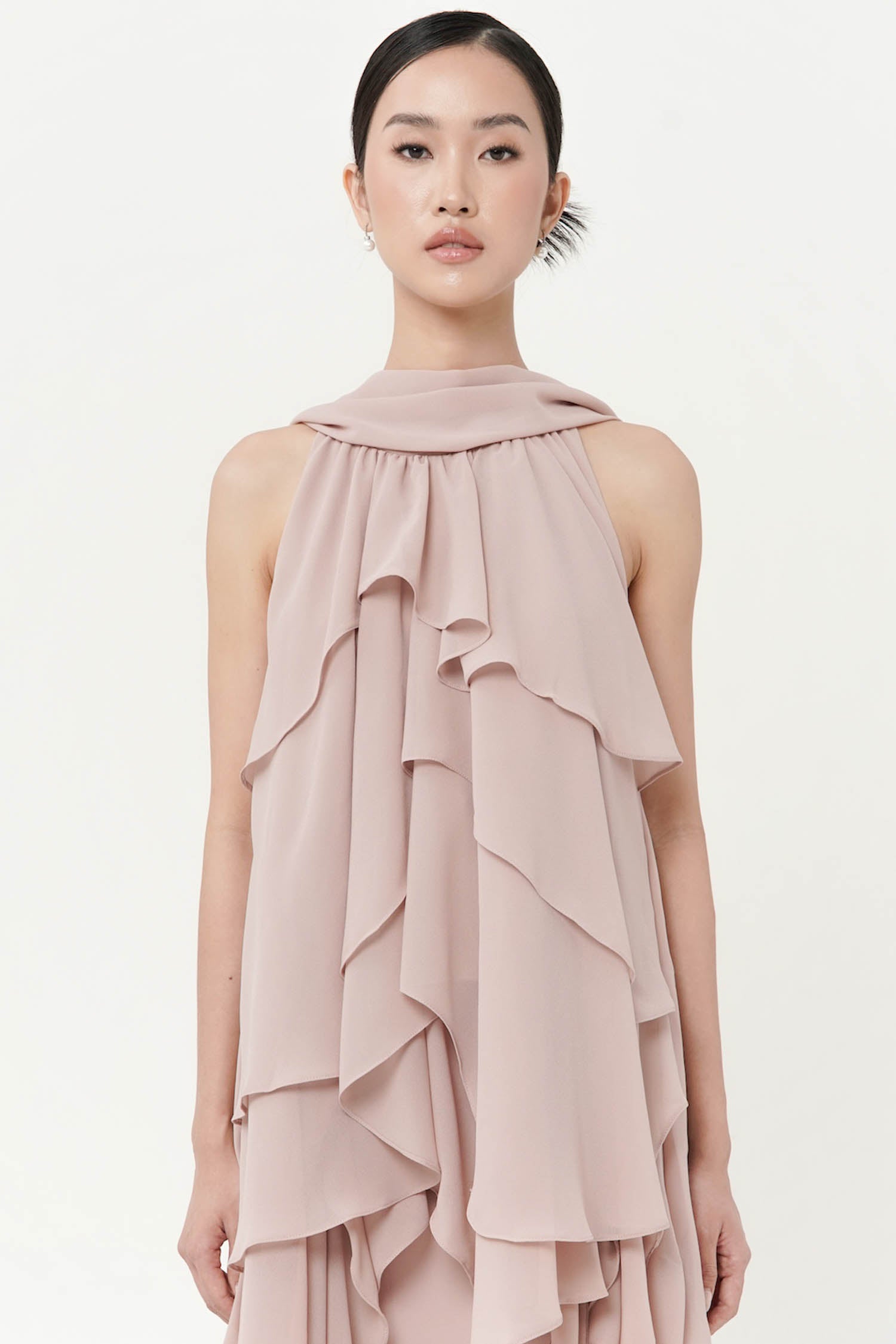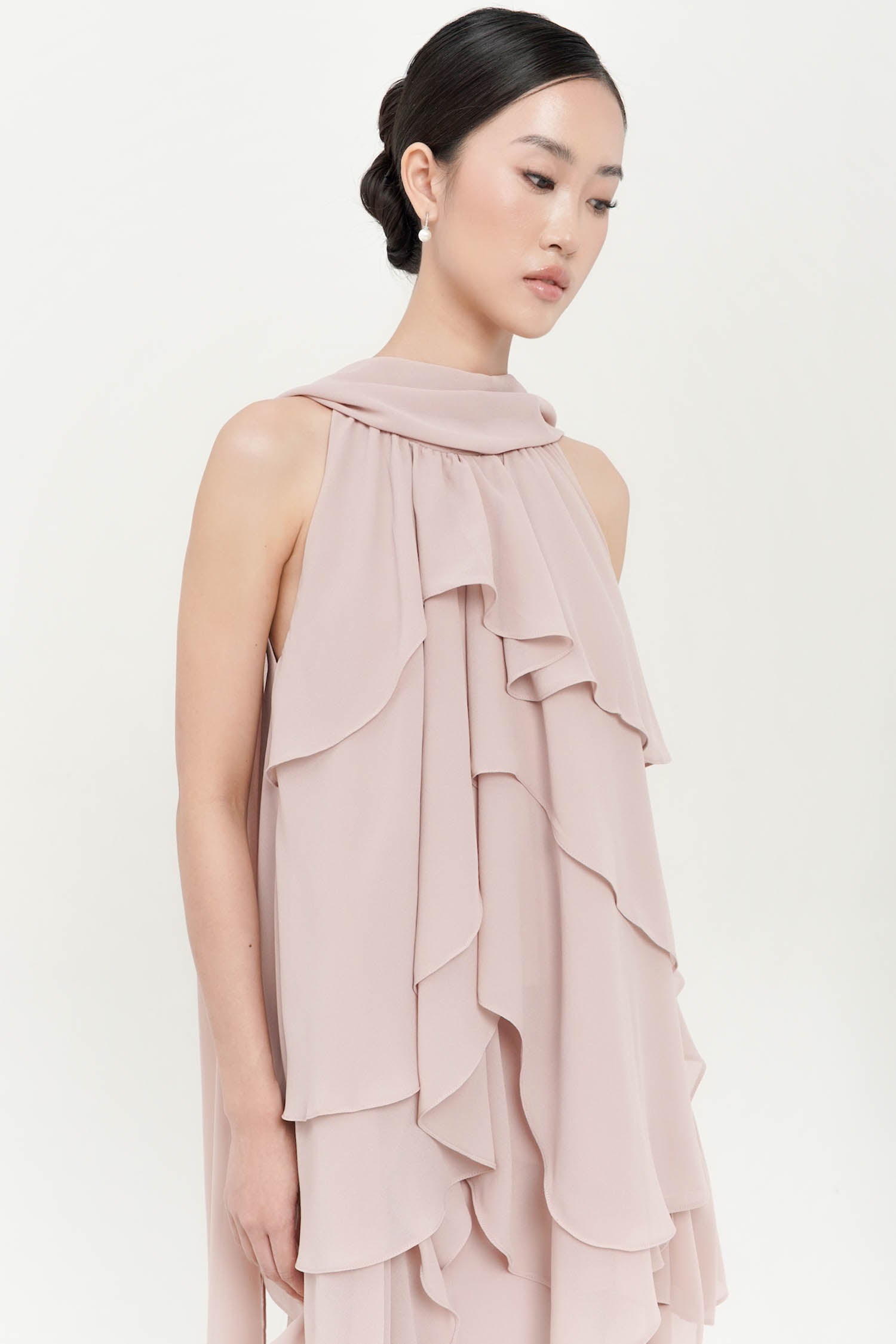 This set features a sophisticated two-piece look in soft blush pink. The top is a high-neck halter style adorned with cascading layered ruffles that flow dramatically down the front, creating movement and volume. It extends into a cape-like back detail, adding elegance and a modern twist. The bottom consists of a sleek, floor-length fitted skirt with a smooth silhouette that contrasts beautifully with the flowy, ruffled overlay. This ensemble strikes a balance between romantic femininity and contemporary glamour, perfect for formal occasions or evening events.