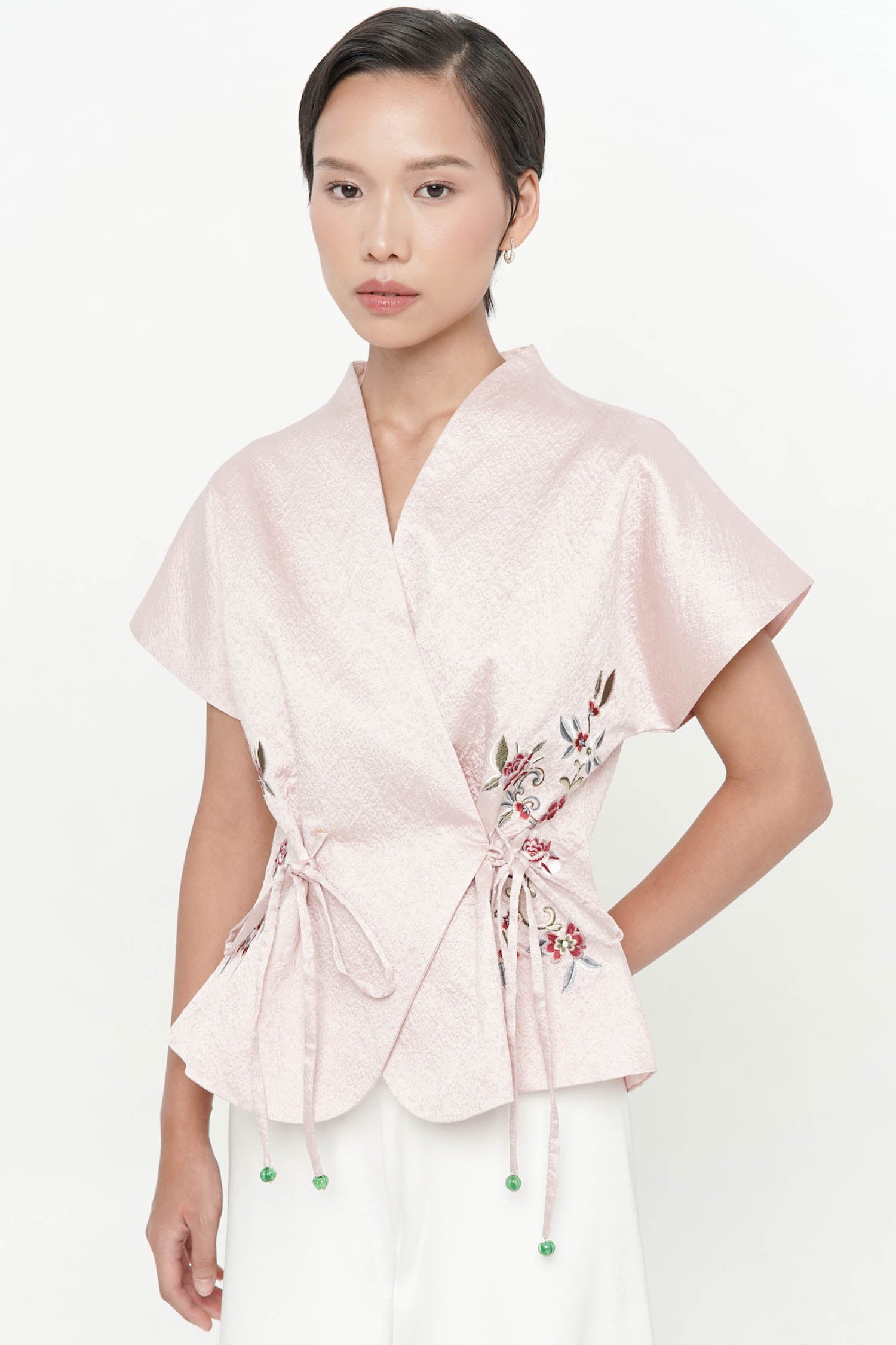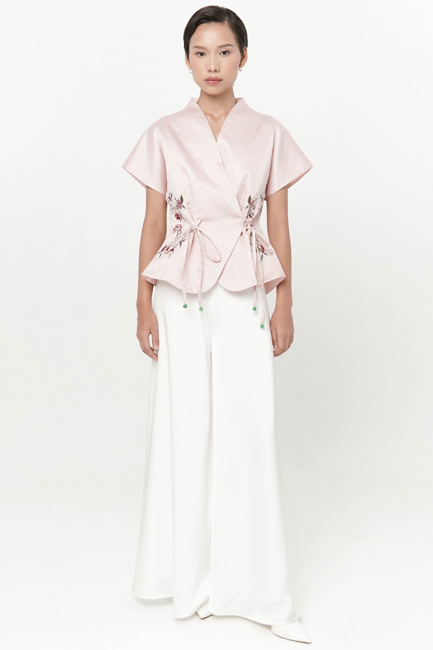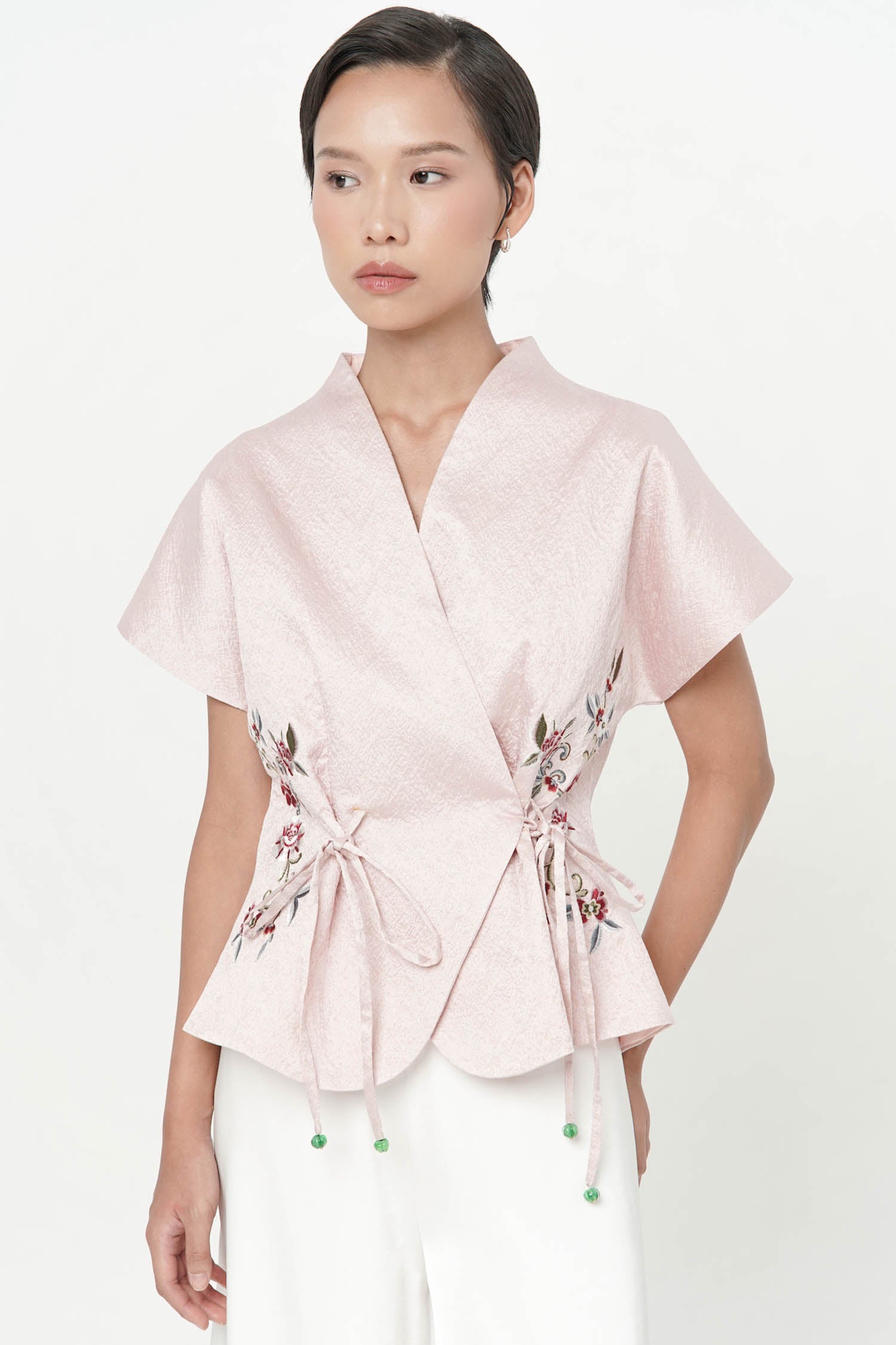 The Wufu Tied Top is an elegant reinterpretation of heritage-inspired silhouettes, crafted from richly textured jacquard that lends depth and quiet luxury to the design. Featuring a refined wrap-inspired front with adjustable side ties, the top is softly sculpted to flatter the waist while allowing graceful movement. Delicate floral embroidery accents the sides, adding a poetic contrast to the clean structure and subtle sheen of the fabric. Finished with a gently flared hem, this piece embodies balance between strength and femininity, making it a sophisticated choice for both festive and refined daytime occasions.