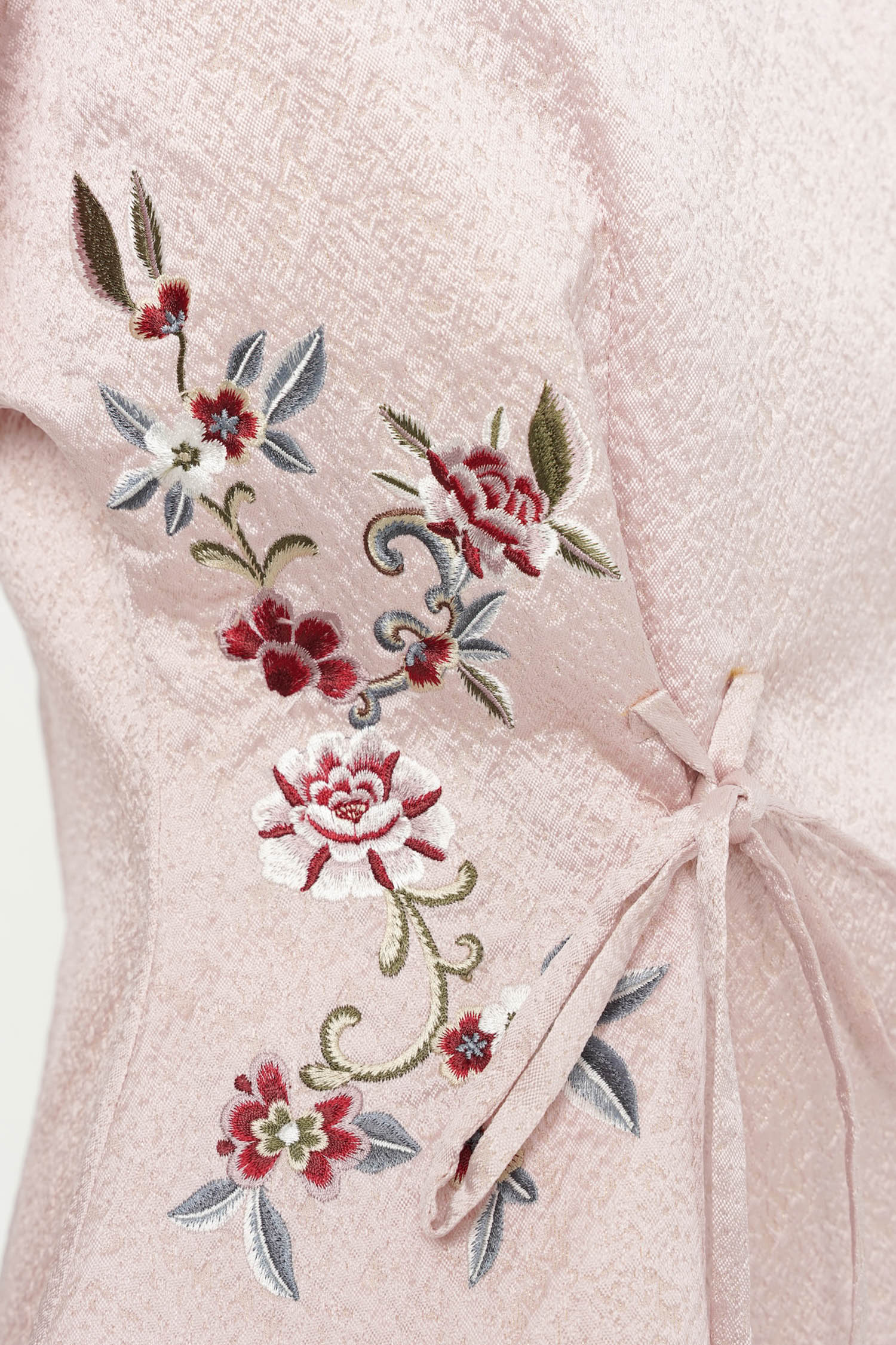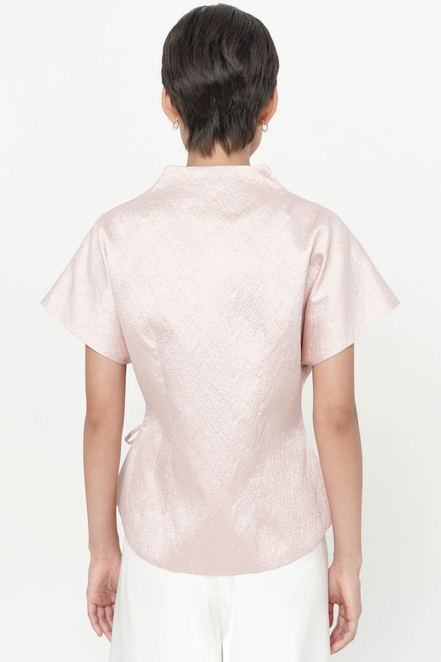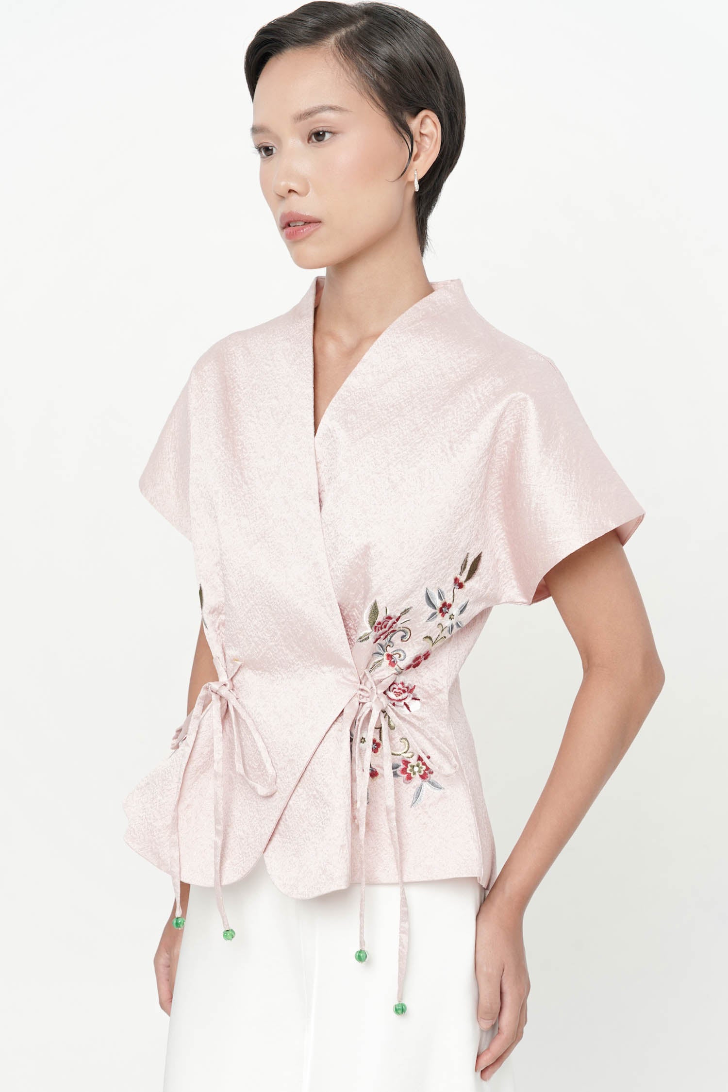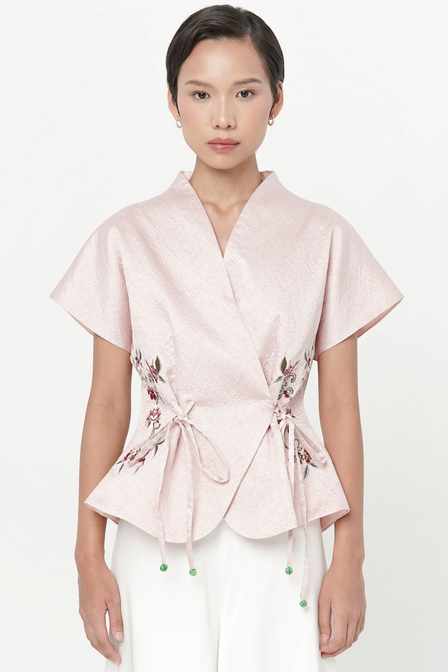 The Wufu Tied Top is an elegant reinterpretation of heritage-inspired silhouettes, crafted from richly textured jacquard that lends depth and quiet luxury to the design. Featuring a refined wrap-inspired front with adjustable side ties, the top is softly sculpted to flatter the waist while allowing graceful movement. Delicate floral embroidery accents the sides, adding a poetic contrast to the clean structure and subtle sheen of the fabric. Finished with a gently flared hem, this piece embodies balance between strength and femininity, making it a sophisticated choice for both festive and refined daytime occasions.