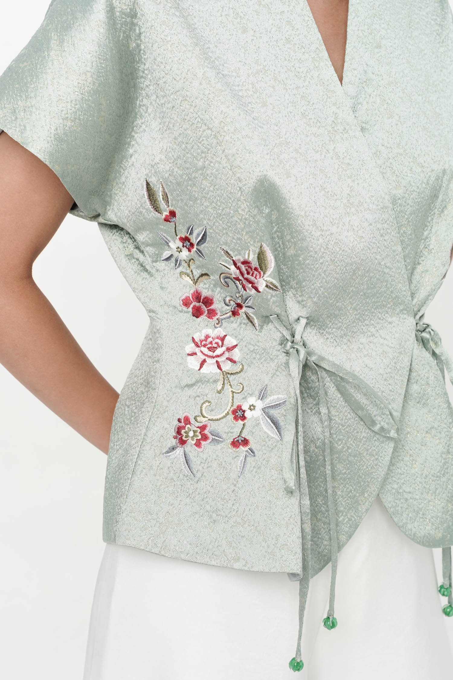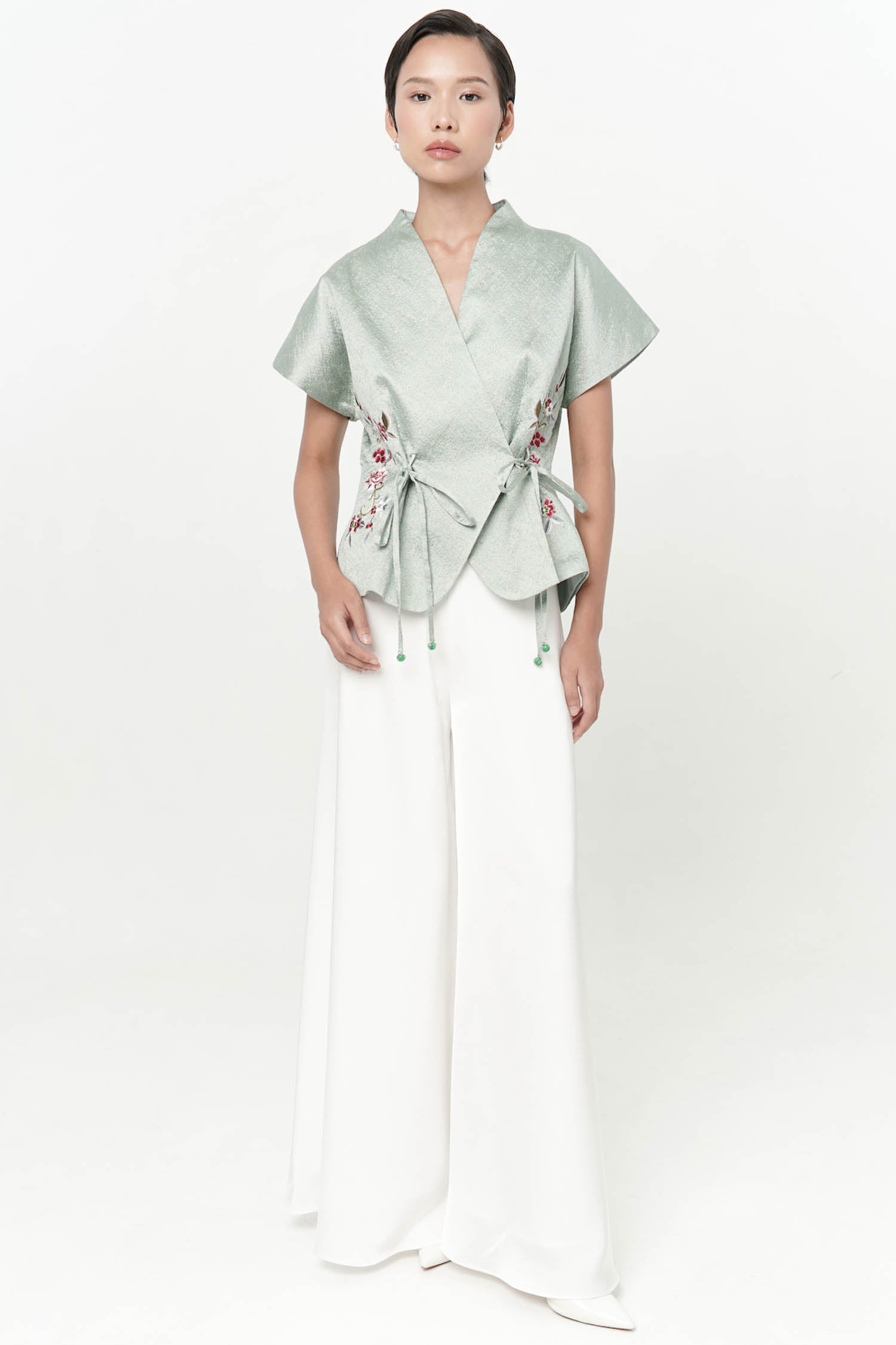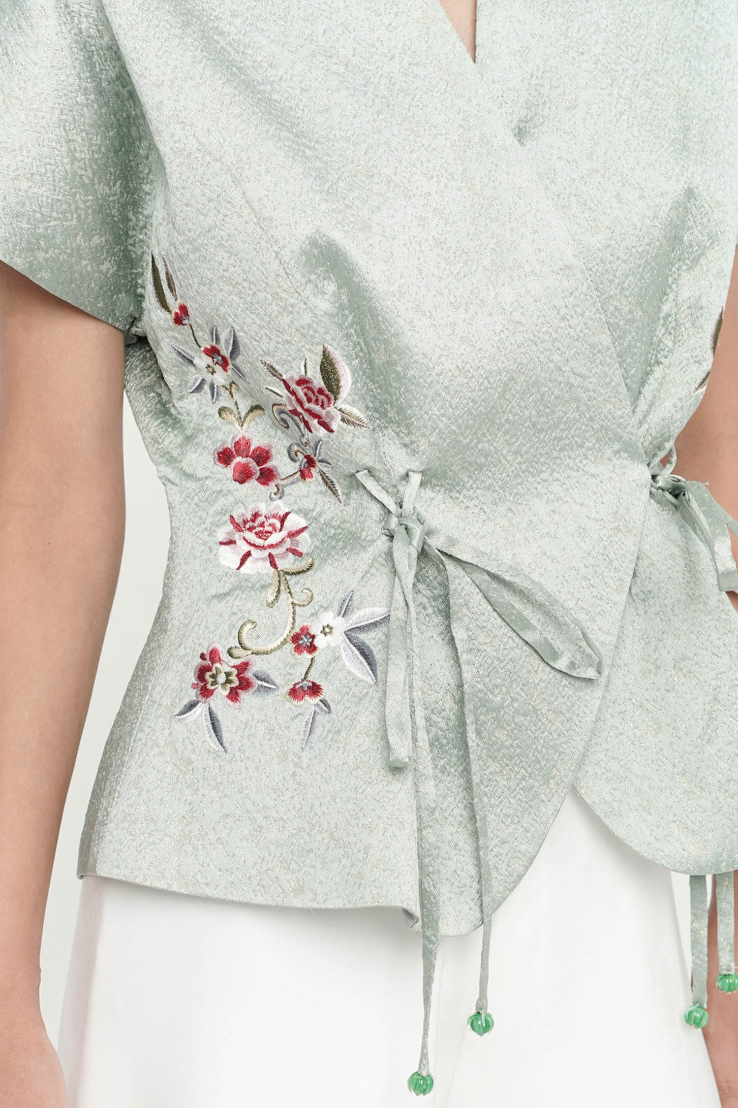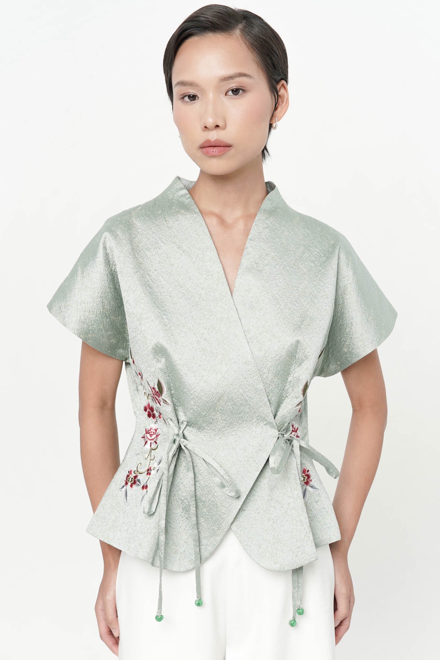 The Wufu Tied Top is an elegant reinterpretation of heritage-inspired silhouettes, crafted from richly textured jacquard that lends depth and quiet luxury to the design. Featuring a refined wrap-inspired front with adjustable side ties, the top is softly sculpted to flatter the waist while allowing graceful movement. Delicate floral embroidery accents the sides, adding a poetic contrast to the clean structure and subtle sheen of the fabric. Finished with a gently flared hem, this piece embodies balance between strength and femininity, making it a sophisticated choice for both festive and refined daytime occasions.