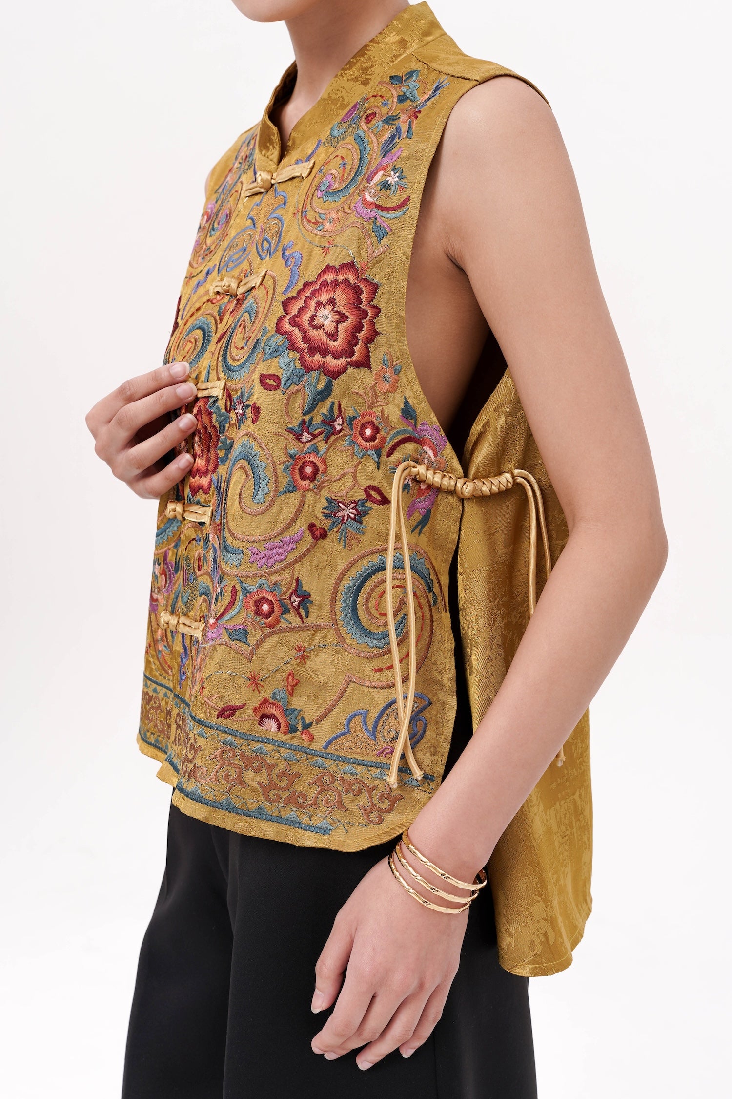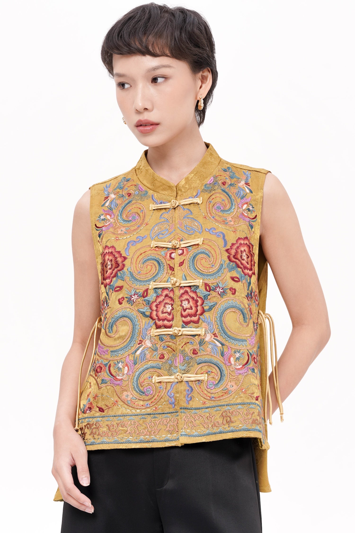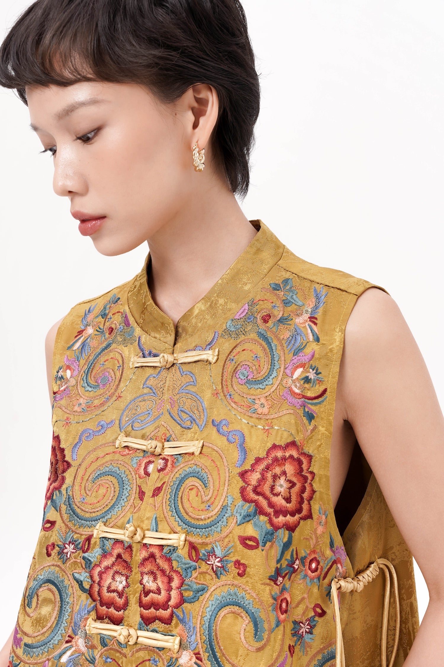 The Yumei Qipao Vest is a striking expression of artisanal elegance, distinguished by its intricate ornamental patterns and refined sleeveless silhouette. Crafted from a luxurious blend of silk and cotton, it offers a graceful balance of soft sheen and breathable comfort, allowing the fabric to drape beautifully with a structured yet fluid finish. Traditional frog-button detailing and a mandarin collar lend cultural depth, while the gently flared cut and side ties create a modern, effortless ease. Available in maroon, dijon, and emerald, this sophisticated piece brings timeless character and elevated charm to both formal occasions and refined everyday styling.