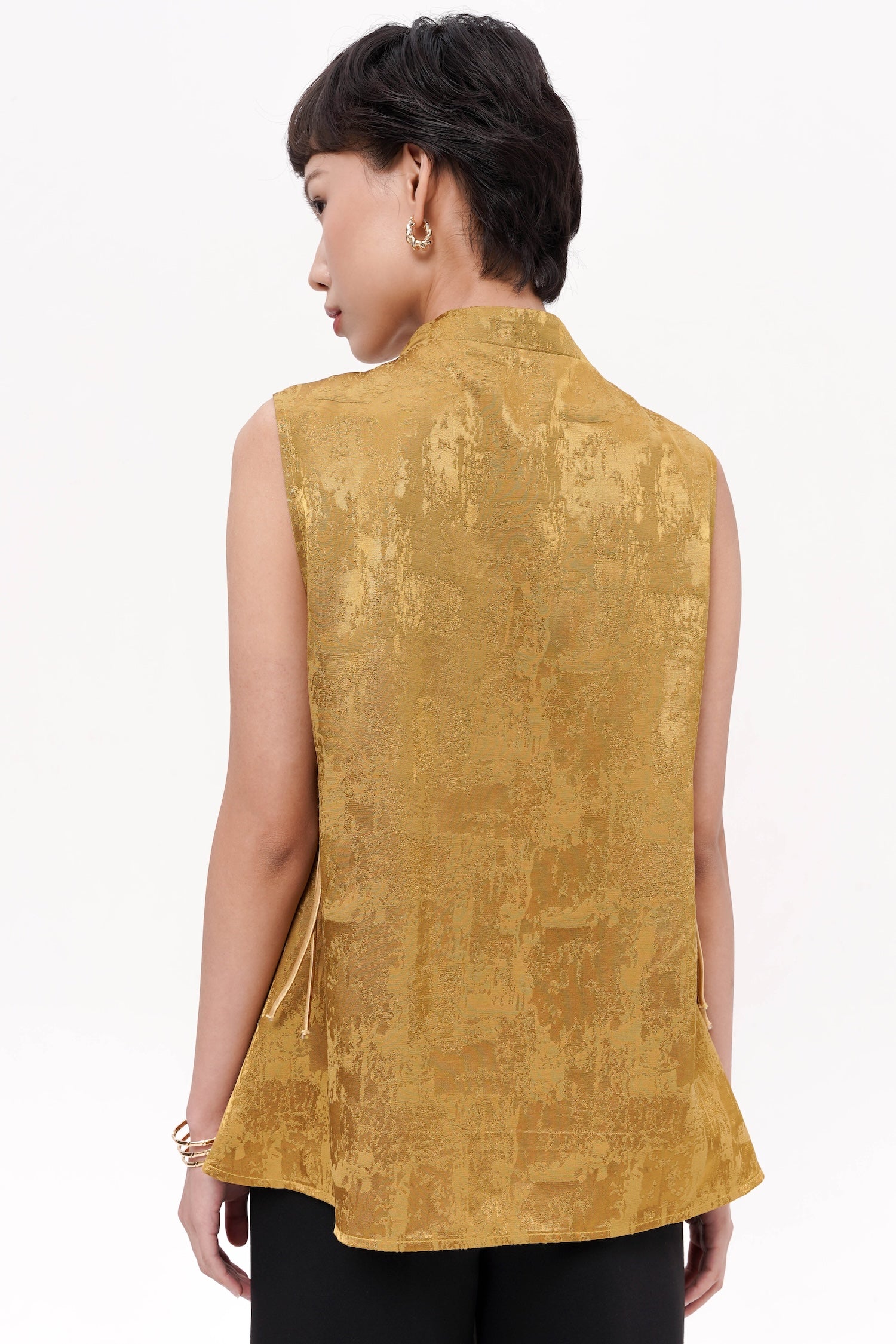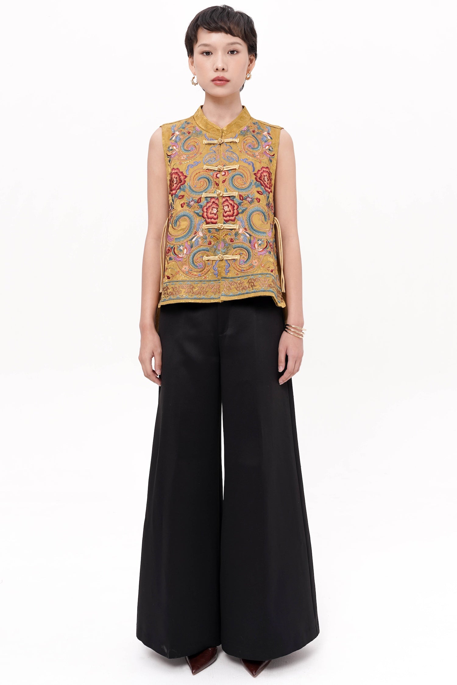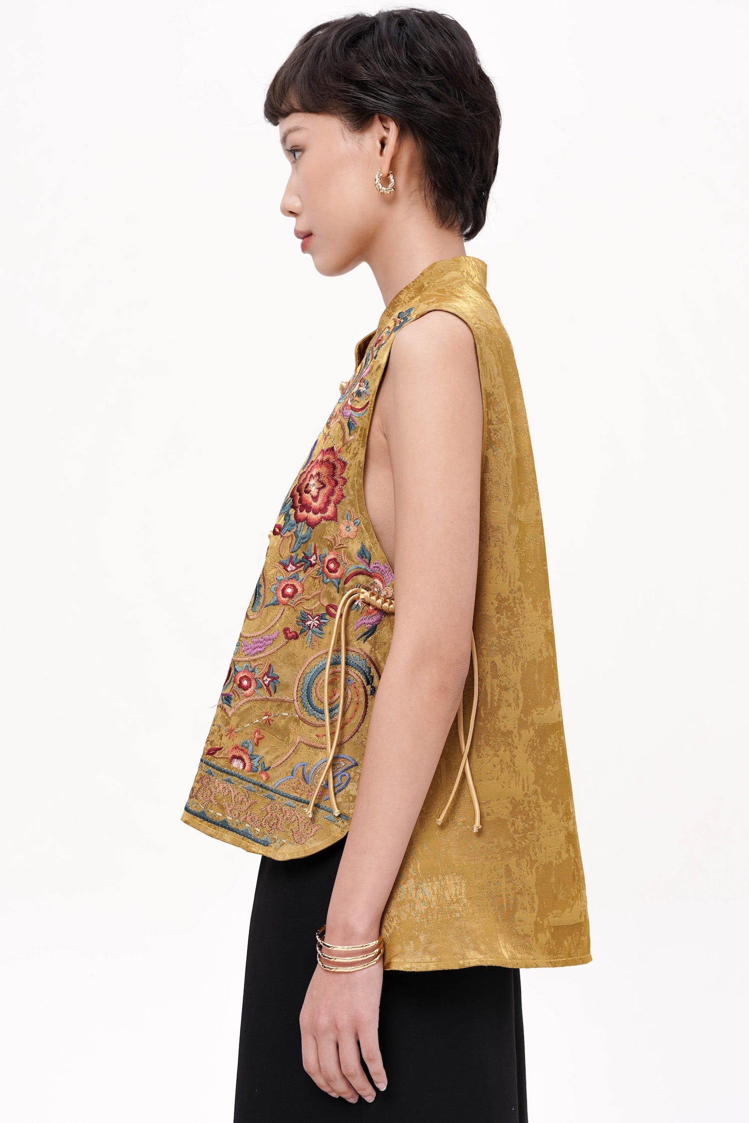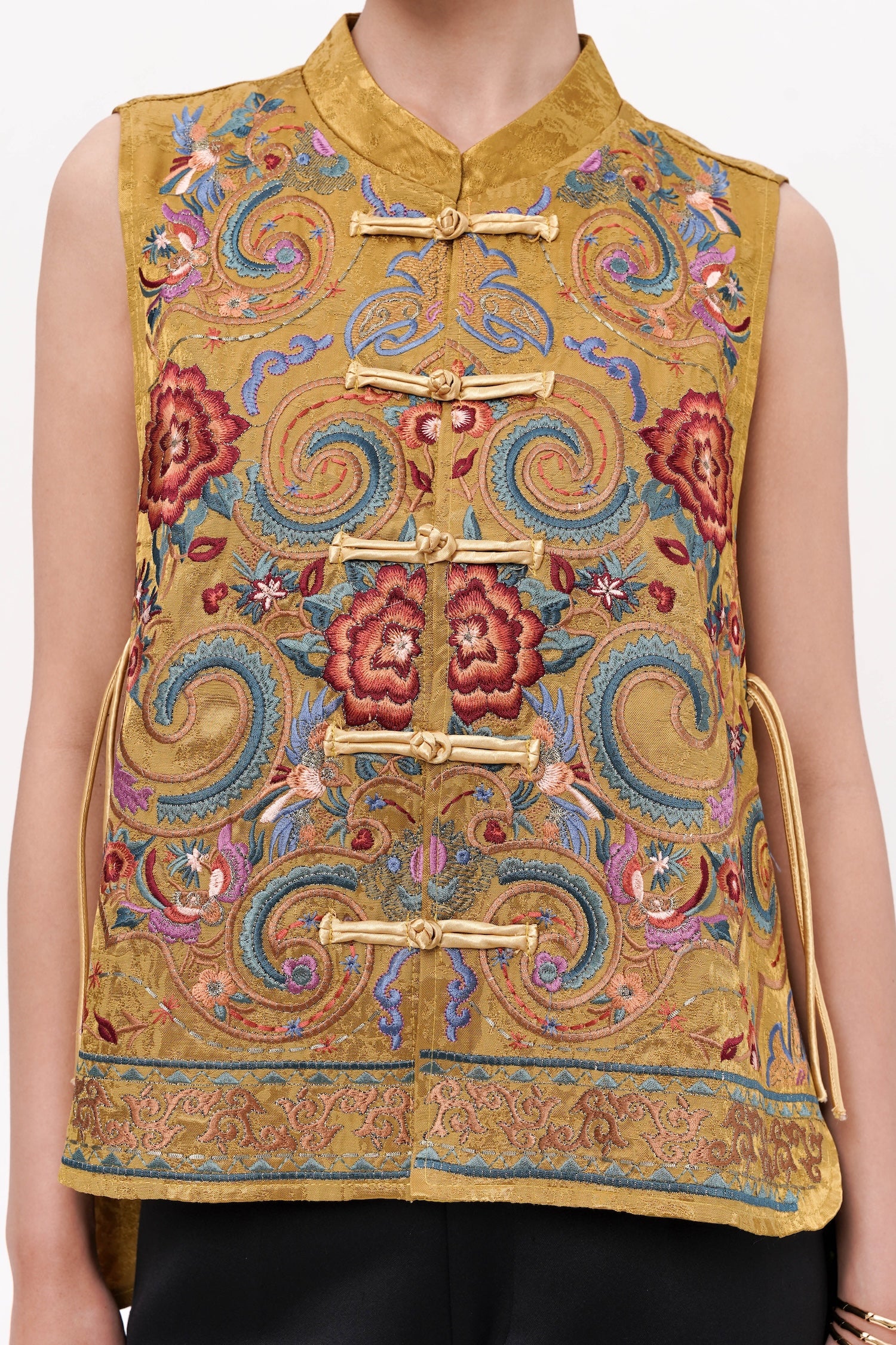 The Yumei Qipao Vest is a striking expression of artisanal elegance, distinguished by its intricate ornamental patterns and refined sleeveless silhouette. Crafted from a luxurious blend of silk and cotton, it offers a graceful balance of soft sheen and breathable comfort, allowing the fabric to drape beautifully with a structured yet fluid finish. Traditional frog-button detailing and a mandarin collar lend cultural depth, while the gently flared cut and side ties create a modern, effortless ease. Available in maroon, dijon, and emerald, this sophisticated piece brings timeless character and elevated charm to both formal occasions and refined everyday styling.