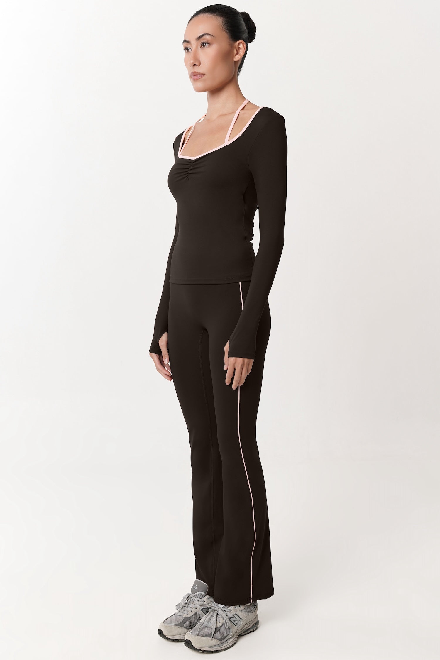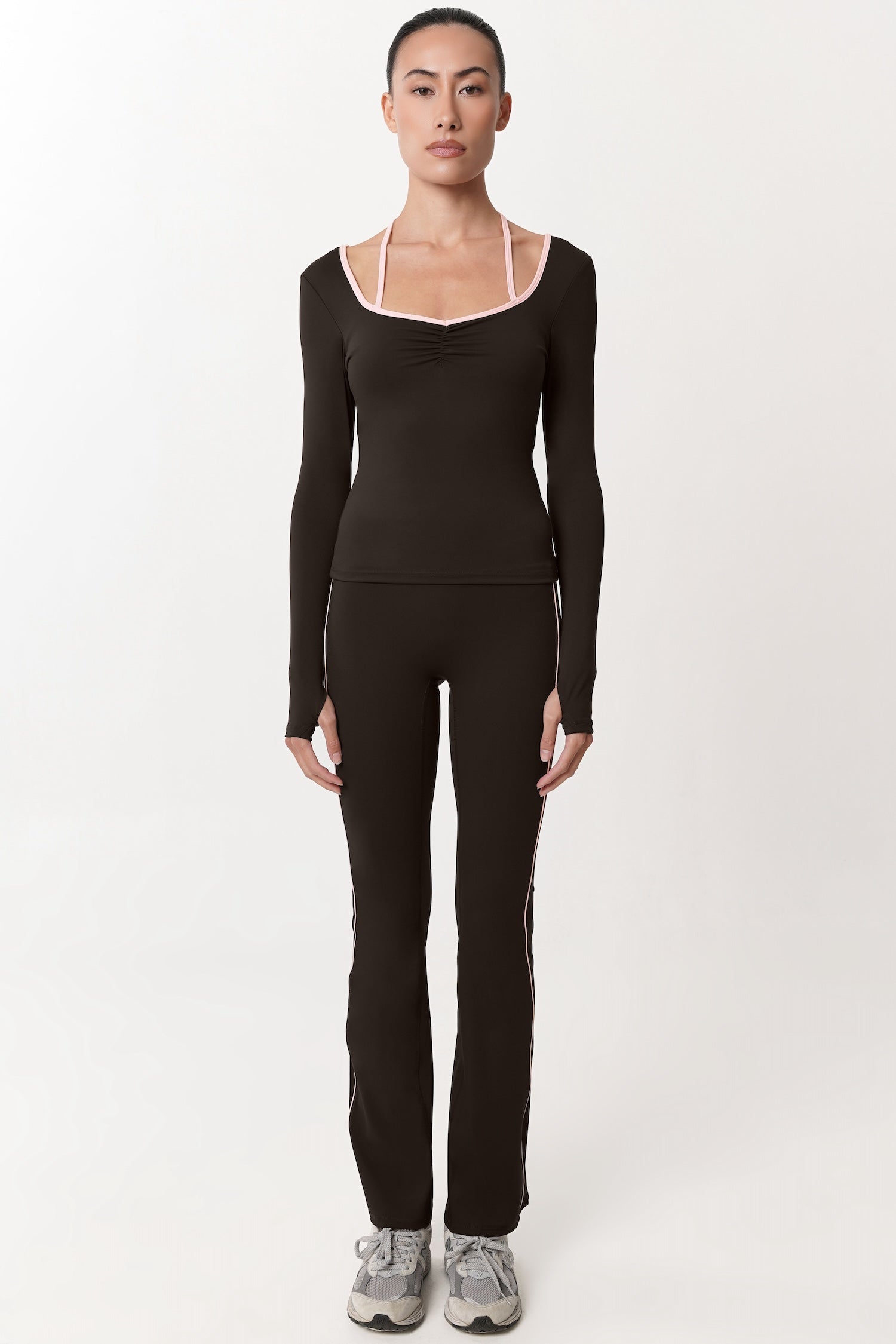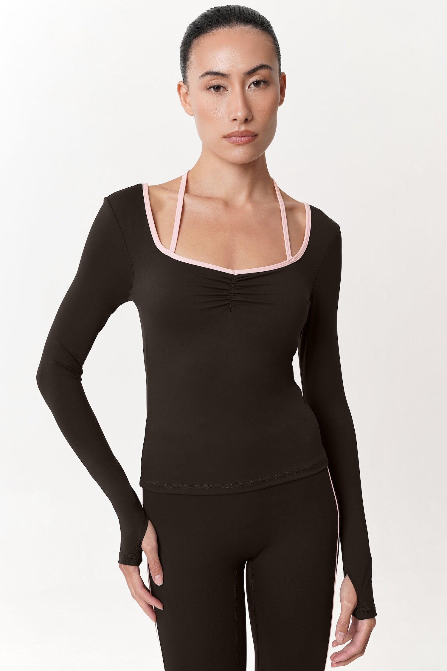 Thoughtfully made to flatter with subtle detail, this Allegro Longsleeve Bra Top features a square heart–inspired neckline that softly frames the neckline and shoulders. Gentle ruching at the bust enhances shape for a naturally fuller look, adding dimension without feeling overdone. Finished with a halter-style tie detail, it brings a delicate statement while keeping the silhouette balanced and refined. Complete with removable bra padding for adjustable support, this piece blends femininity and comfort — perfect for styled looks that still feel effortless, from day to night.